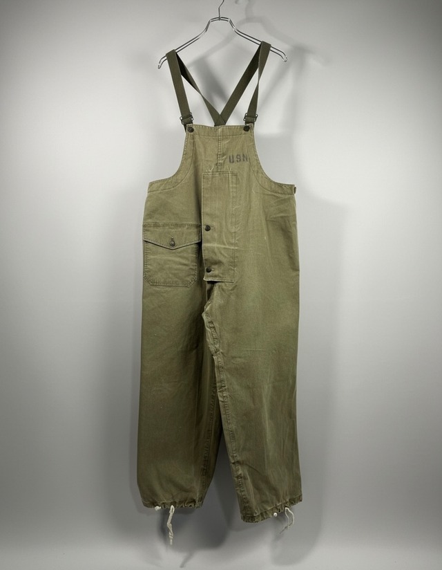 第二次世界大戦期、アメリカ海軍に防寒作業用として採用・支給されていたN-1デッキパンツ。 雨や雪、冷たい寒風に晒される過酷な甲板作業を想定し、実用性を最優先に設計された一本です。 屈指の人気を誇るN-1デッキジャケットの対となる存在で、ジャケット同様に欠かせない重要なピース。 表地には高密度コットンのジャングルクロスを使用し、防風性・耐久性ともに優れた当時最高峰クラスの素材を採用しています。 細畝のある生地感はしなやかで、動きやすさも考慮された設計です。 裏地は総裏ウールライニング仕様で保温性は抜群。 ステンシルも非常に雰囲気があり、 サスペンダー仕様や裾のドローコードなど、実用から生まれた無骨なディテールも魅力の一本です。 Condition - 裏地のウールライニングに穴あきが見受けられます。 また、裾部分には破れやダメージがあり、ドローコード周辺にも生地の劣化が確認できます。 表地全体に強い褪色、アタリ、小傷、汚れが見られる状態です。 なお、サスペンダー金具や各部フック、ボタン類は問題なく稼働しており、 着用や調整に支障はありません。 コンディションは決して良好とは言えませんが、実際に使用されてきた実物ならではの風合いや迫力を重視される方には、非常に魅力的な一着かと思います。 Size - Medium ウエスト 約110cm / 股下 約73cm / わたり幅 約36cm / 裾幅 約21cm *ウエストは胸当て下端部分を基準に、平置きで計測しております。 *多少の誤差はご了承下さい。