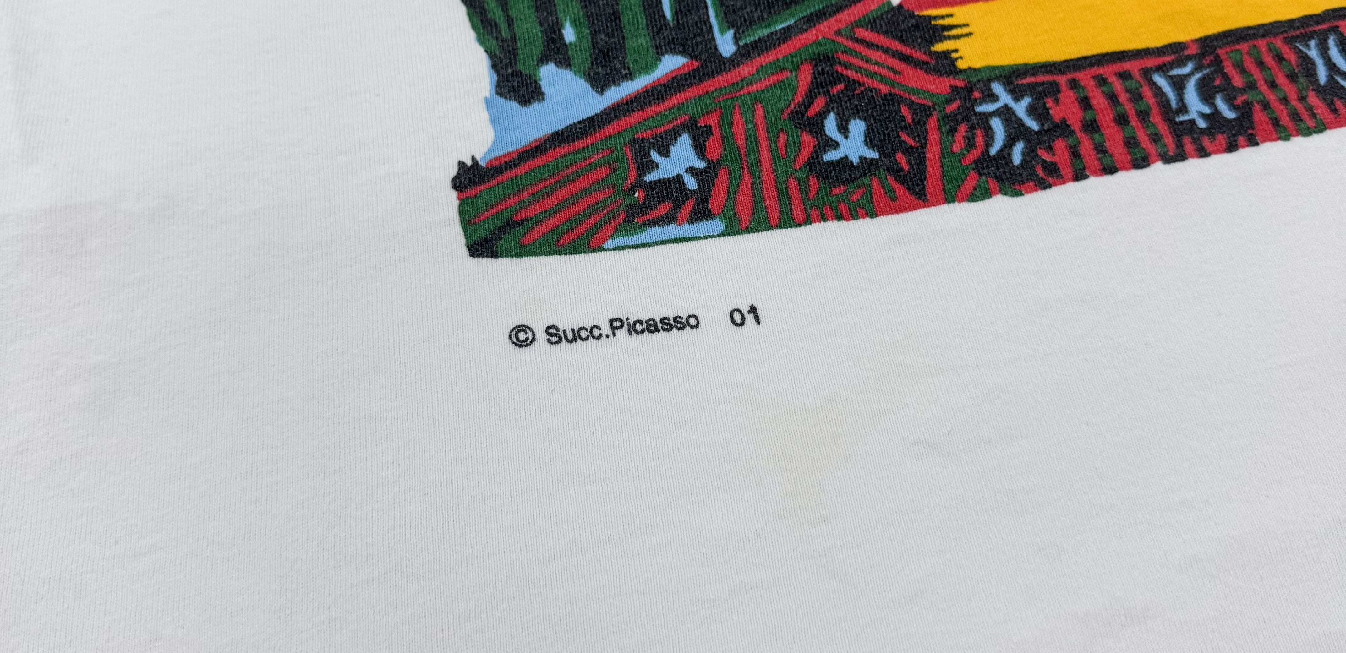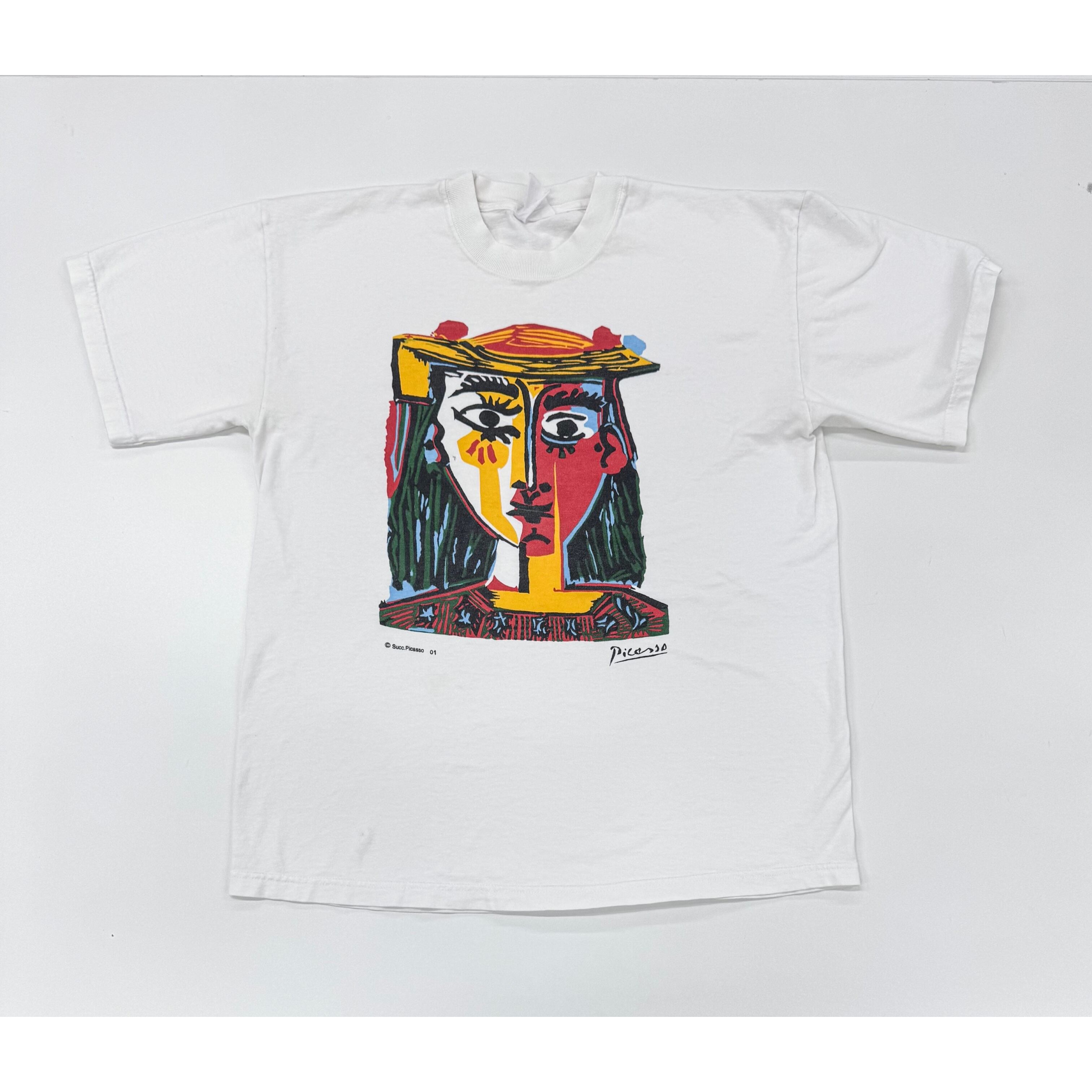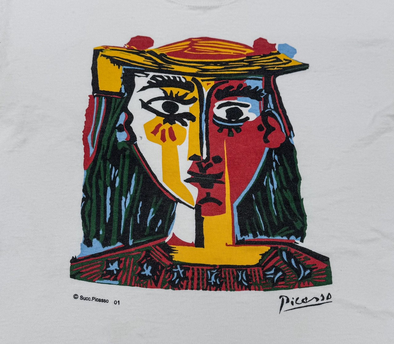 2001年製、Succession Picasso公式ライセンスのアートTシャツ。フロントにはピカソが晩年多く描いたキュビズム肖像の中でも、特に人気の高い「黄色い帽子の女」を彷彿とさせる大胆なグラフィック。色使い・構図ともに、ピカソらしい抽象美が際立つ1枚です。ボディはスペイン製になります。