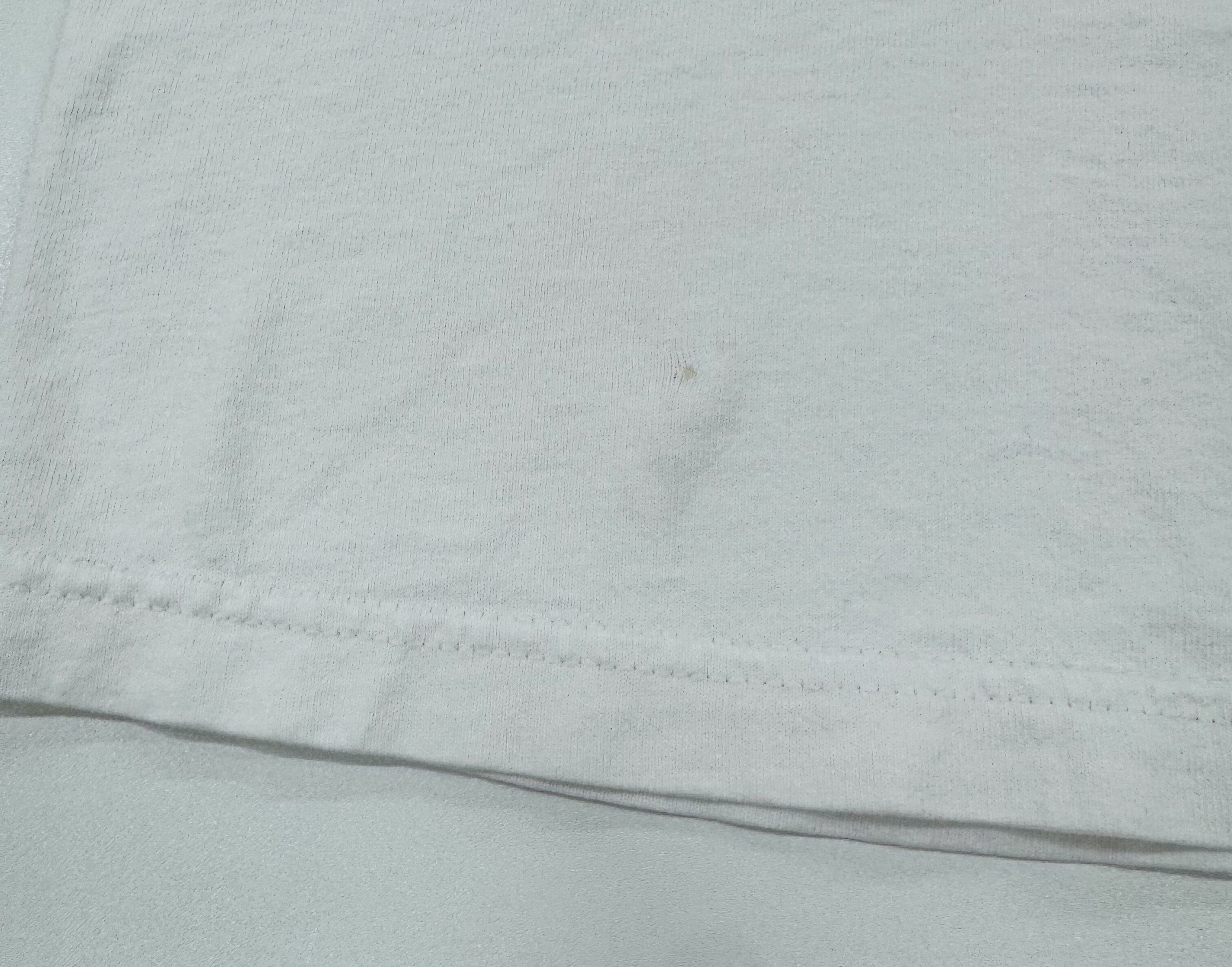 前側の右裾付近にうっすら汚れあり。フロントプリント部分に穴が見られます。いずれも着用には大きく影響しない程度ですが、古着慣れされている方におすすめです。