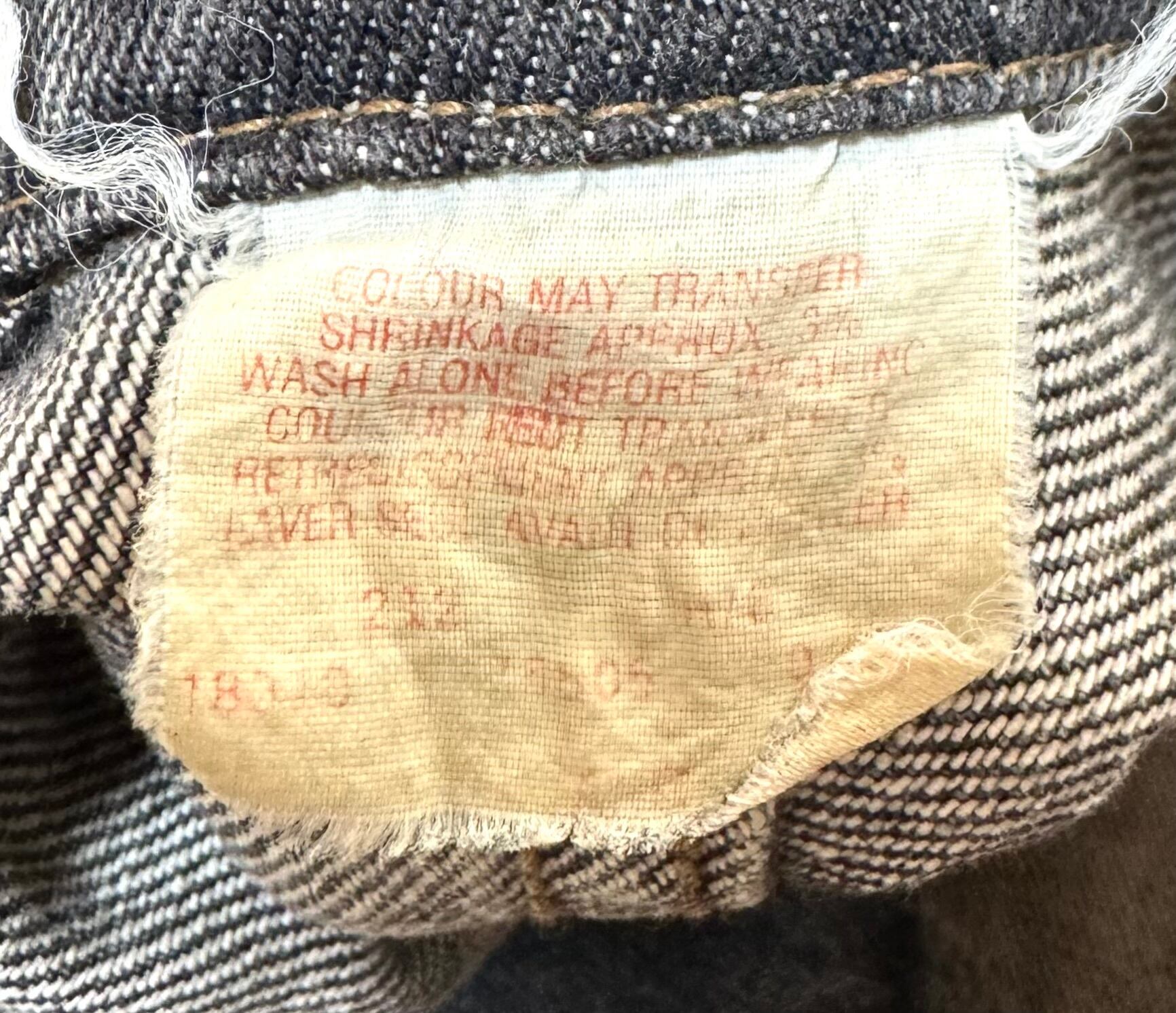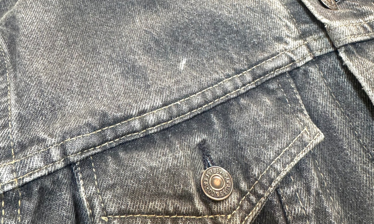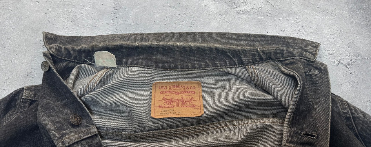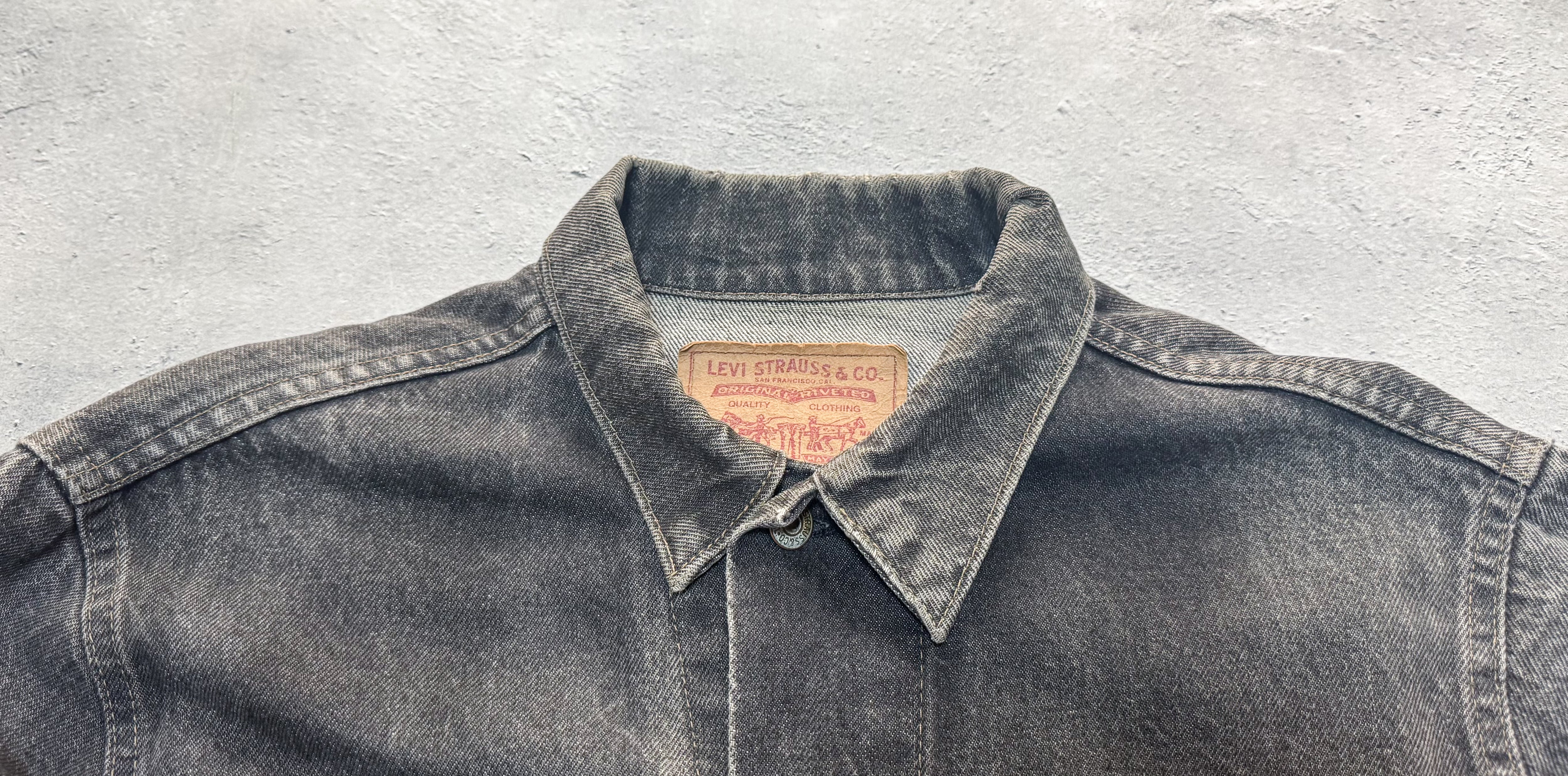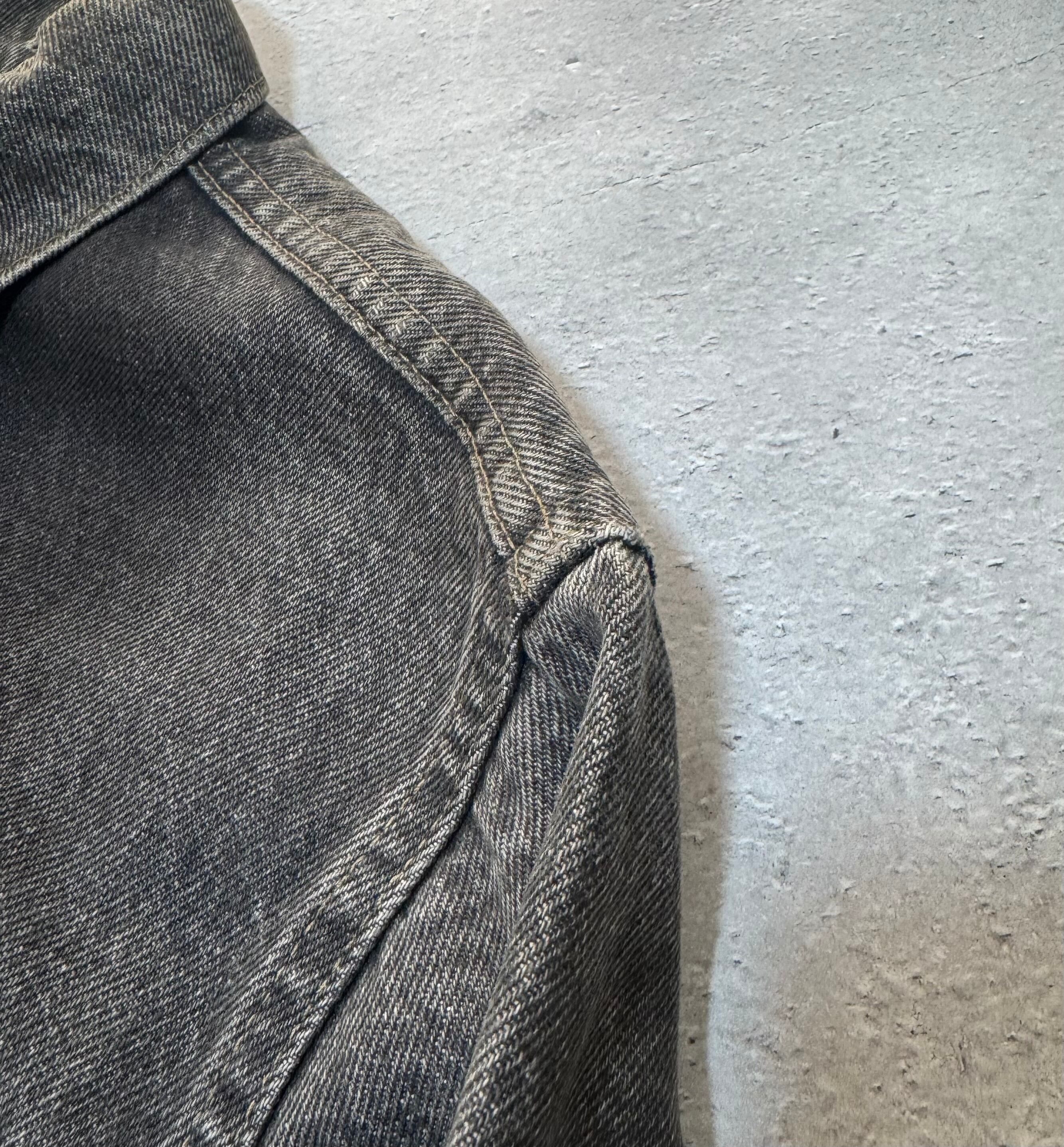 70505をベースにした75505、こちらはカナダ製のみ存在する希少モデル。フェードした雰囲気の良い先染めブラックデニムの80年代製で、46のビッグサイズ。