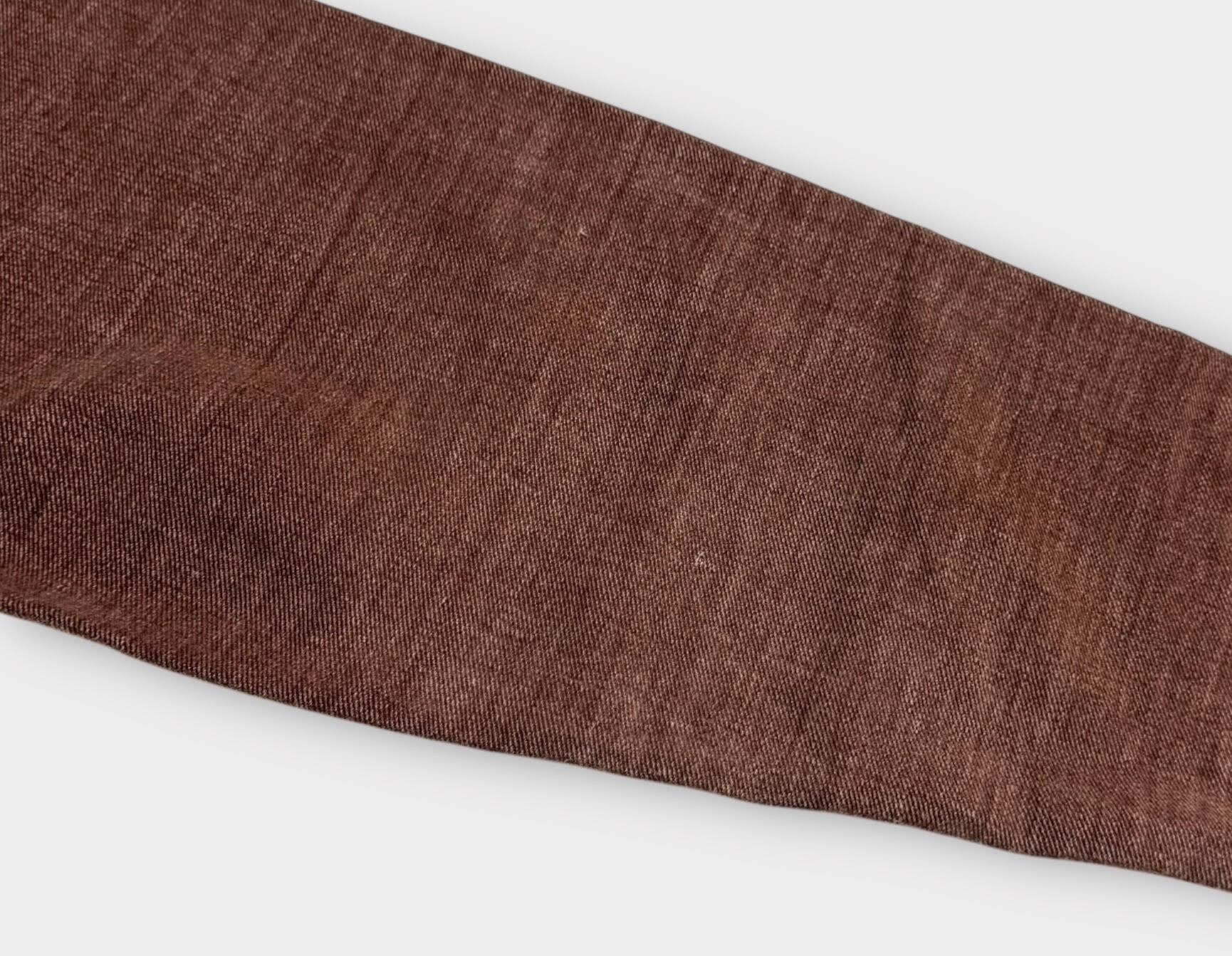 色味は赤みのあるブラウン系カラー。杢調の糸によって陰影が生まれ、見る角度によって表情が変わるのも魅力のひとつ。落ち着いた色味ながら、他のアイテムと組み合わせることでしっかりと存在感を発揮してくれます。