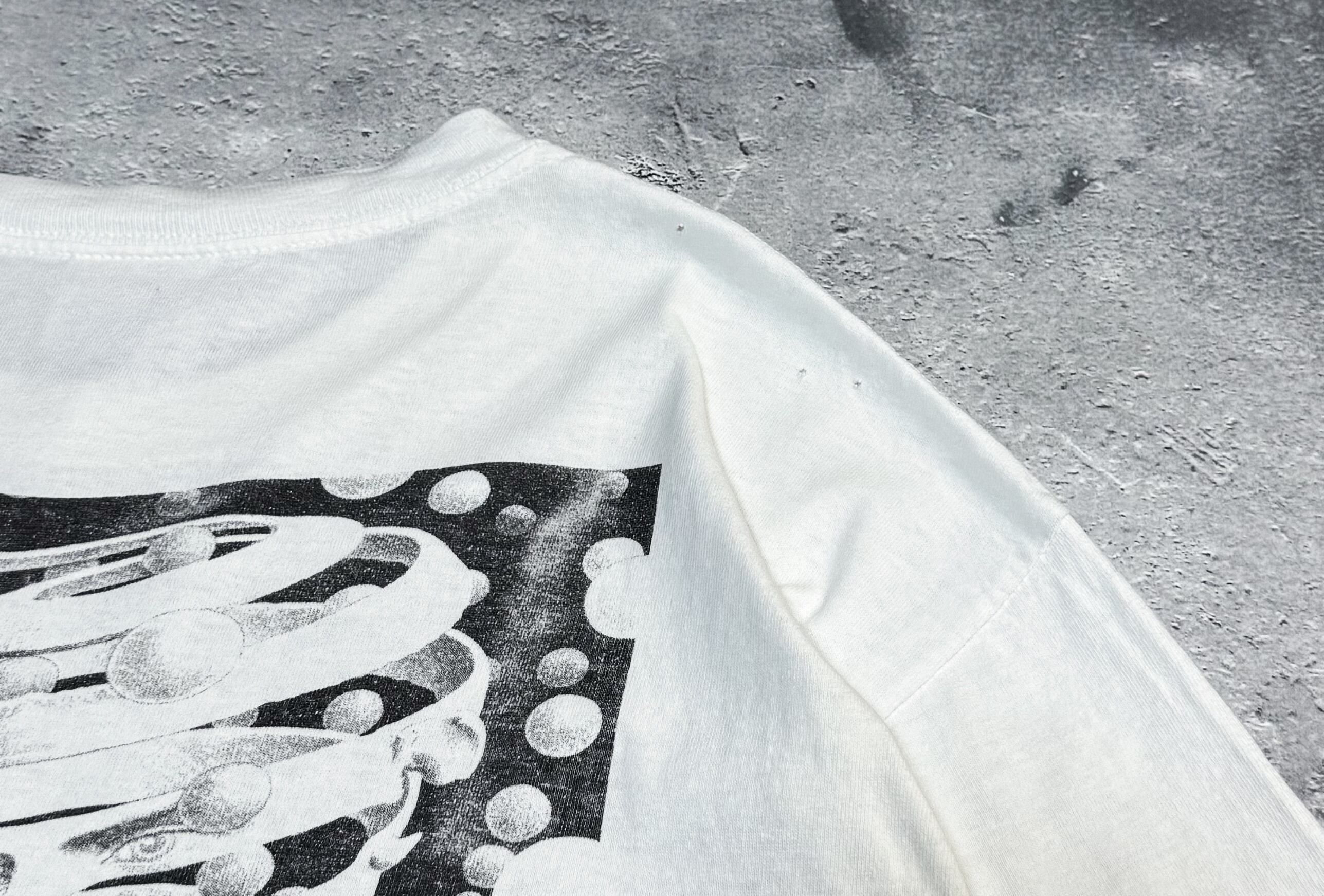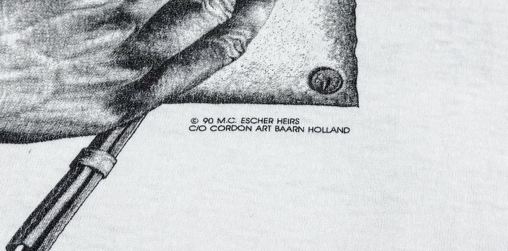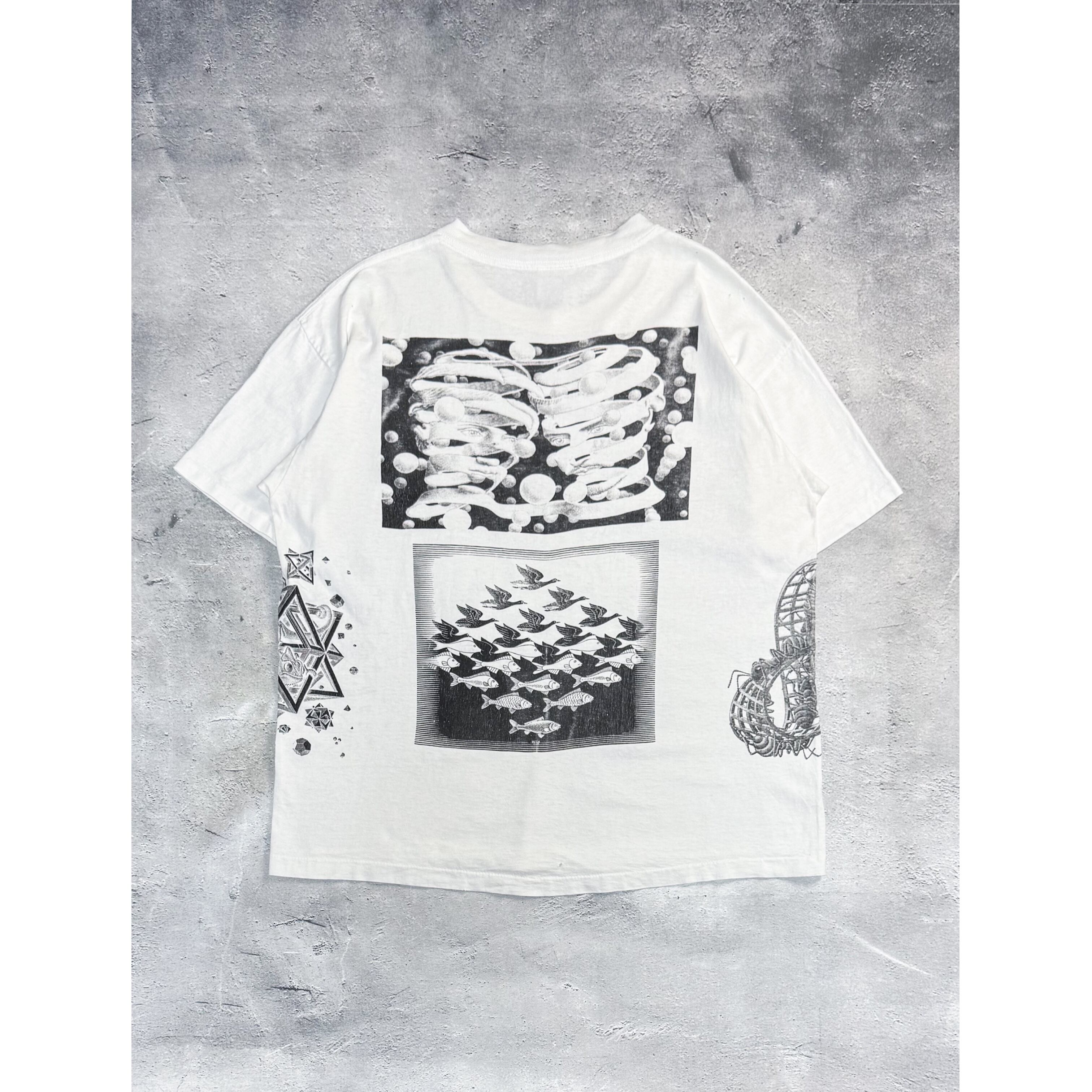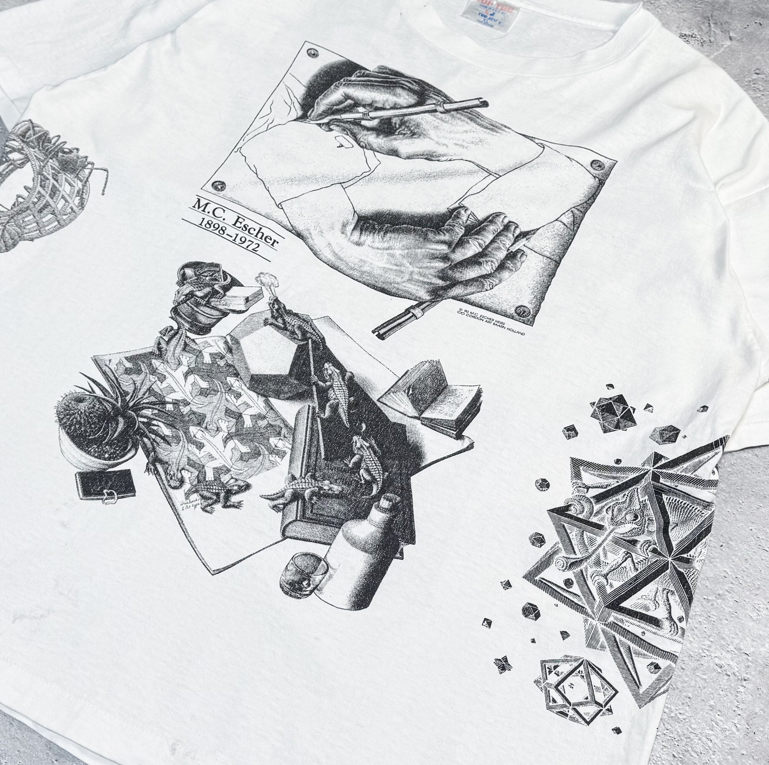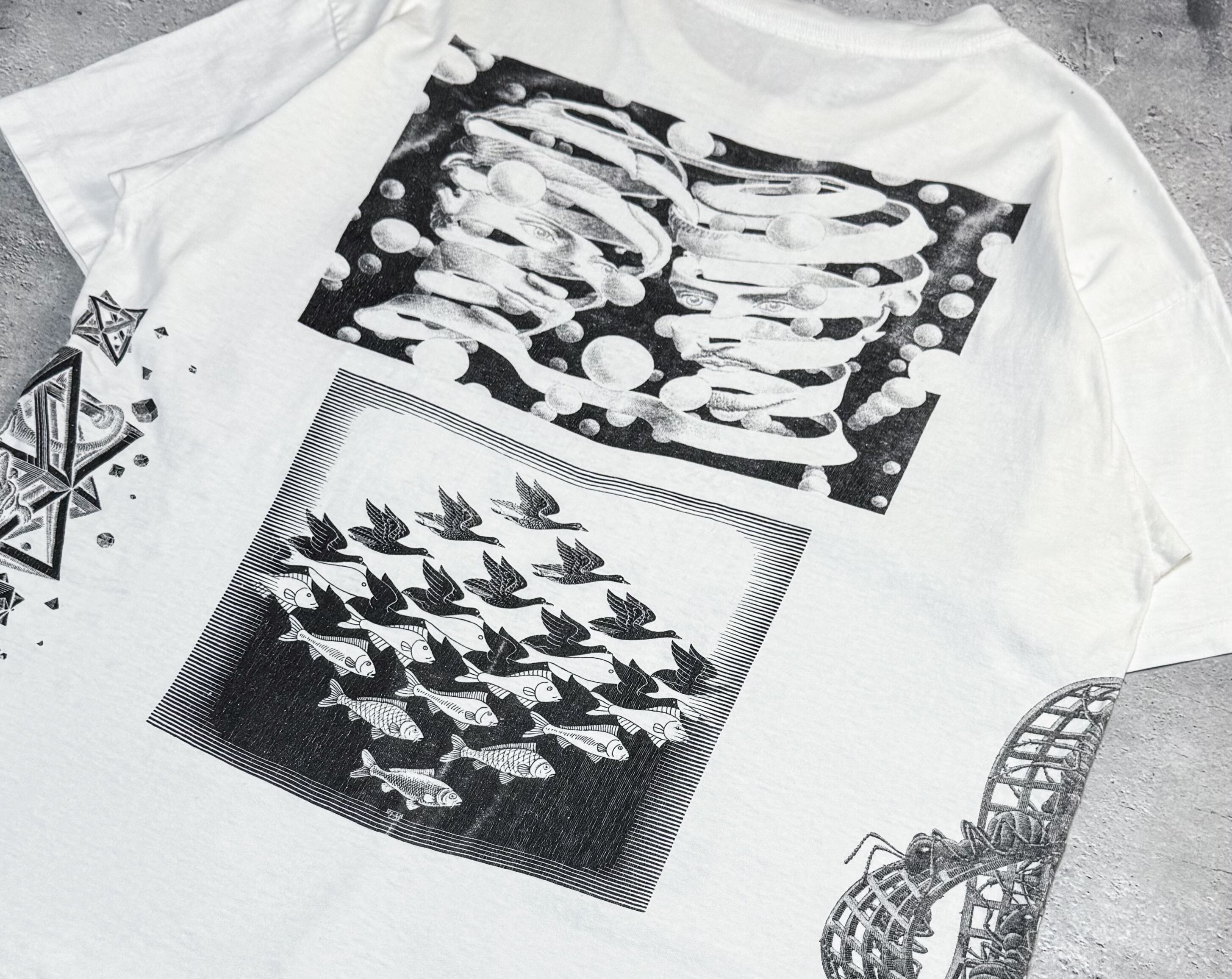オランダの版画家、M.C. Escher(エッシャー)の作品を前面・背面にまで大胆にプリントしたアートTシャツ。代表作「Drawing Hands(描く手)」を中心に、「Reptiles」「Metamorphosis」「Sky and Water」などの代表的な作品がコラージュされた、アートファン垂涎の1枚です。