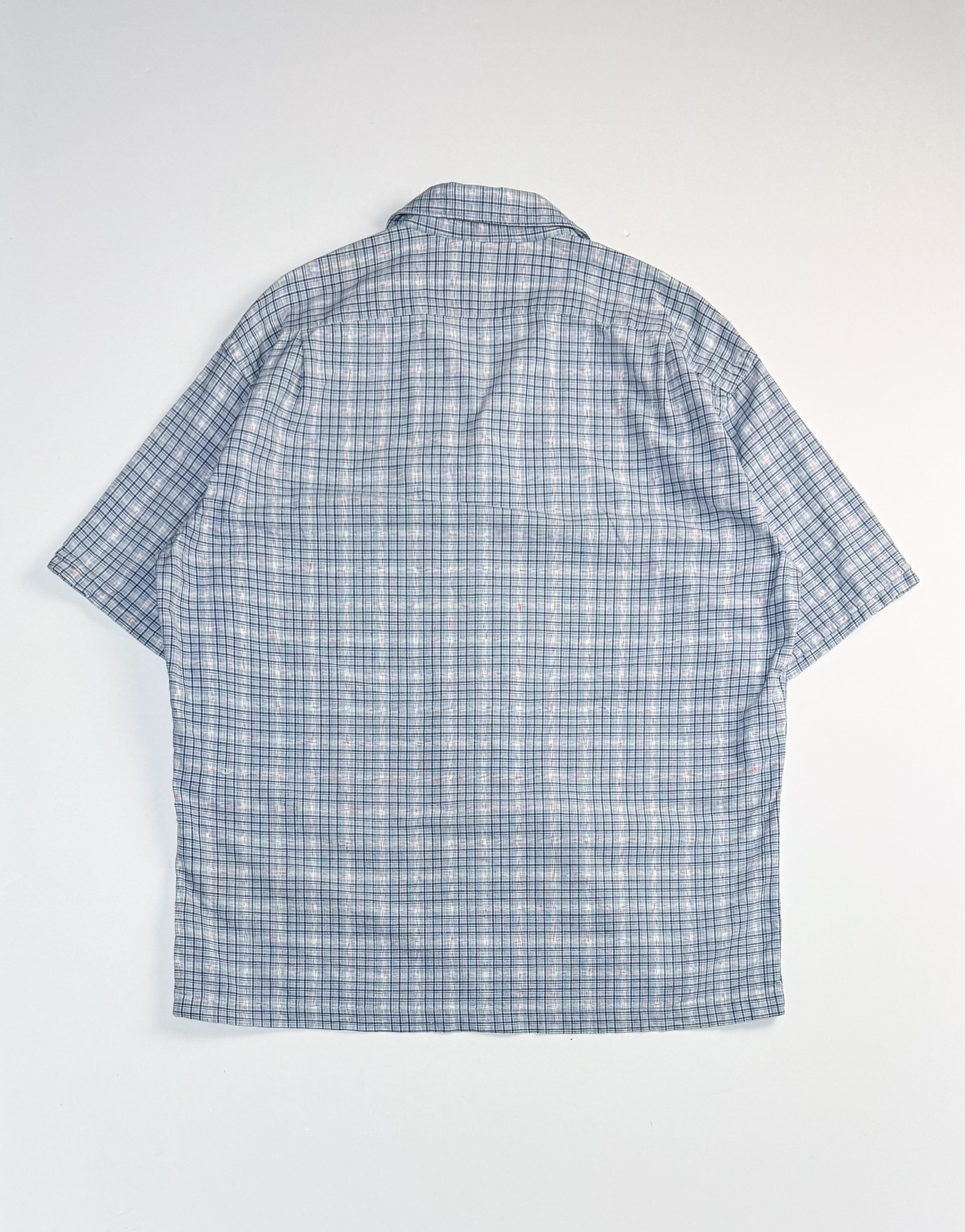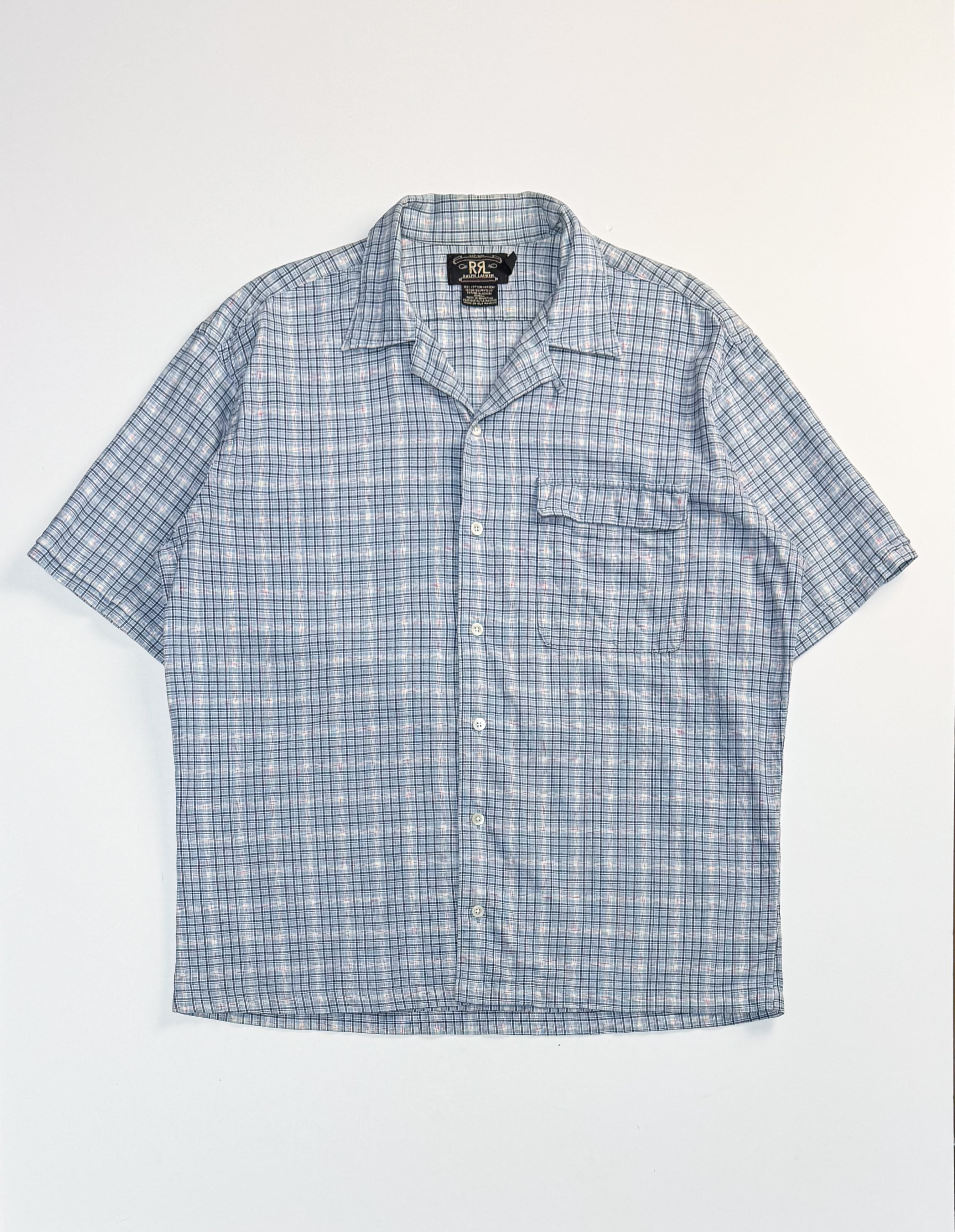90年代製、RRL(ダブルアールエル)の三ツ星タグ付きマドラスチェックのオープンカラーシャツ。