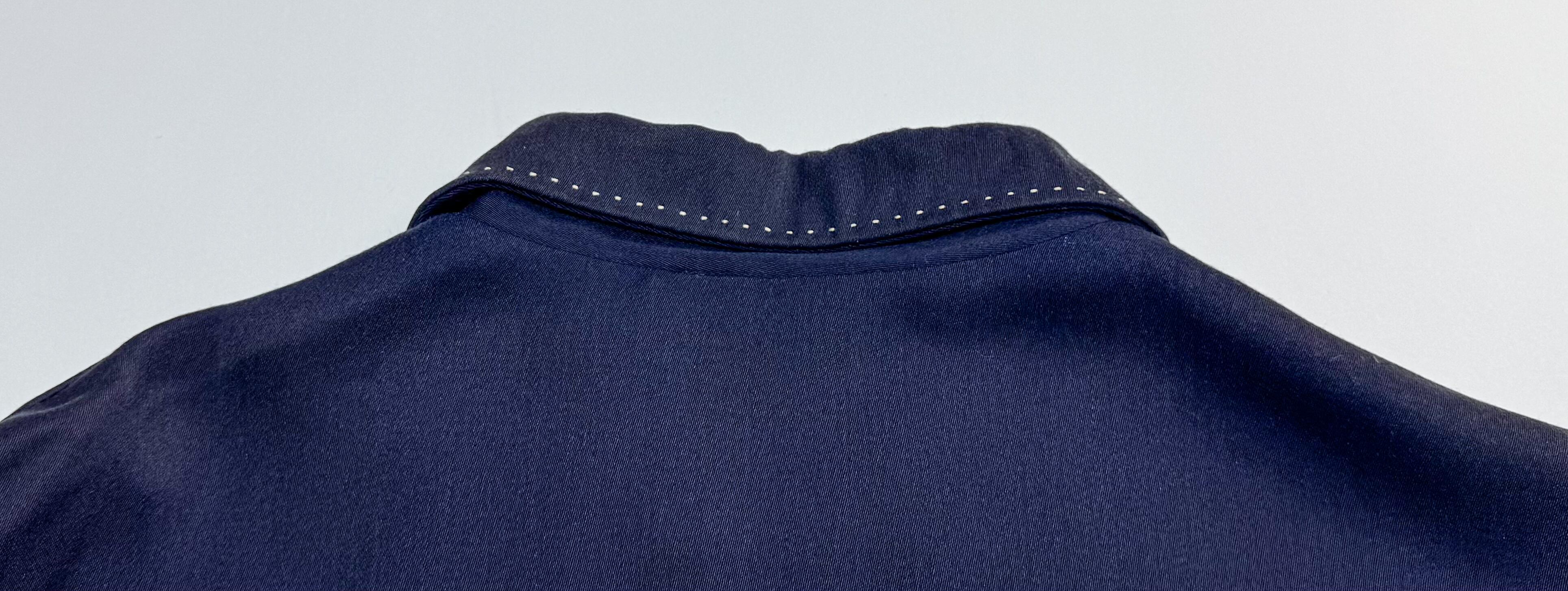 スウィングトップ型の王道スタイルで、ギャバジン特有の上品な光沢とドレープ感が美しい一着です。