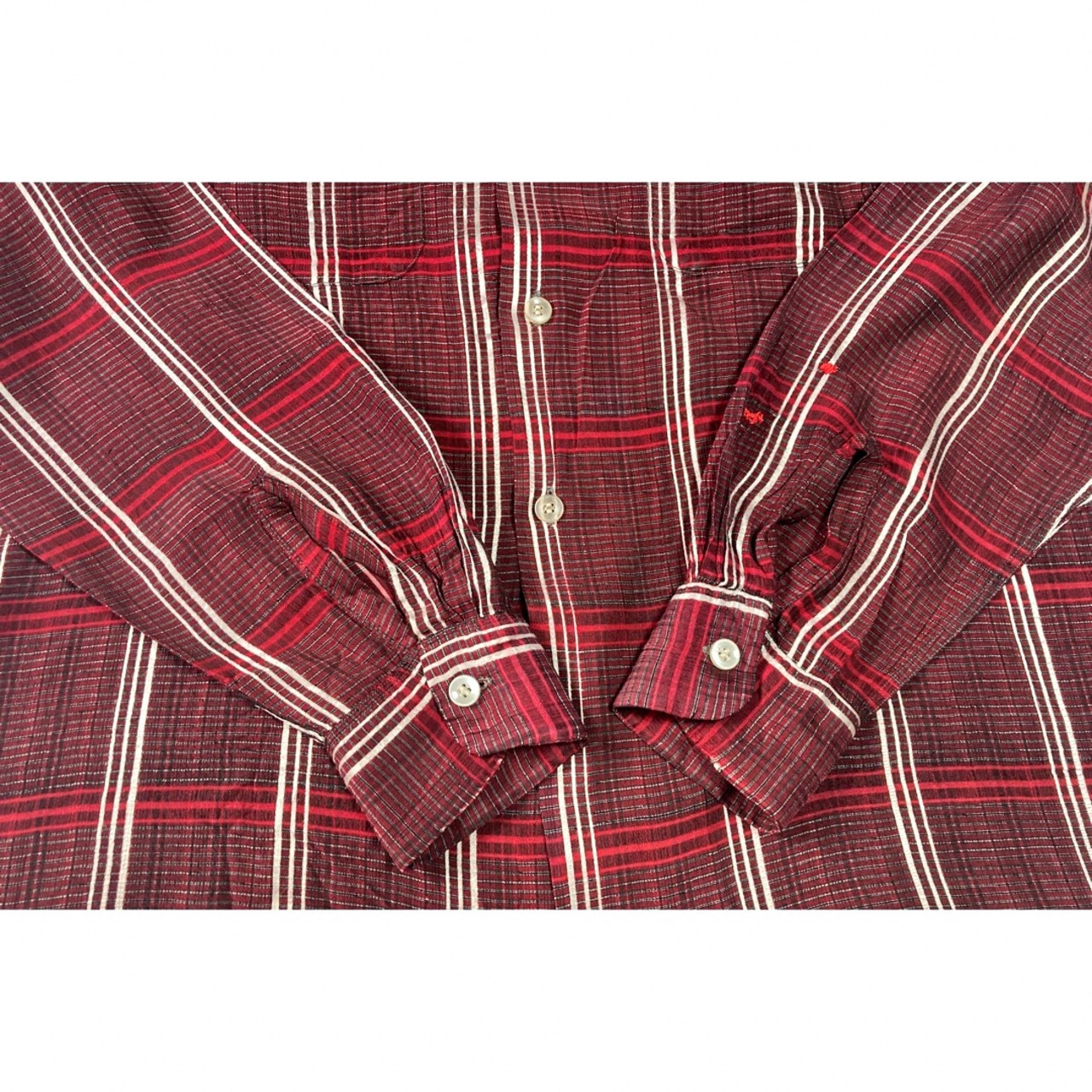 光沢感のあるレーヨン系生地に、深みのあるバーガンディ×シャドープレイドの配色が映える一枚です。