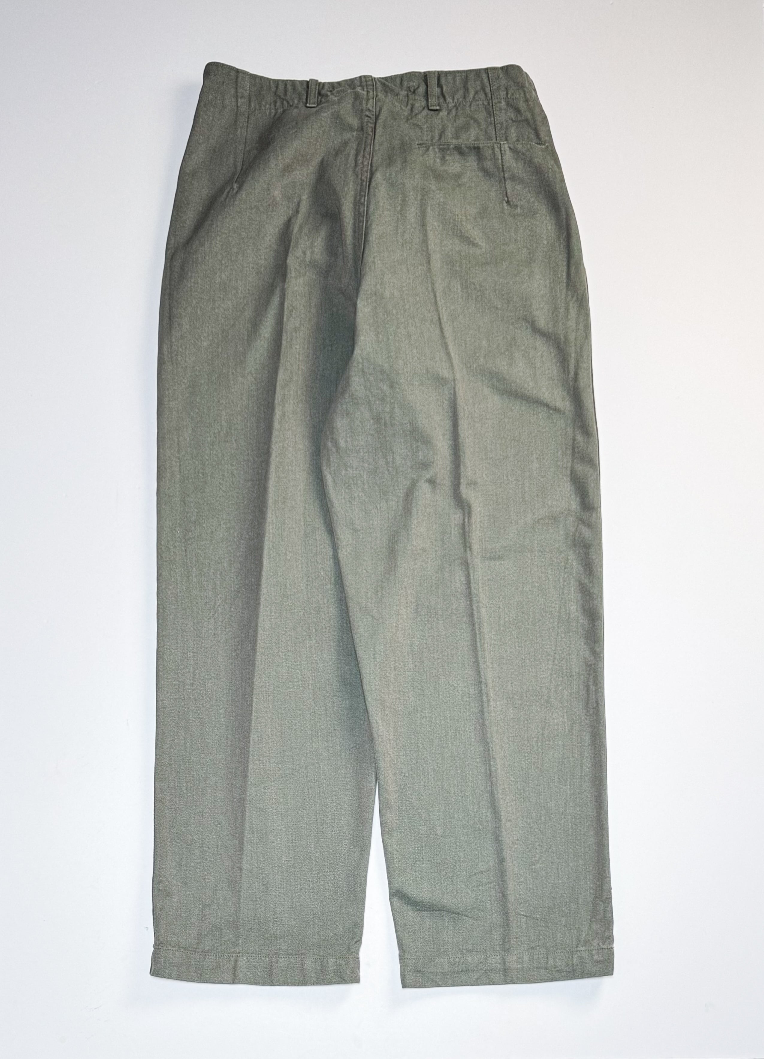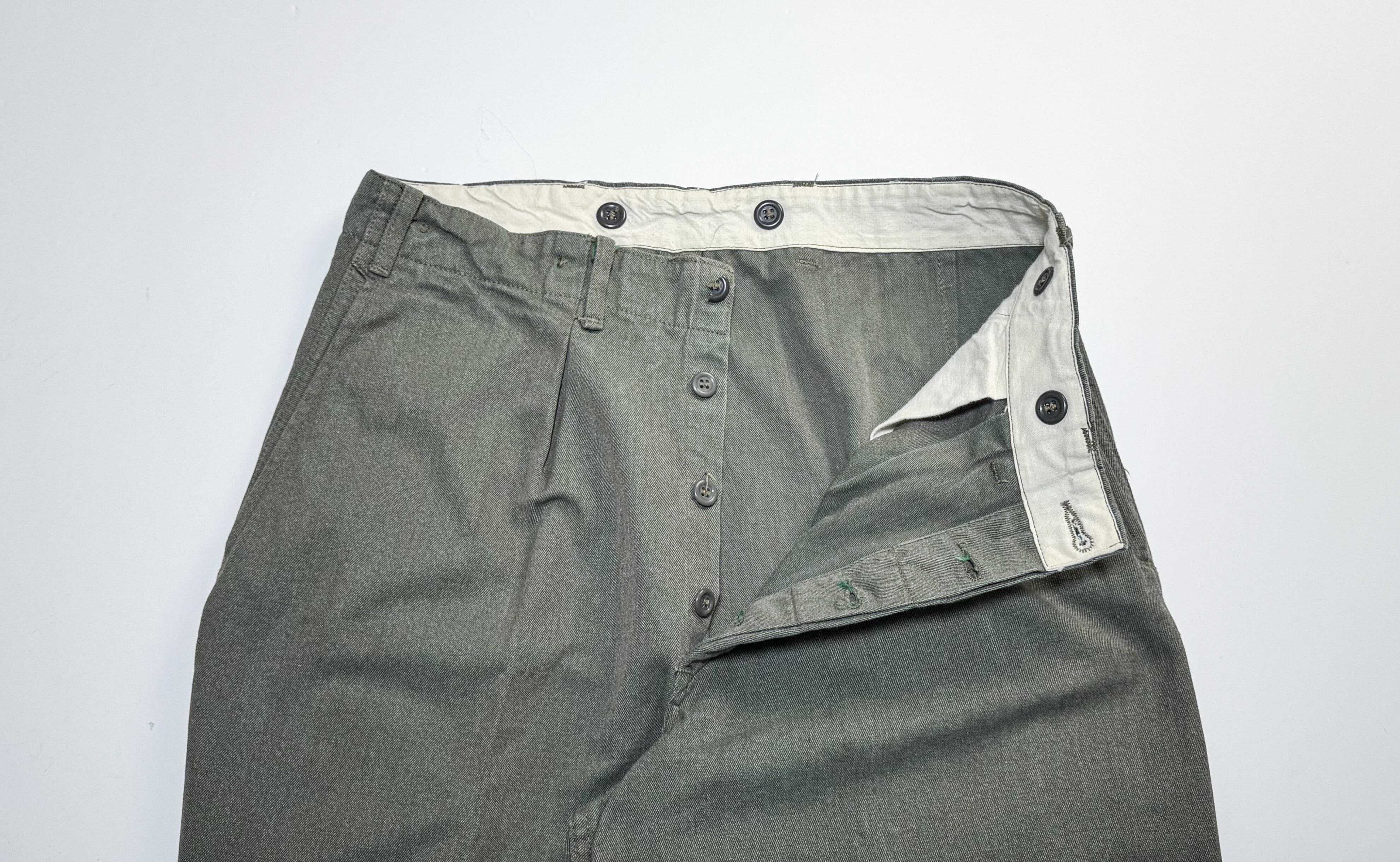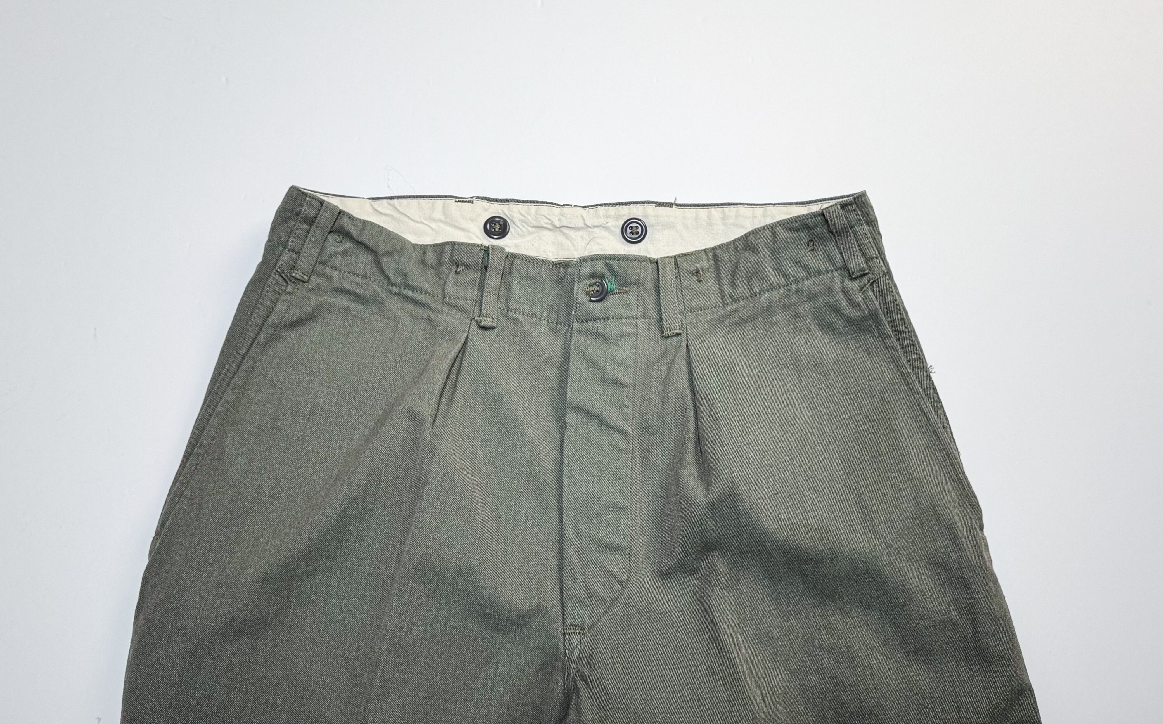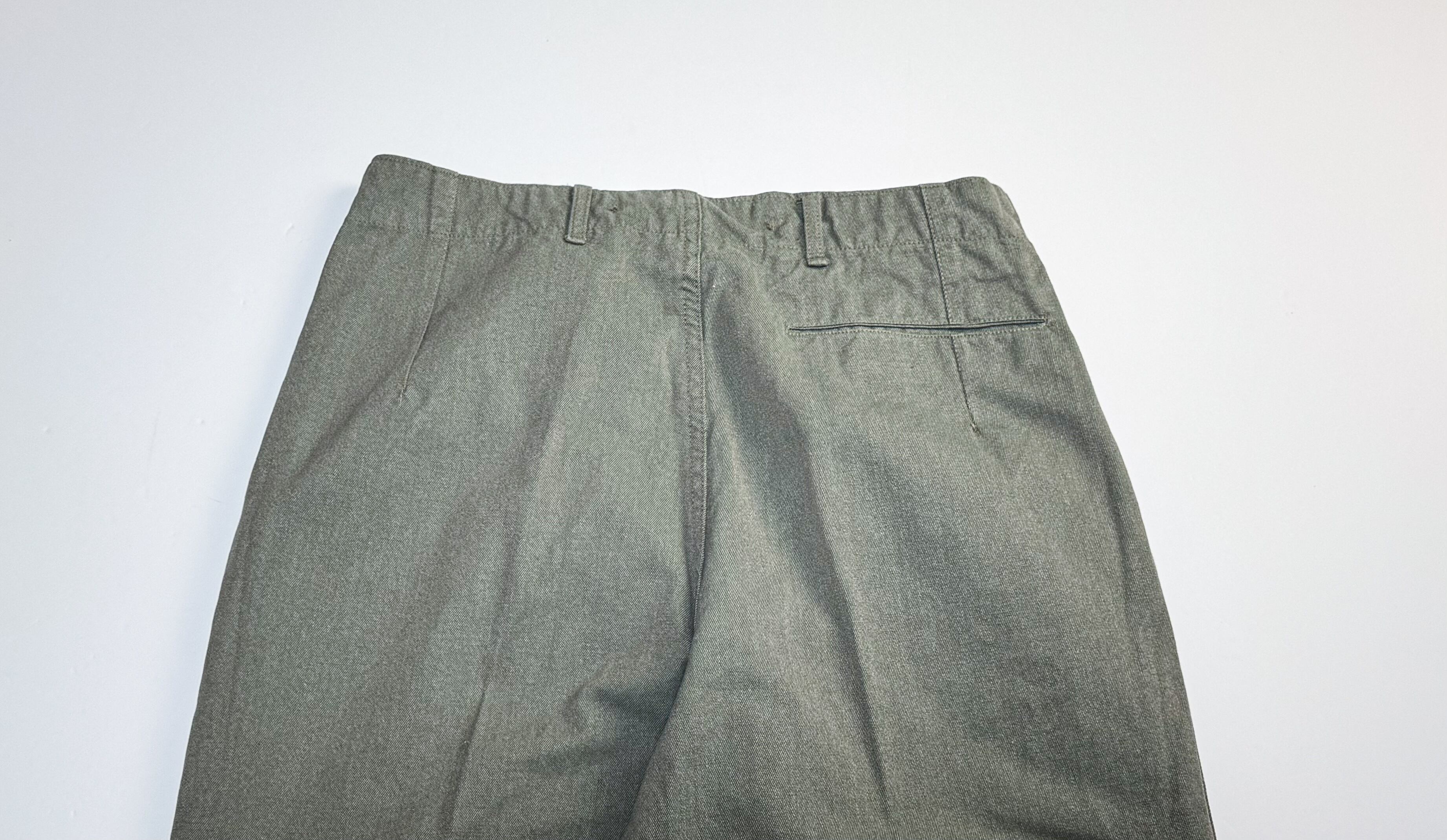 ただし、ウエストのトップボタンに一部割れがあり、半分ほど欠けています(着用・留める上で支障はありません)。そのほか、ごく細かなほつれなどはありますが、着用に問題のあるダメージは見受けられません。