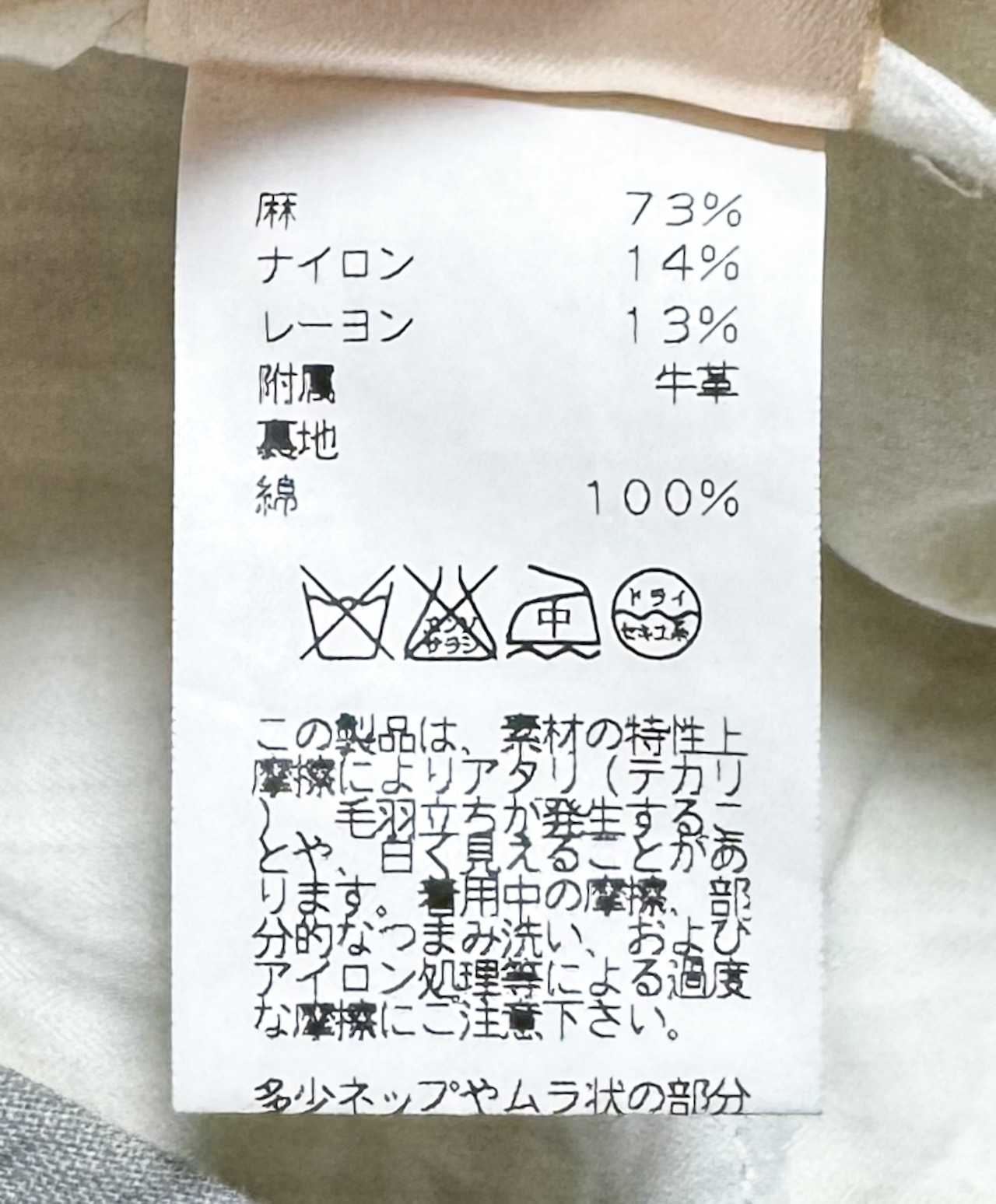 生地にはリネン73%、ポリアミド14%、レーヨン13%を使用。