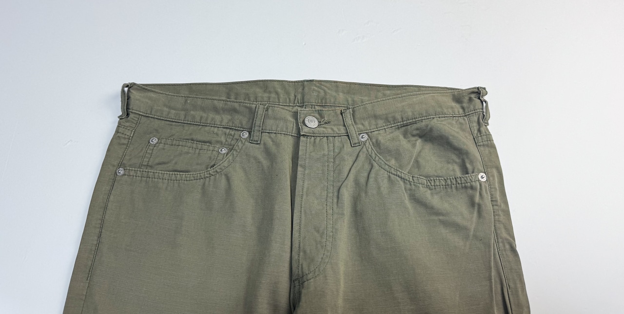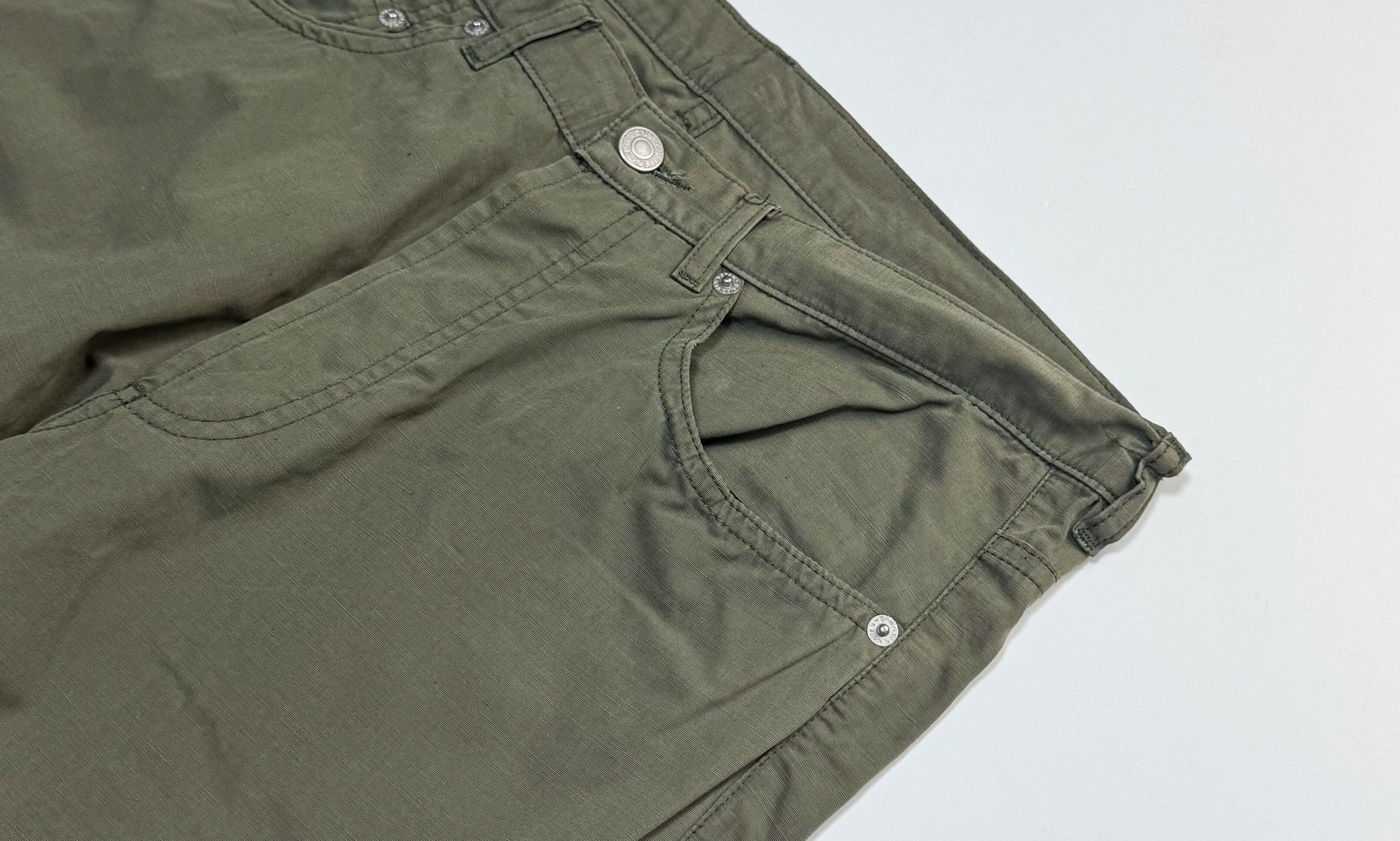 色味はくすんだオリーブグリーンで、ほどよい光沢と軽やかさのある生地感です。