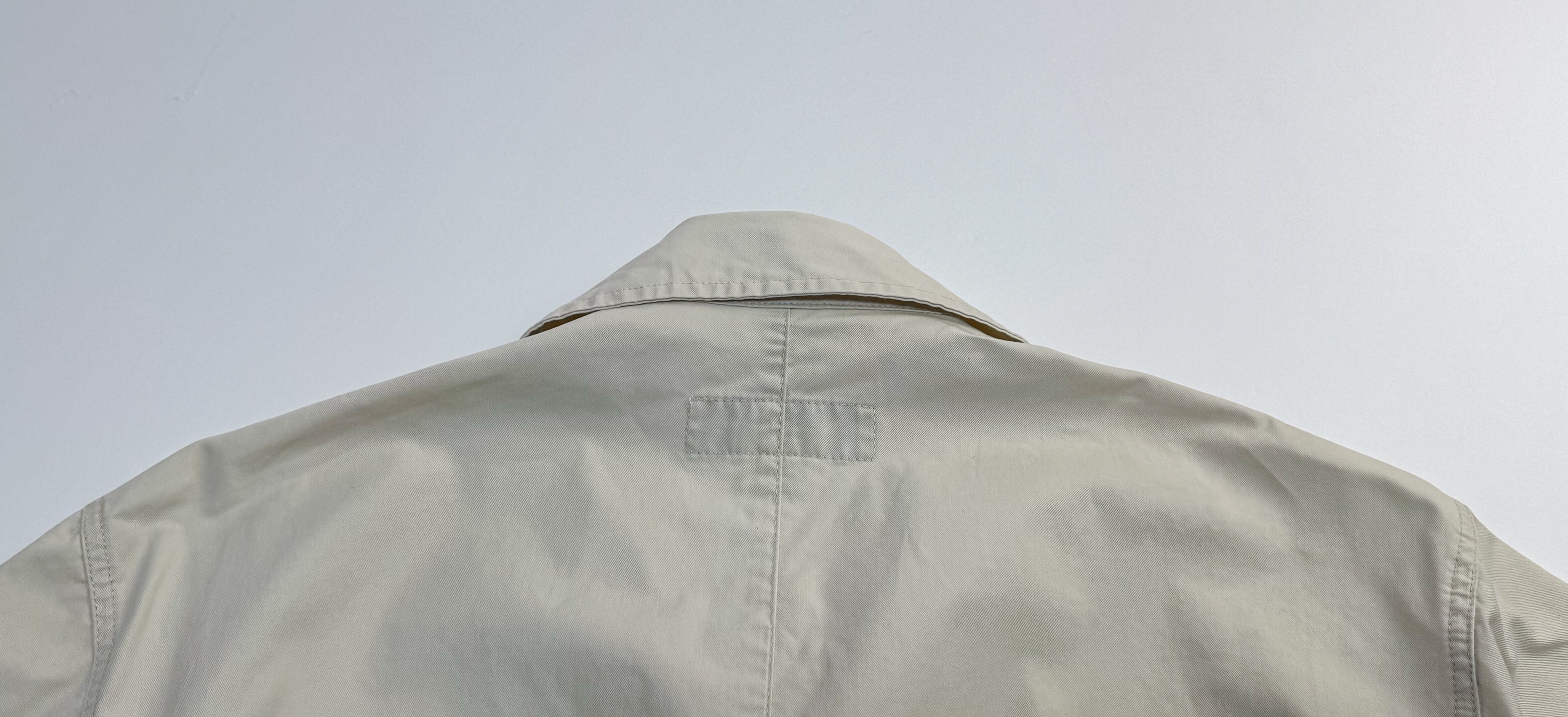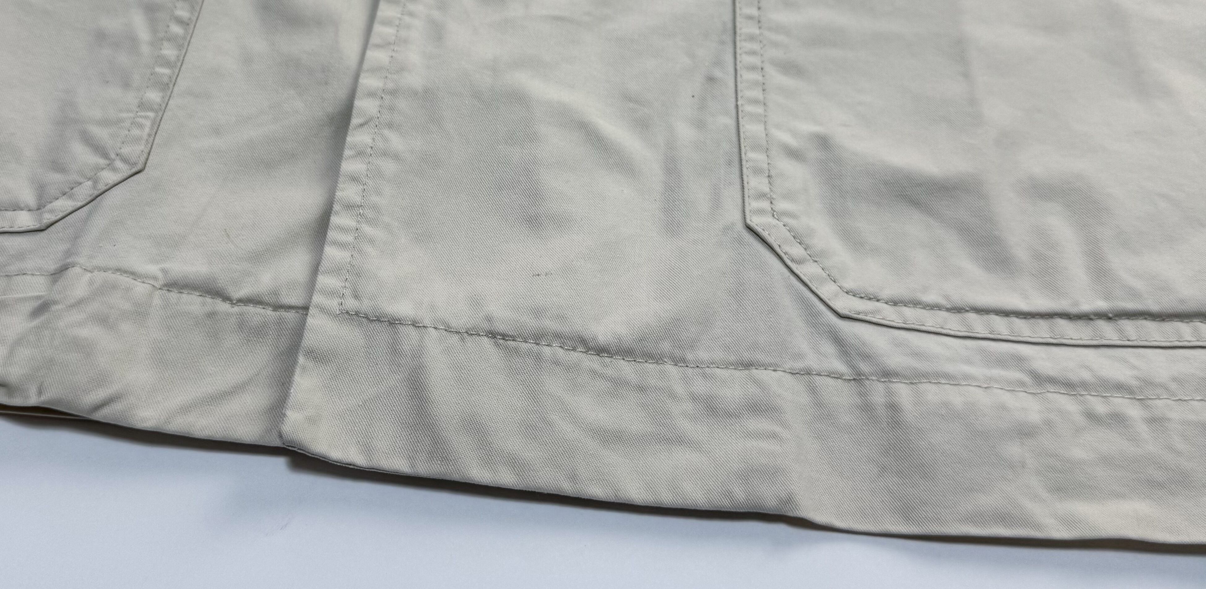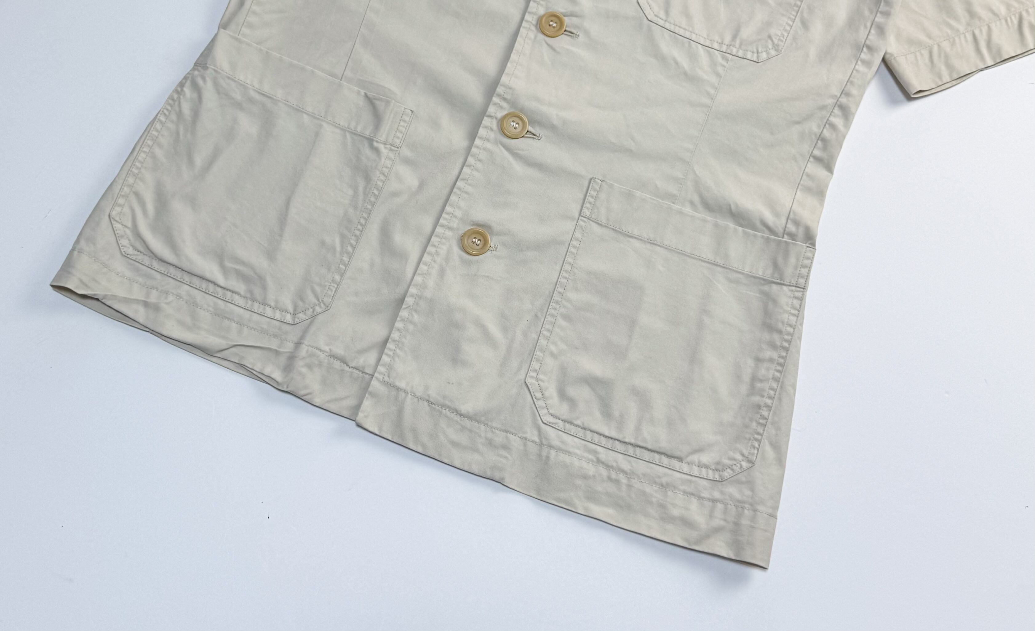 上質なコットン100%の生地を使用し、イタリア製ならではの丁寧な仕立てが魅力です。開襟仕様に3つのパッチポケット付きで、ユーティリティ要素と上品さを兼ね備えた一着。ワークテイストをベースにしながらも、洗練されたシルエットで都会的な印象を与えます。色味は淡いベージュで、春夏のコーディネートに馴染みやすいナチュラルカラーです。