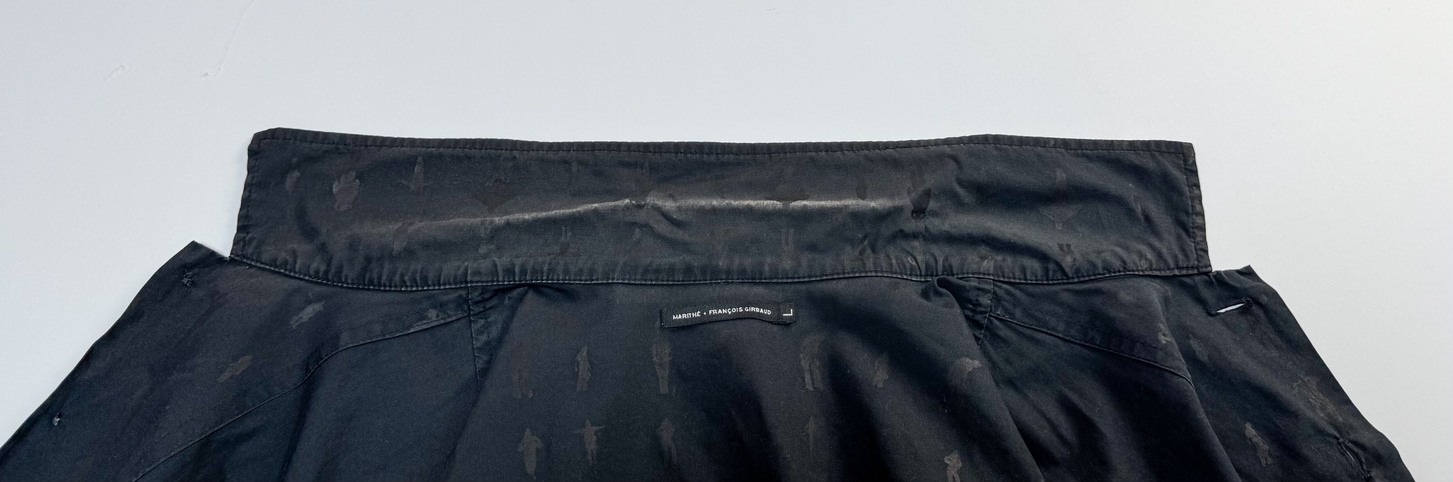 黒地に同色のジャカード織りで人型のモチーフが全面に配されたユニークなデザイン。光の加減で柄が浮かび上がるさりげない仕上がりながら、細かく観察すると個性がにじみ出る1枚です。左胸にはシンプルなポケット付き。