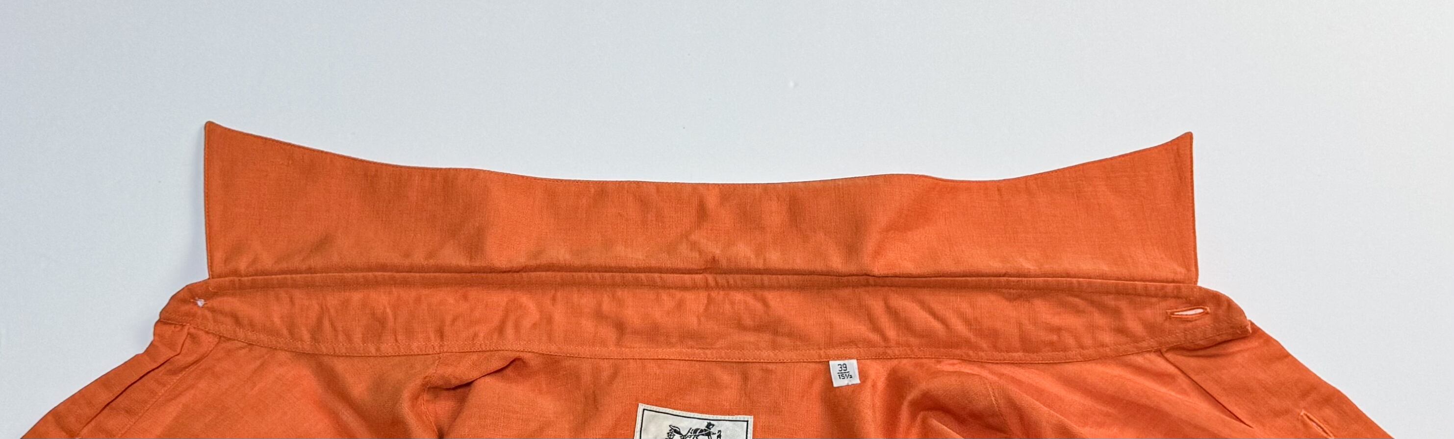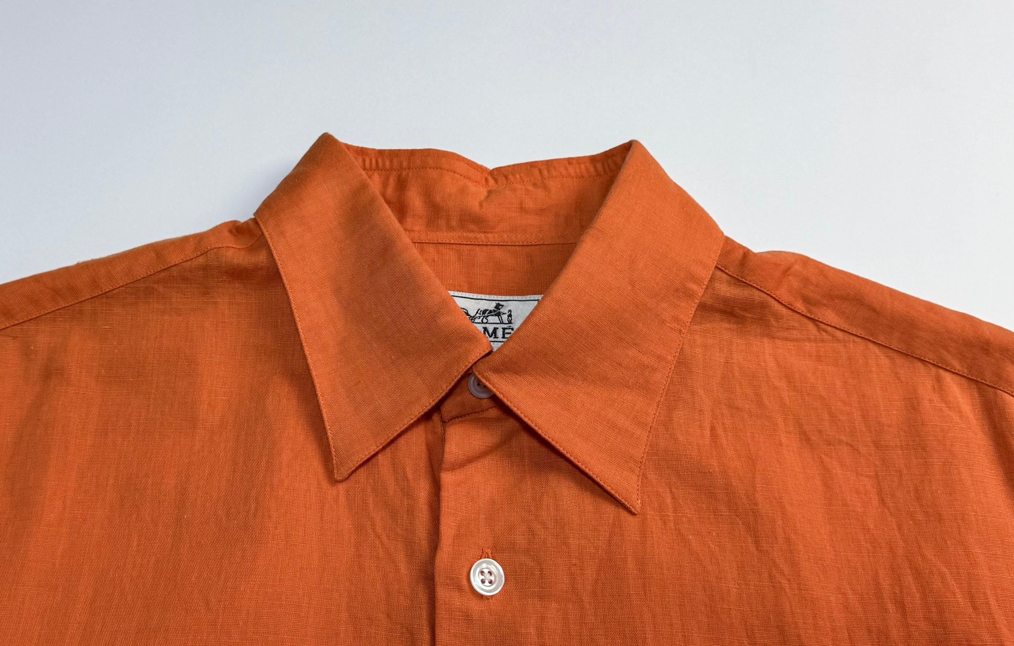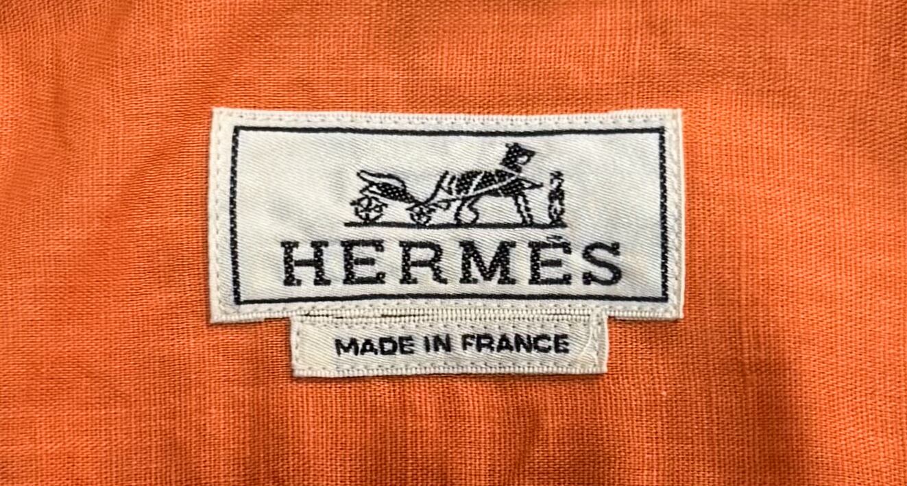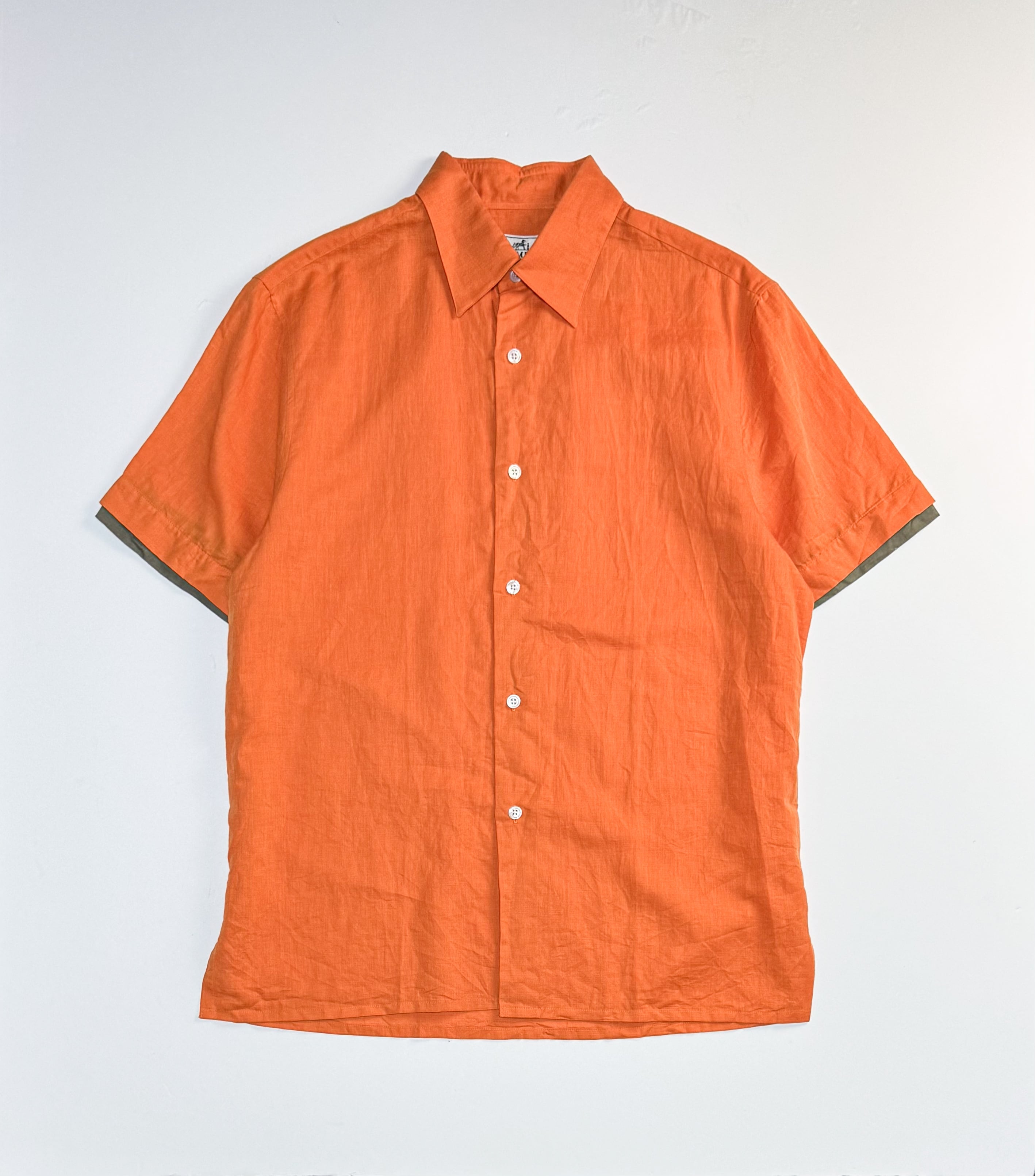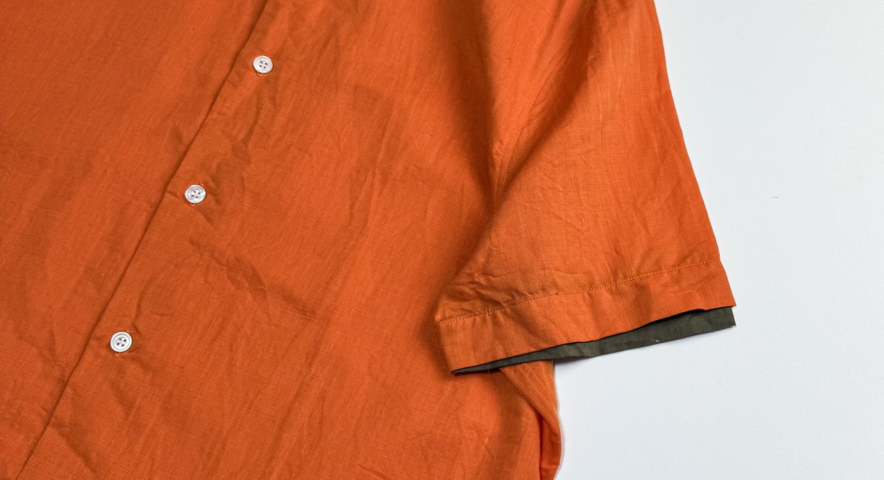 フランス製のエルメスによる上質な半袖シャツ。鮮やかなオレンジカラーが目を引く一枚で、素材には通気性と肌触りの良さを兼ね備えたコットン×リネンの混紡生地(コットン50%、リネン50%)を使用。袖裏にはさりげないオリーブカラーの切り替えが施されており、袖をロールアップした際にアクセントとして映えます。シンプルながらも洗練されたデザインの一着。