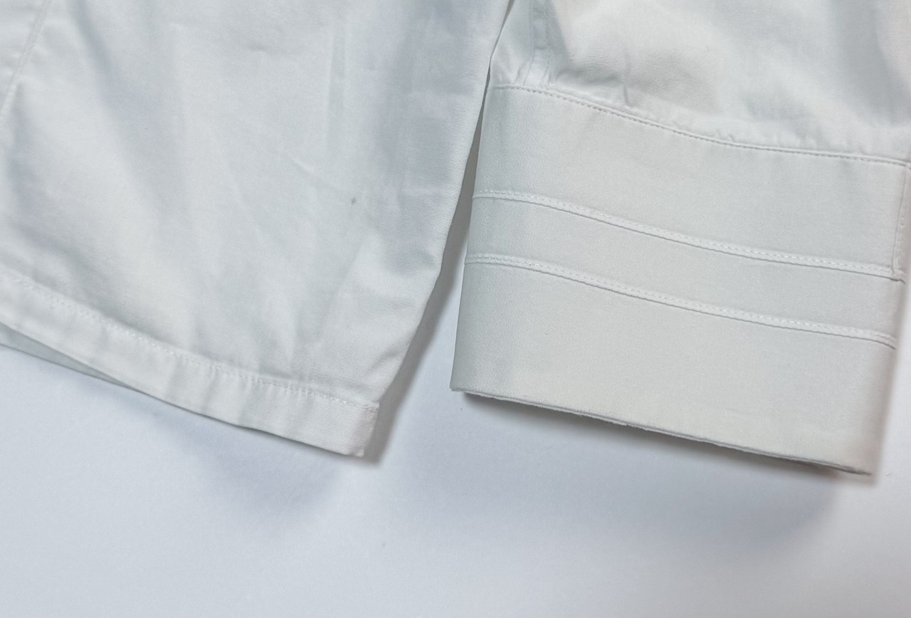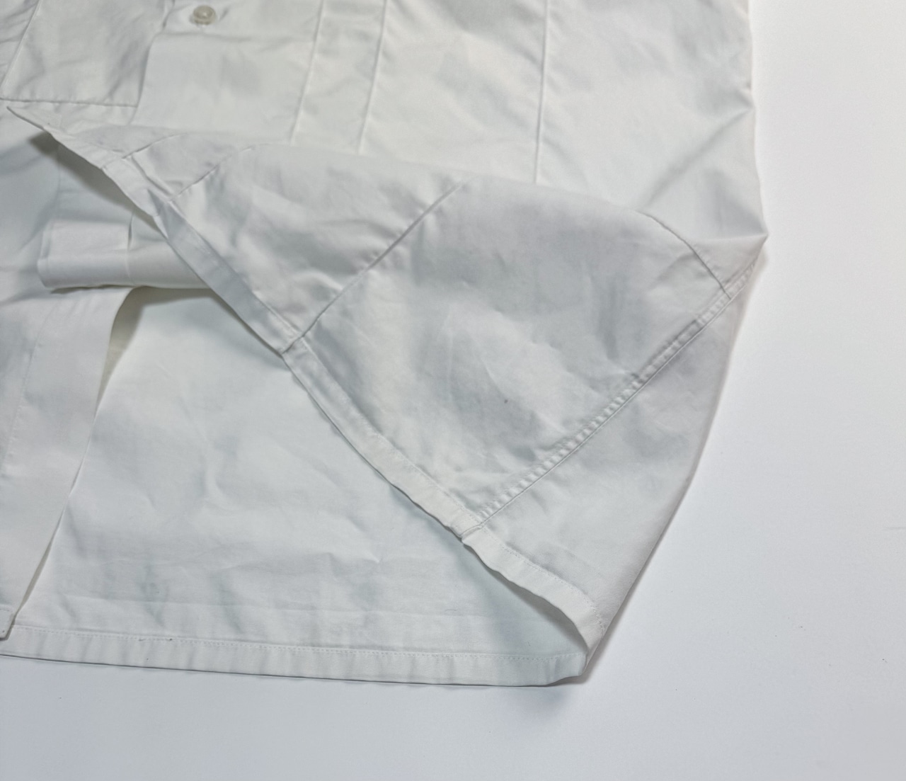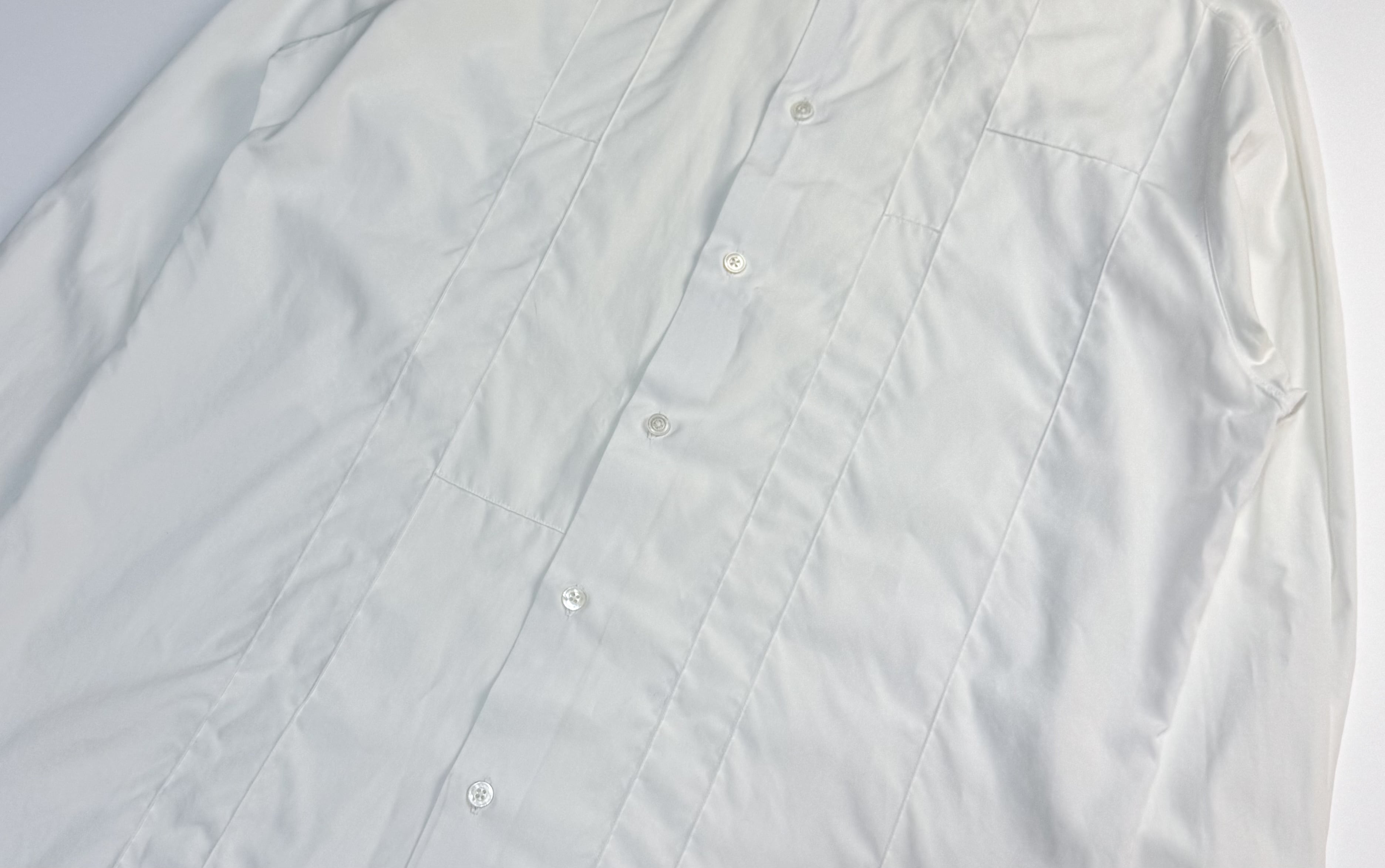 HERMÈS(エルメス)による、フランス製のロングスリーブドレスシャツ。上質なコットン100%素材を使用し、上品な光沢と滑らかな肌触りが特徴です。タキシードシャツを彷彿とさせるプリーツデザインが前立て部分に施され、ドレッシーかつクラシックな印象を演出。