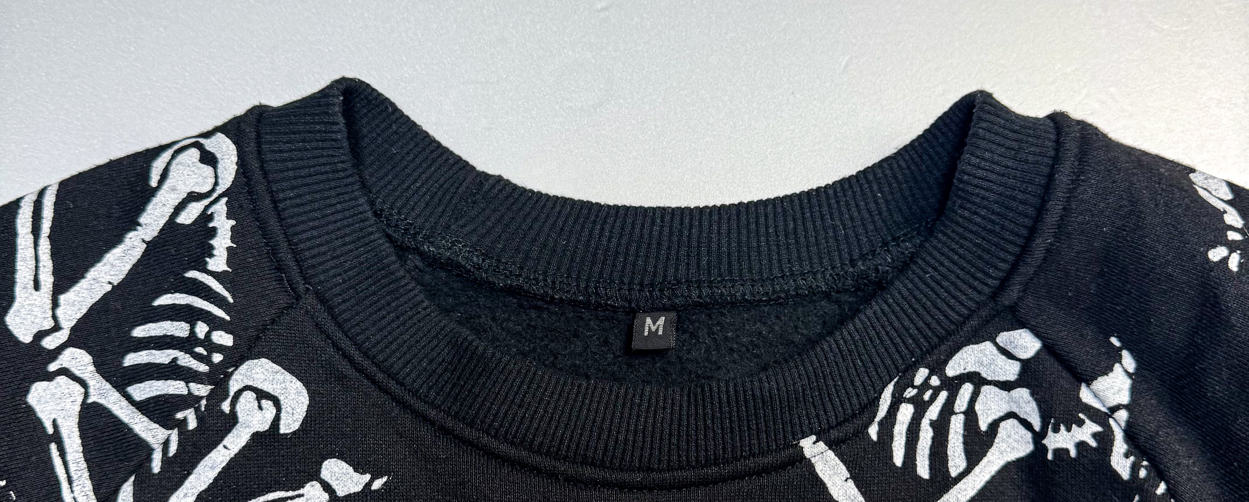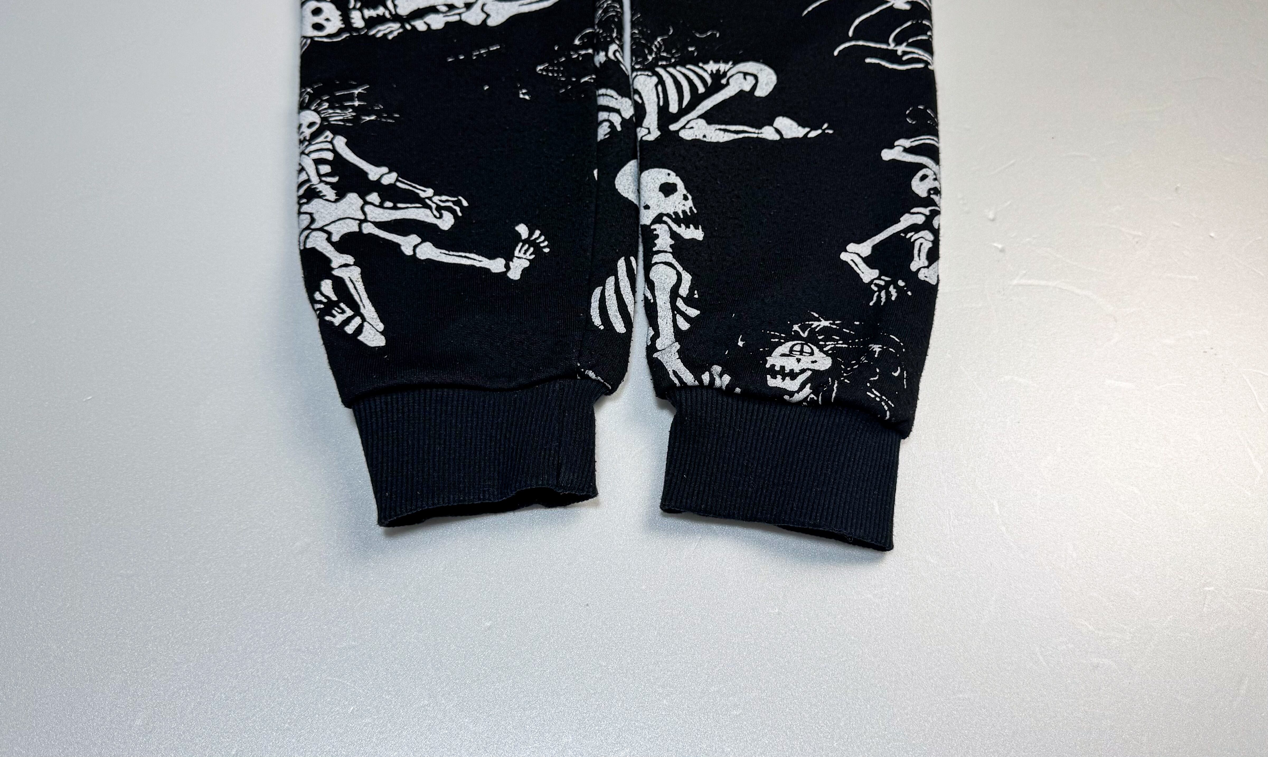 2000年代頃のブラックのスカル総柄スウェット。90年代のBONNERS(ブーナーズ)がリリースしていた「四十八手スケルトンTシャツ」をモチーフにしたサンプリングデザインです。骸骨たちが様々なポーズで戯れる独特のグラフィックが全面にプリントされたインパクト抜群の一枚。