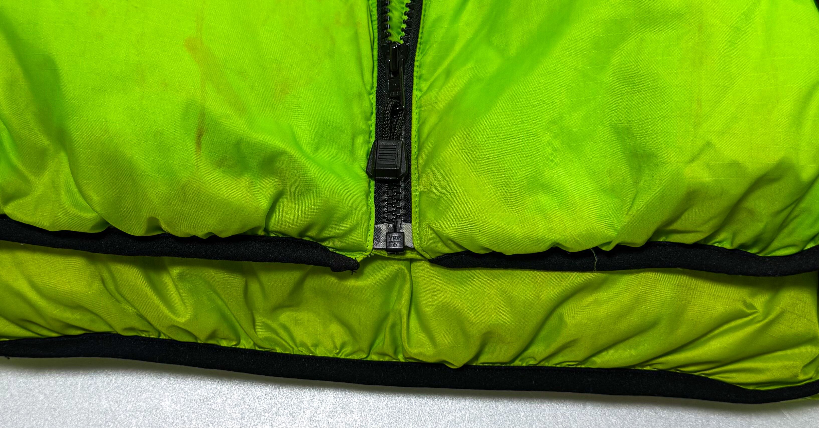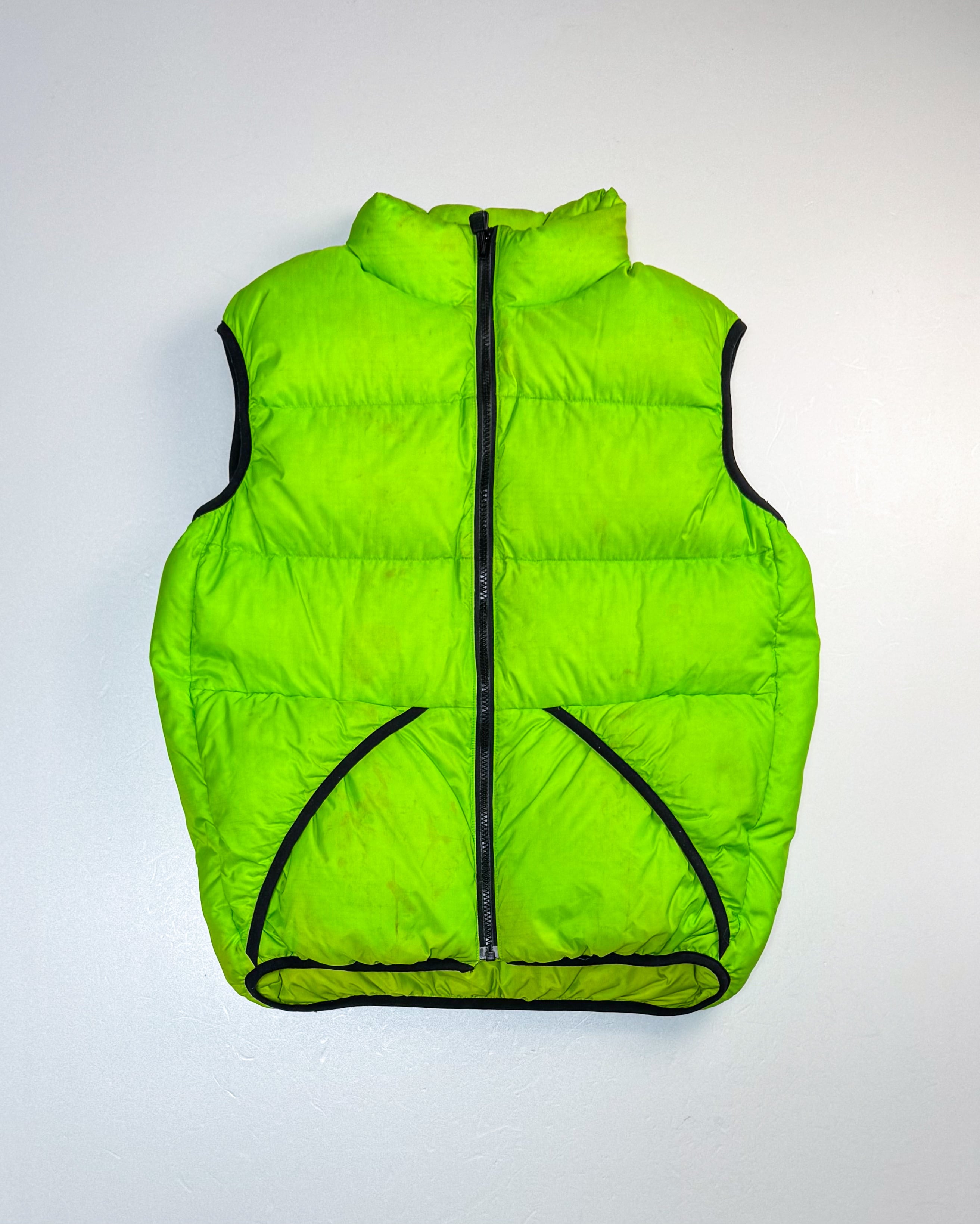 90年代の Feathered Friends ダウンベスト。ライトで強度のあるリップストップナイロンを使用した、当時らしいアウトドア仕様の一着です。鮮烈なネオングリーンに黒パイピングの切り替えが効いた存在感あるデザイン。アーチ状のポケットラインもブランドらしいミニマルなアクセント。MADE IN USAらしいクラフト感と軽快なダウン量が魅力です。