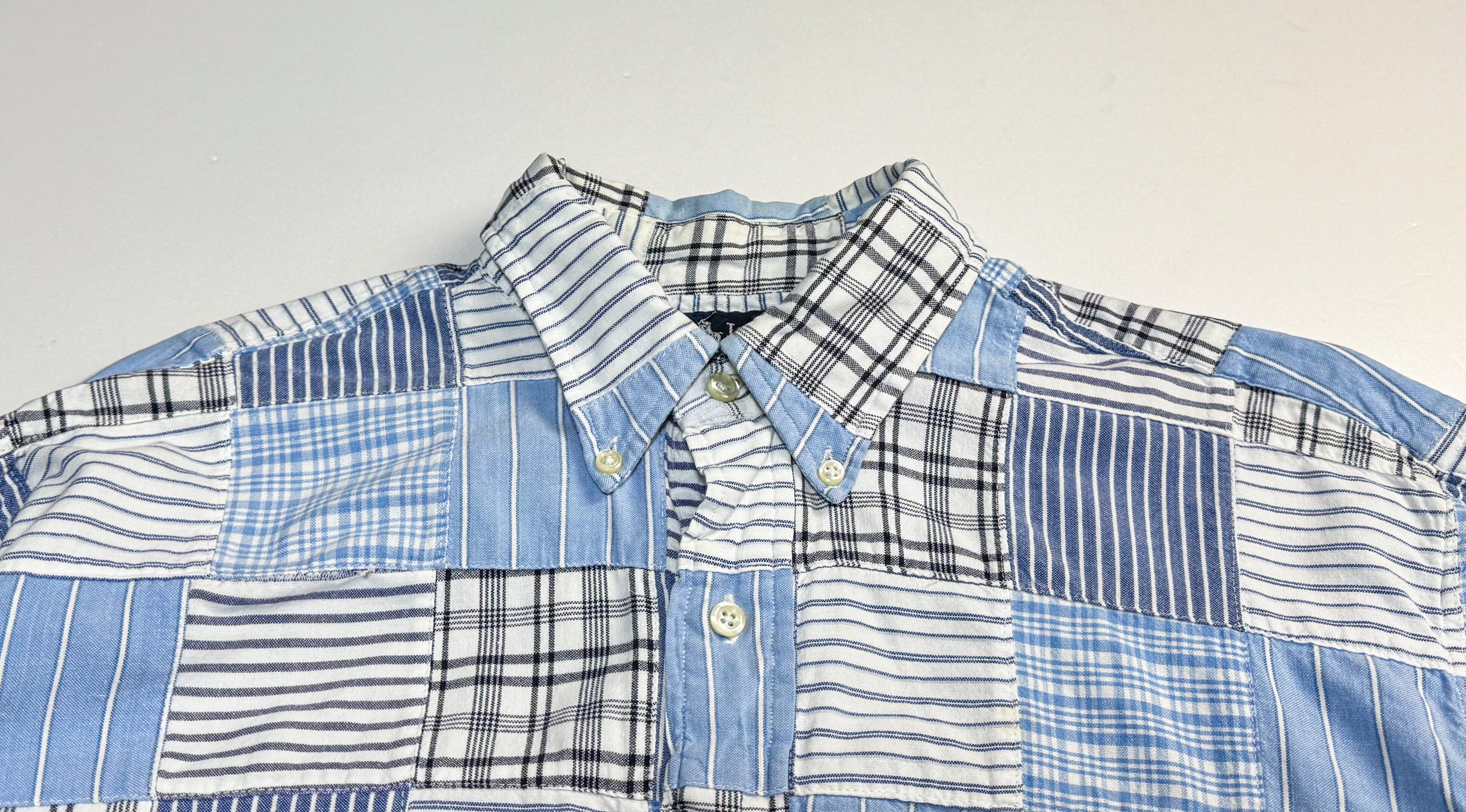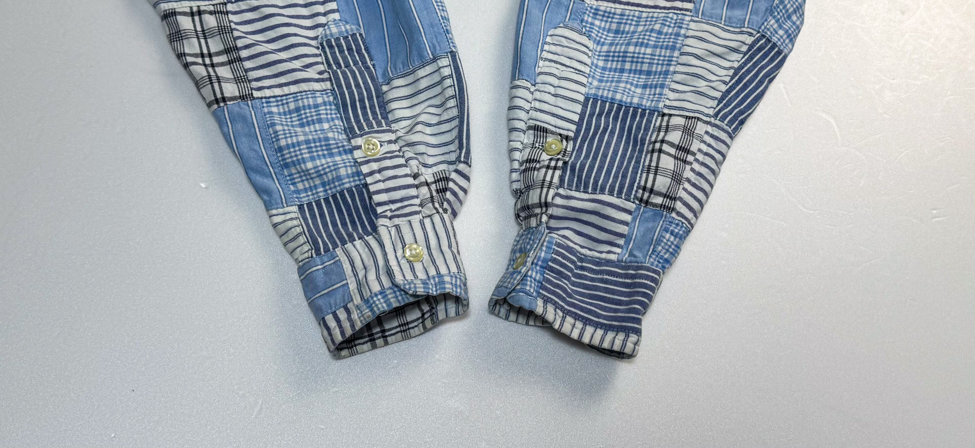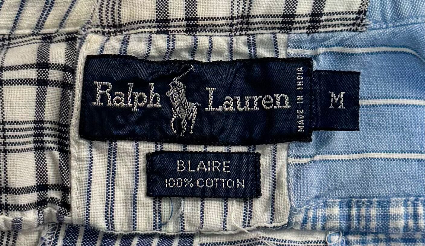 ブルー系のストライプ・チェック生地を細かく組み合わせた、ラルフらしい爽やかな1枚です。