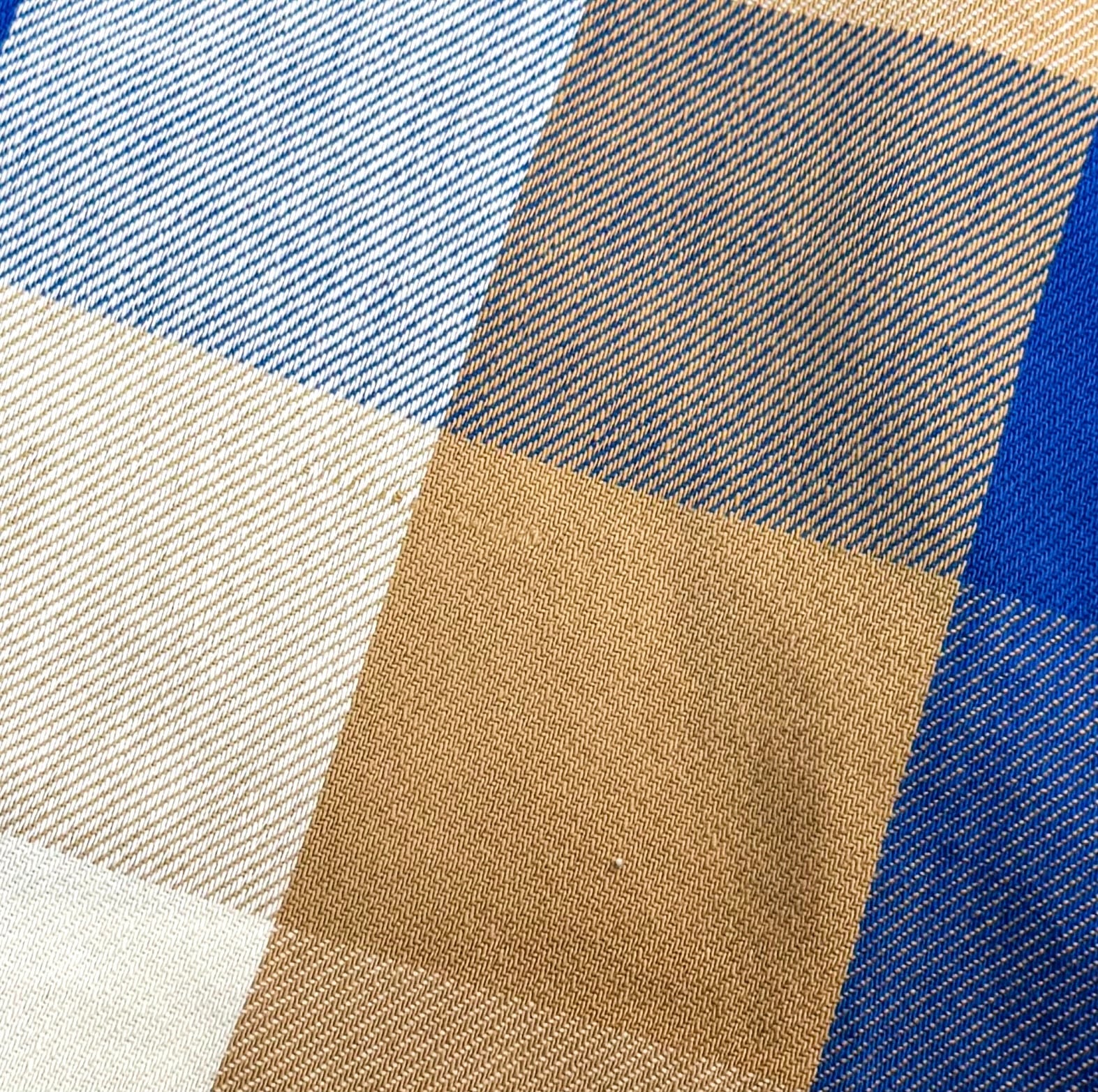 大判のチェック柄が珍しい配色で、ブルー×ベージュ×ホワイトの配色と、70’sらしい風合いが魅力。