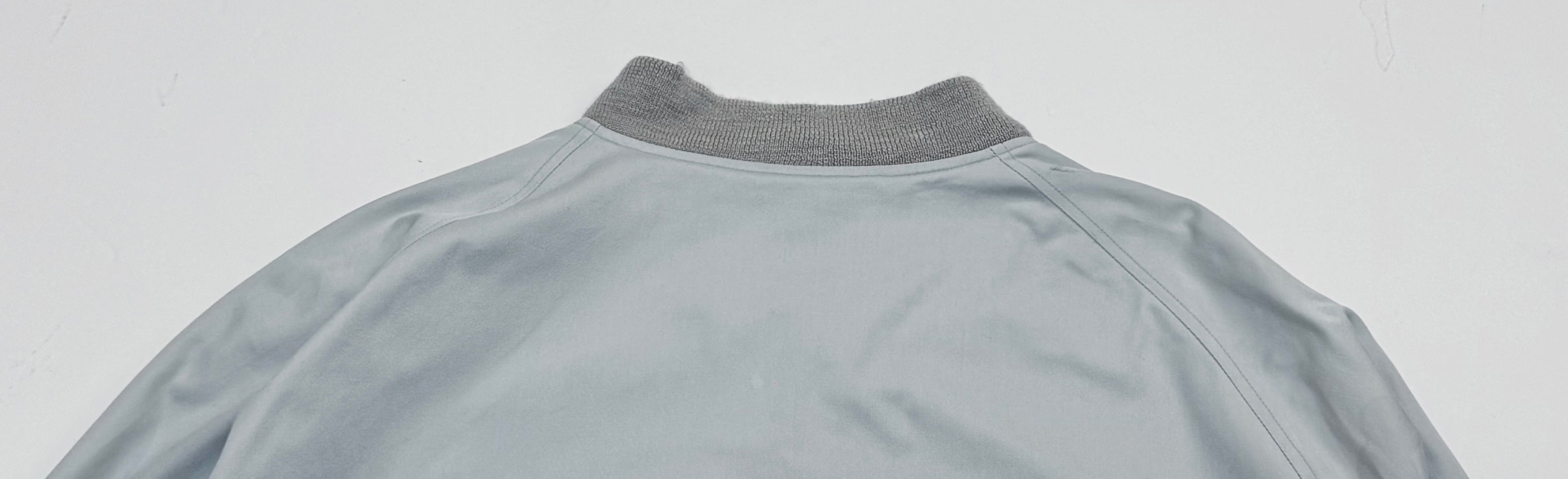フロントは比翼仕立て、襟・裾・袖口には同色リブを配置し、シンプルながら品のある構成。左腹部には小さくエンブレム刺繍が入り、控えめながら確かな存在感を添えています。