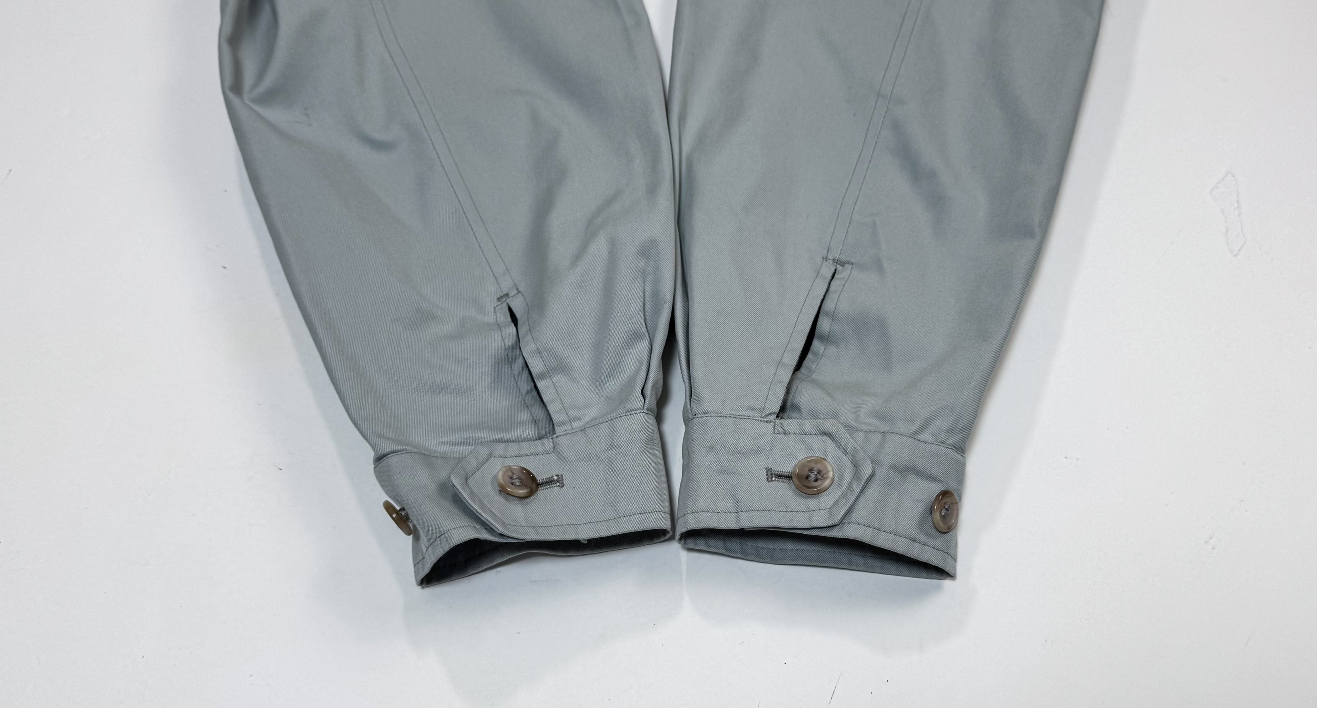 程よくくすんだブルーグレーの表地は、コットン × ポリエステルの落ち着いた艶のある生地感で、ブランドのクラシックな佇まいを自然と引き立てます。