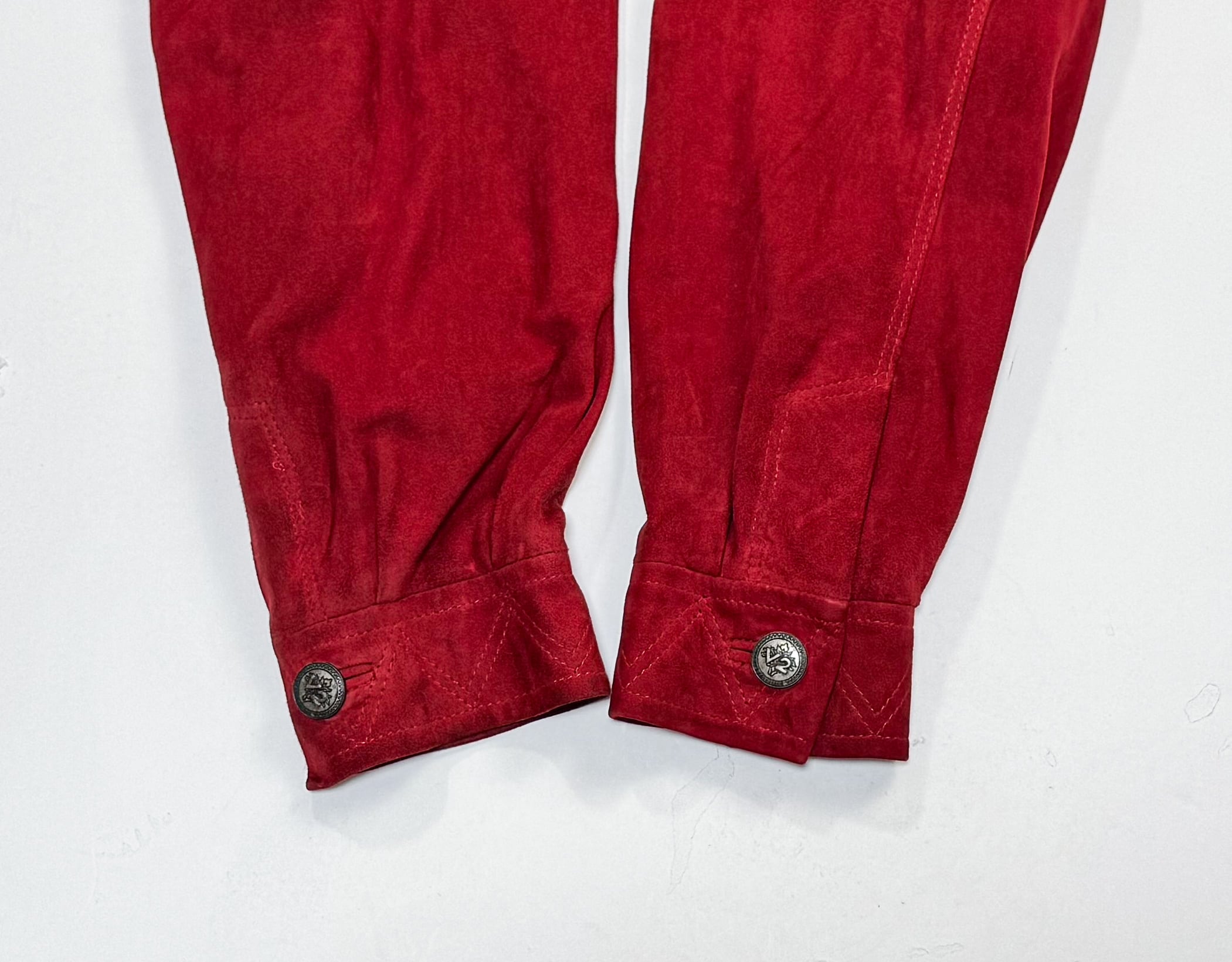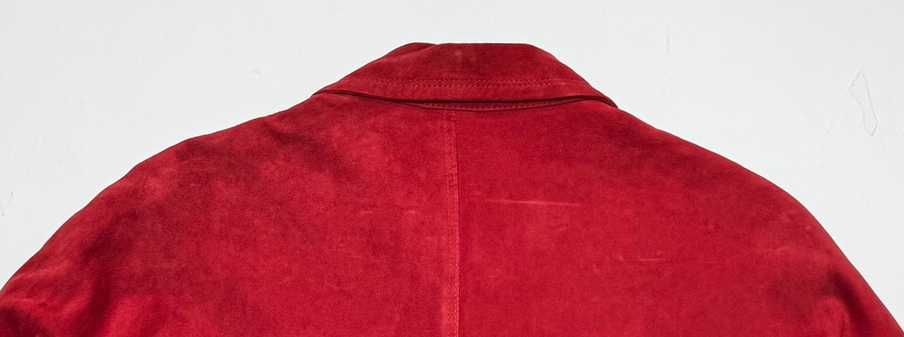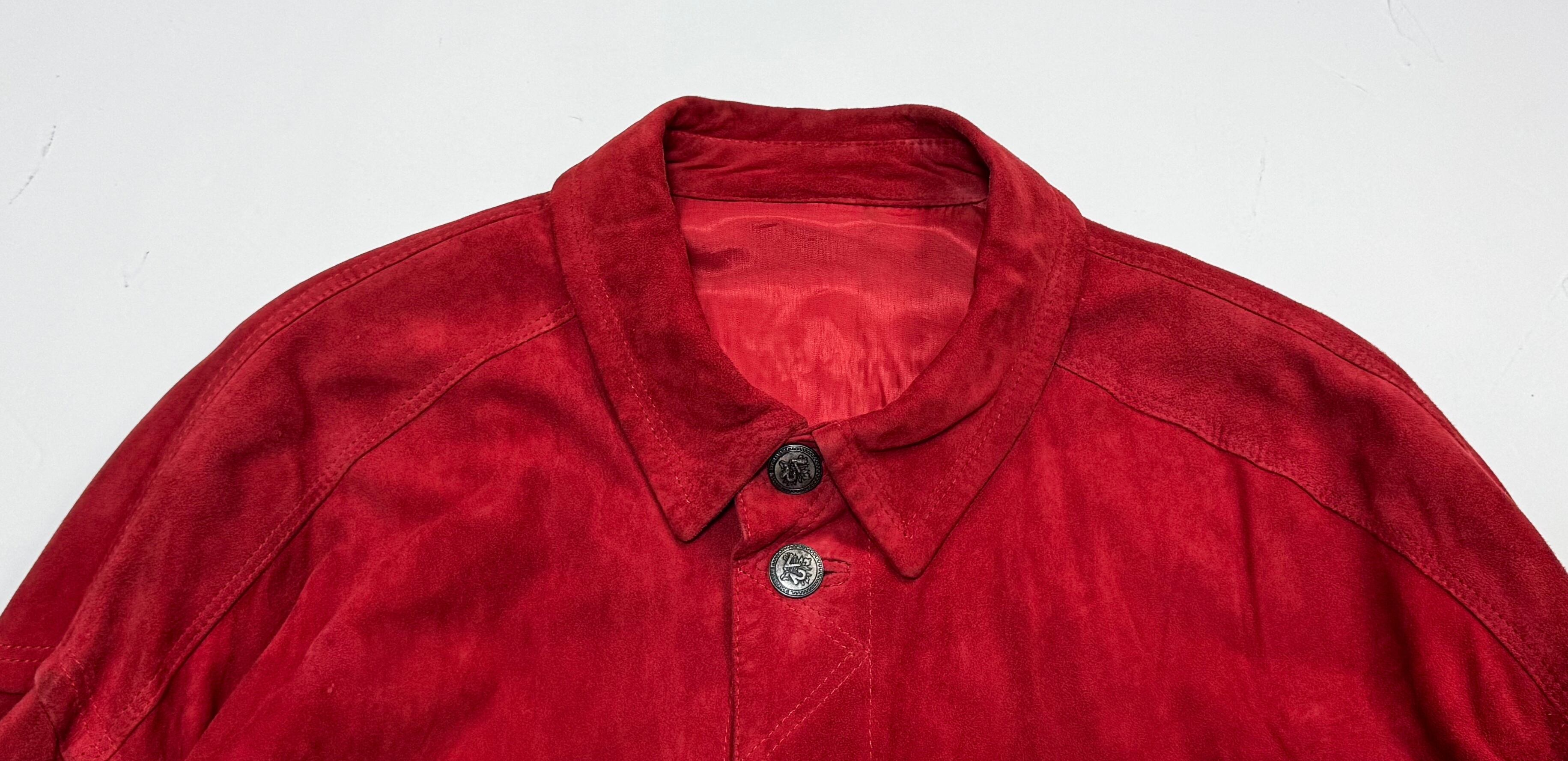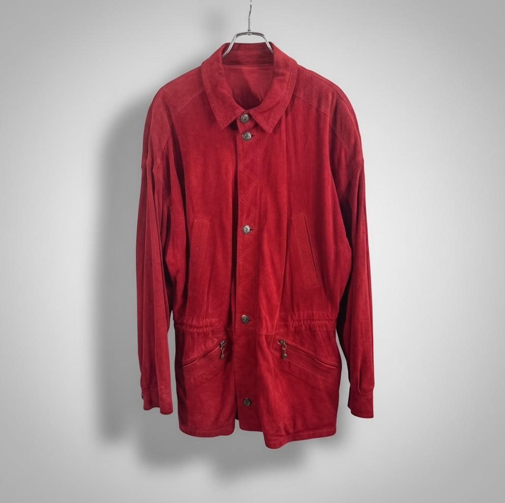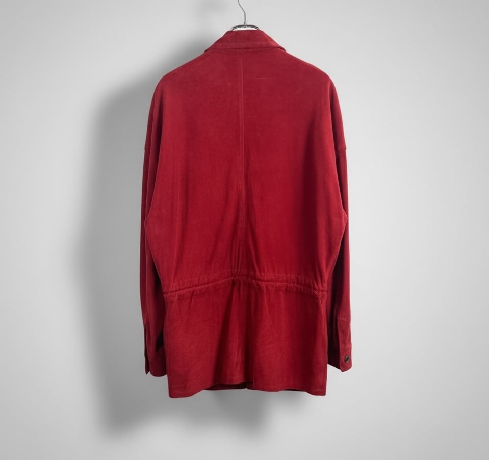鮮やかで深みのあるレッドのスエードを贅沢に使用した、当時の VERSACE らしい存在感のある一着です。身幅にゆとりを持たせたオーバーシルエット、ウエストのドローコード構造、立体的な切り替えステッチなど、90年代初期のイタリアメイドらしいディテールが詰まっています。