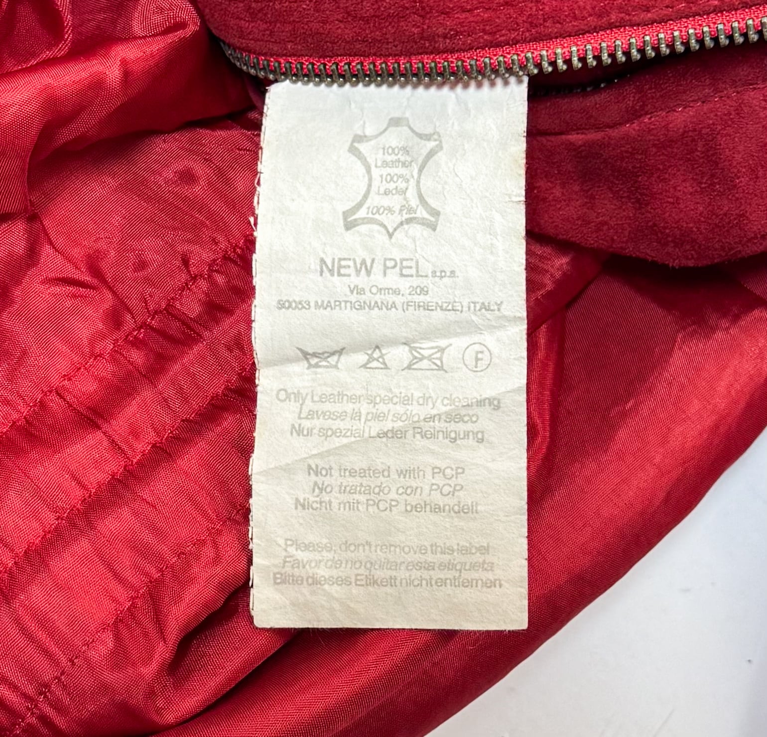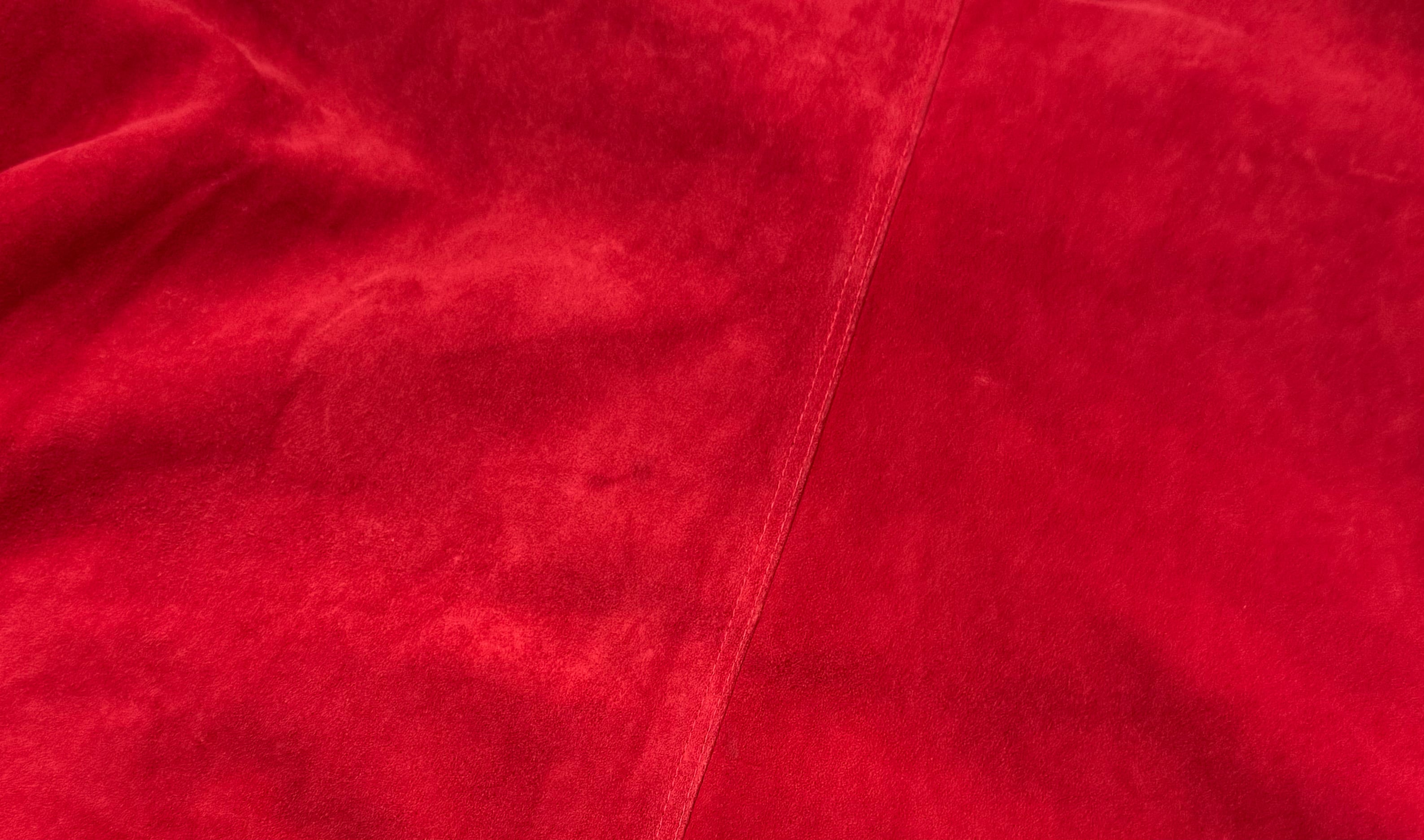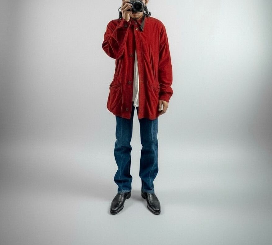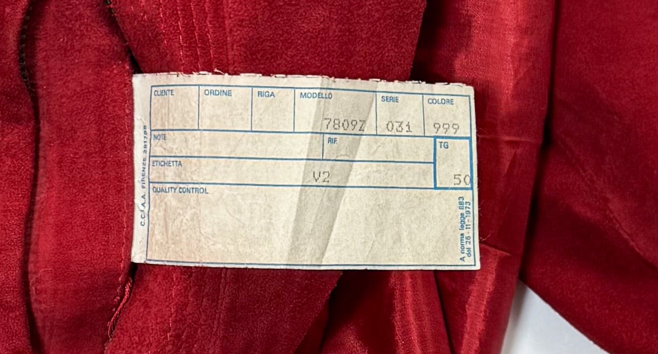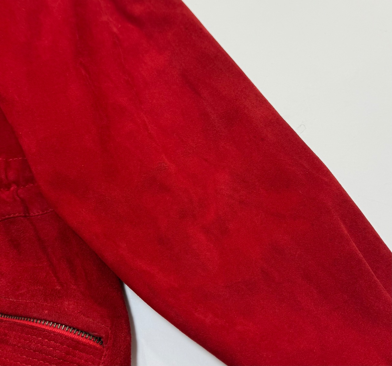 鮮やかで深みのあるレッドのスエードを贅沢に使用した、当時の VERSACE らしい存在感のある一着です。身幅にゆとりを持たせたオーバーシルエット、ウエストのドローコード構造、立体的な切り替えステッチなど、90年代初期のイタリアメイドらしいディテールが詰まっています。