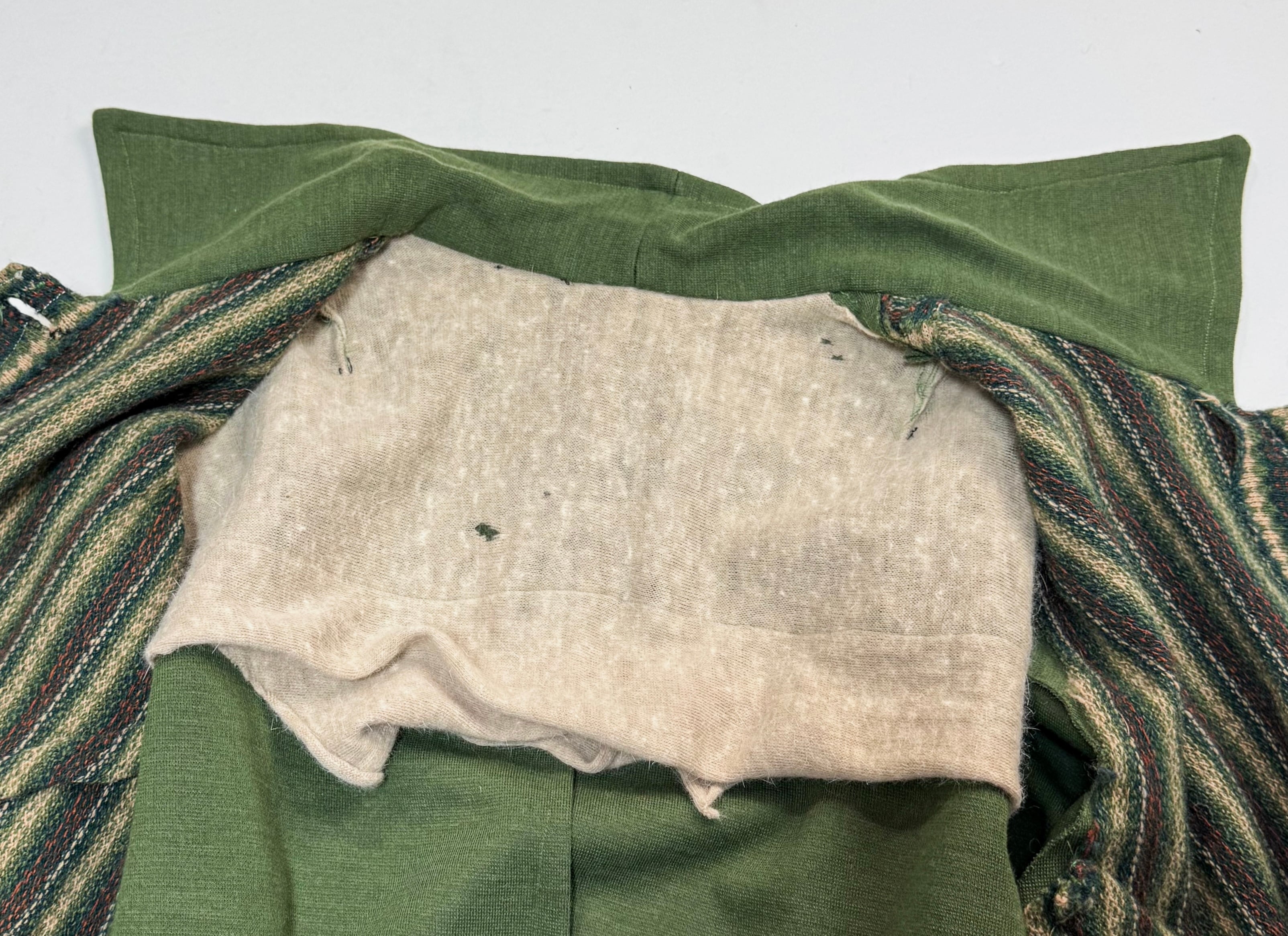 裏側を見ると、当時らしい簡素な裏当て布が付き、実用重視の作りであることが分かります。