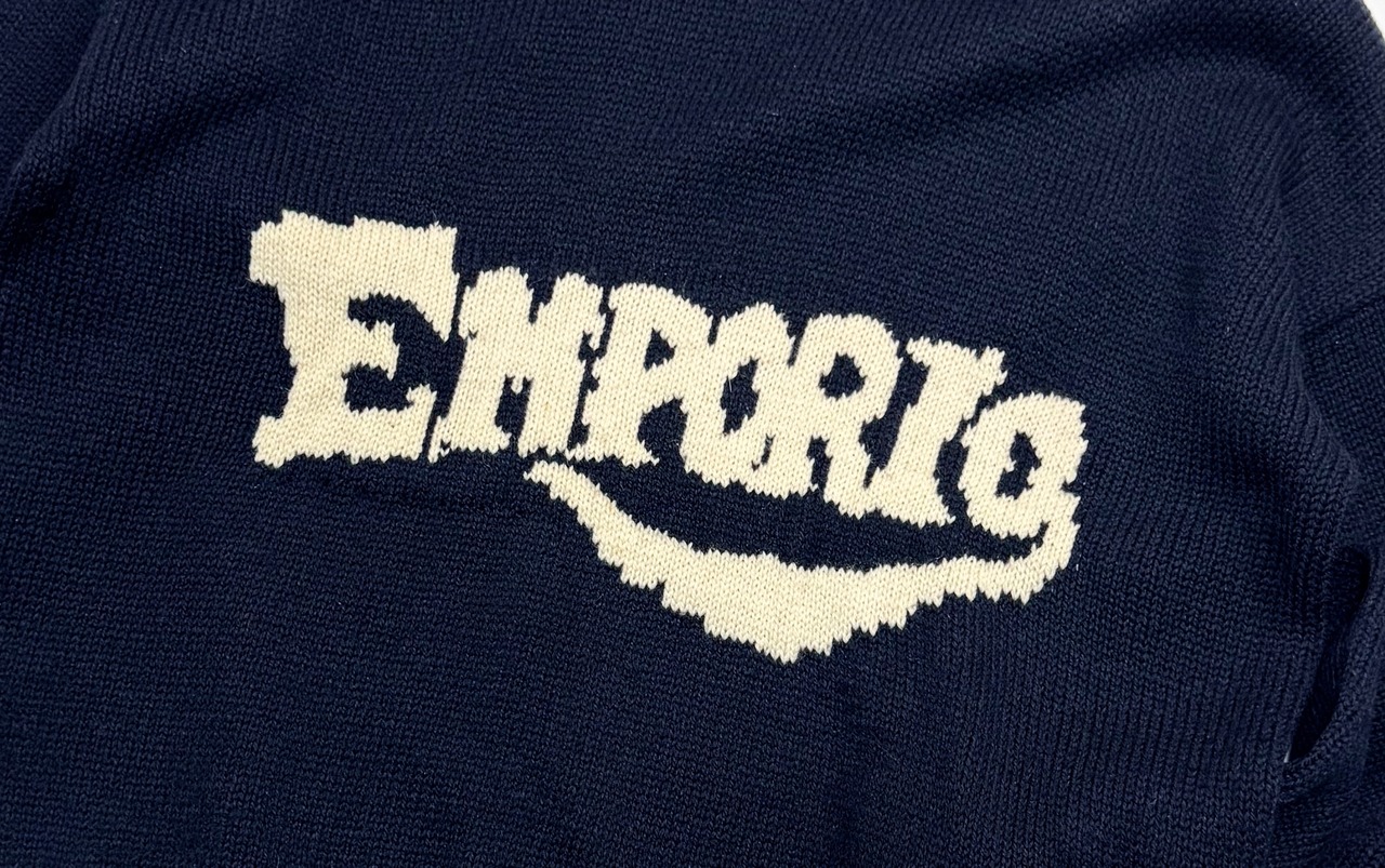 ネイビーをベースに、フロントへ大胆に配されたロゴデザインが印象的な一着。