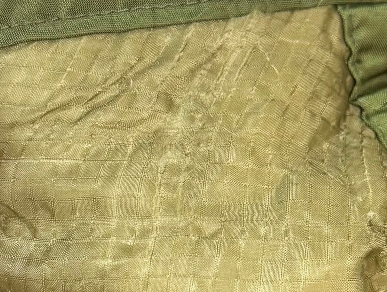 ライナー内側にも汚れ、生地の摩耗が見られ、部分的にほつれがございます。