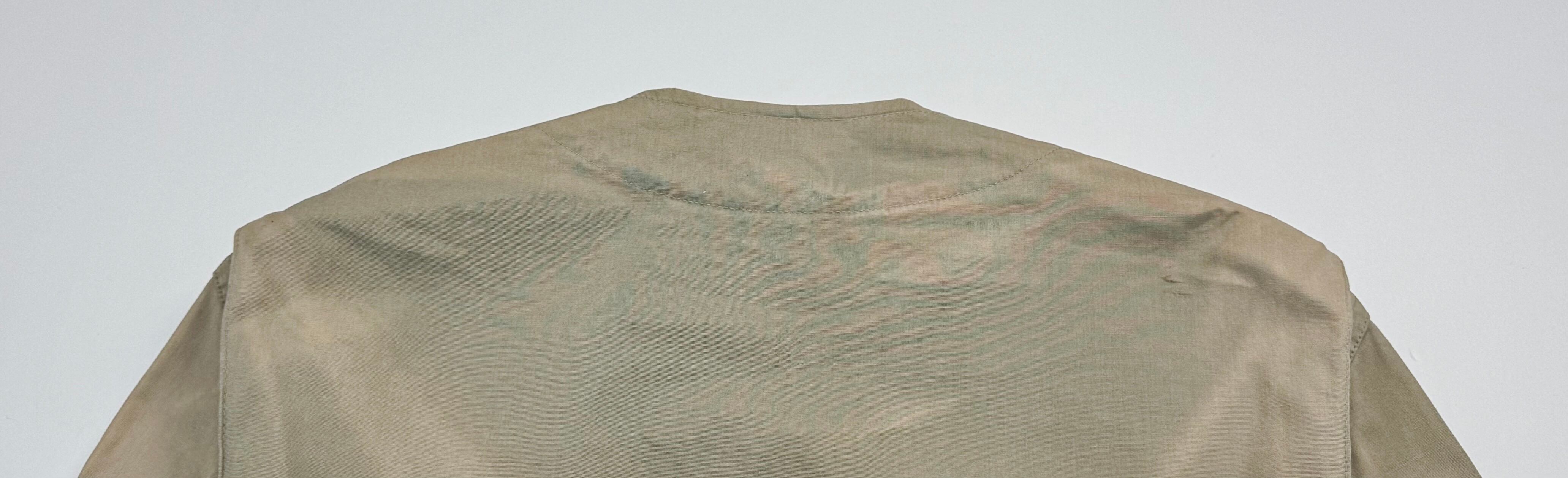 前後身頃および胸・肩・袖にかけて日焼けによる色変化が見られます。