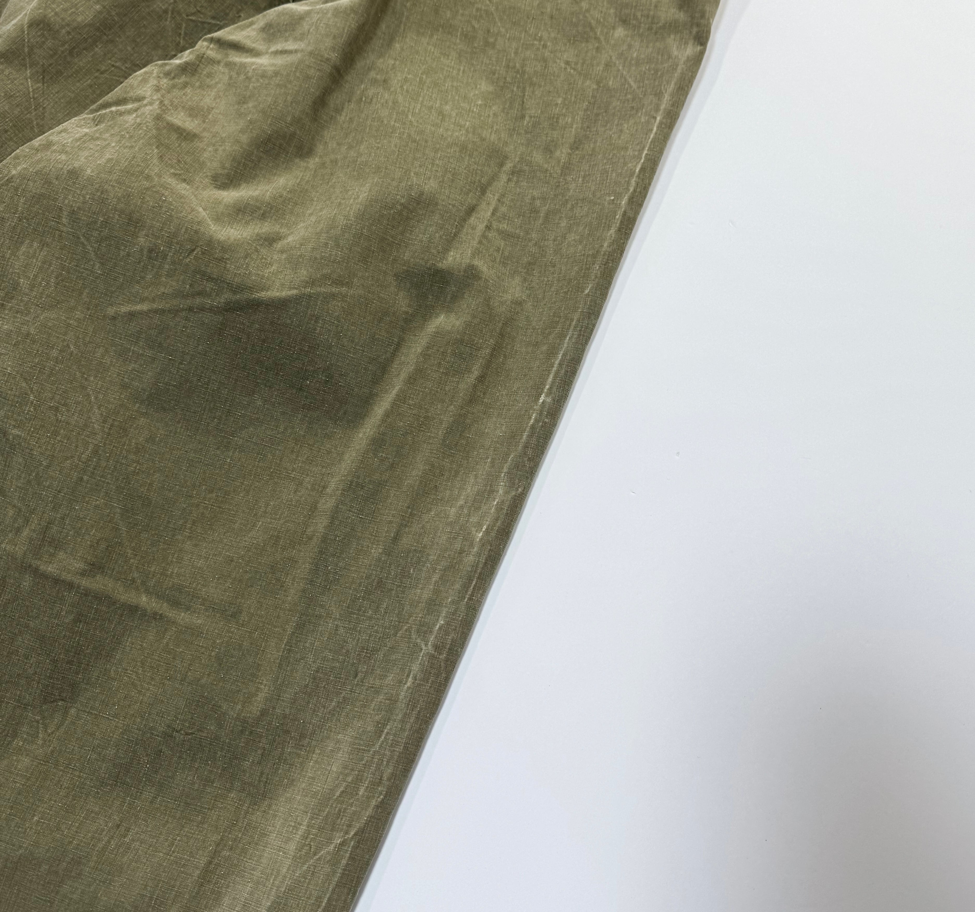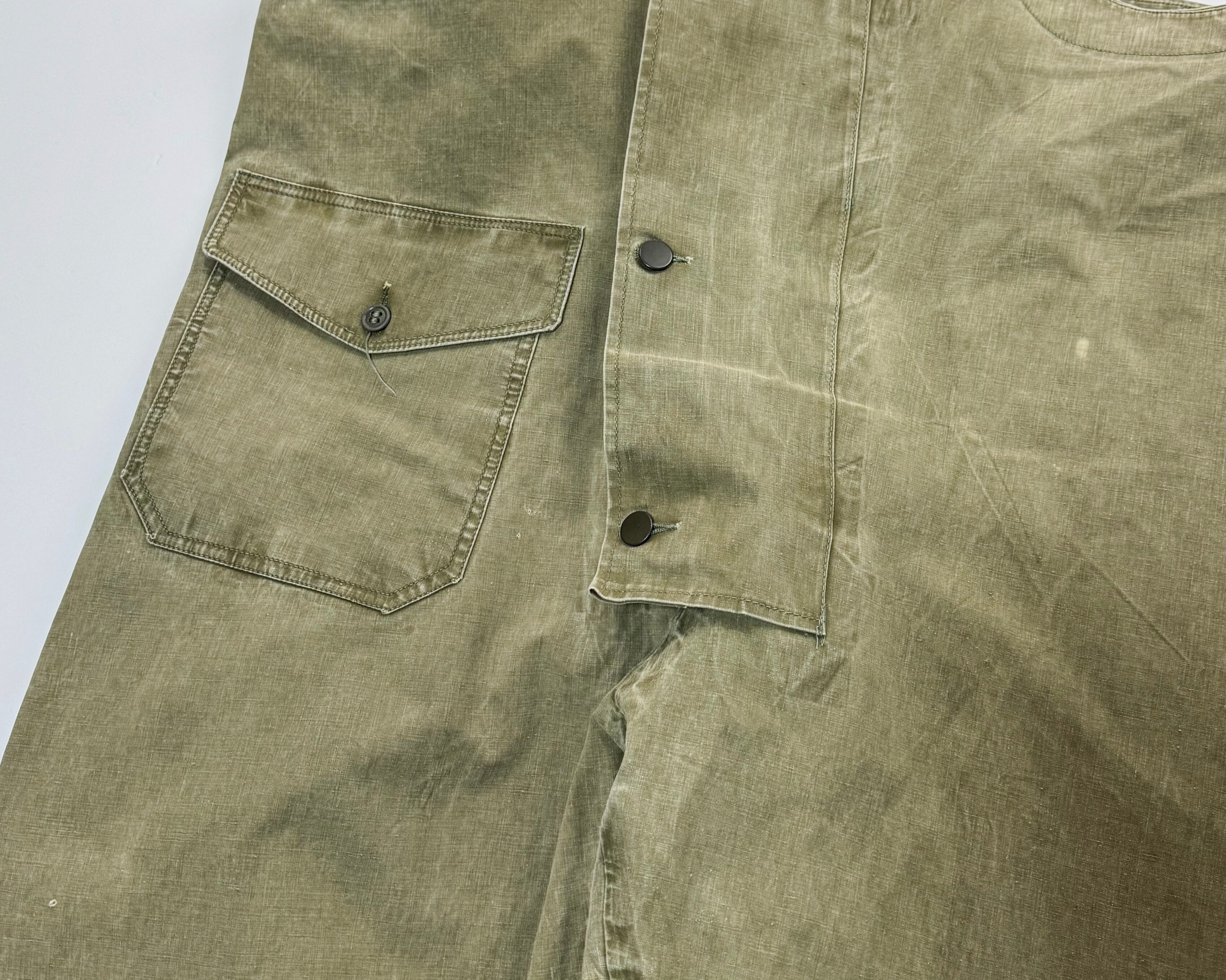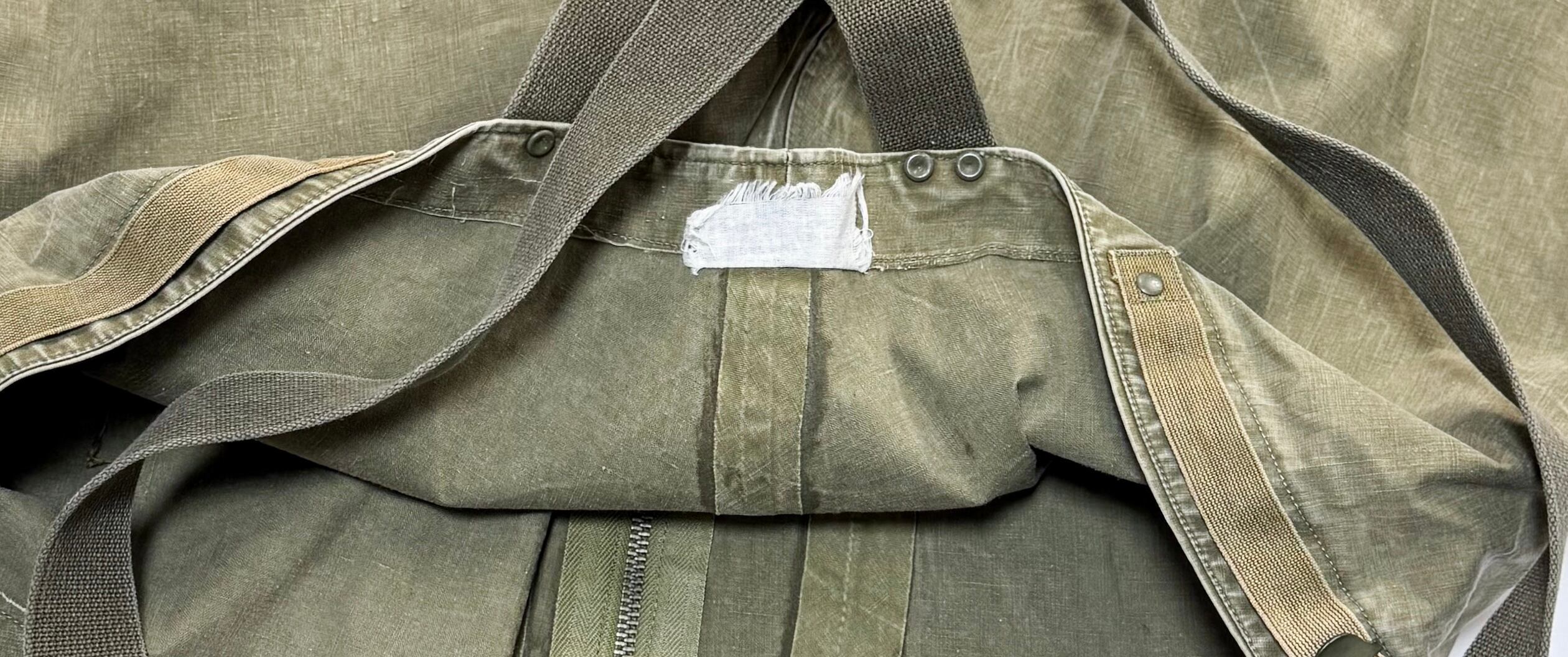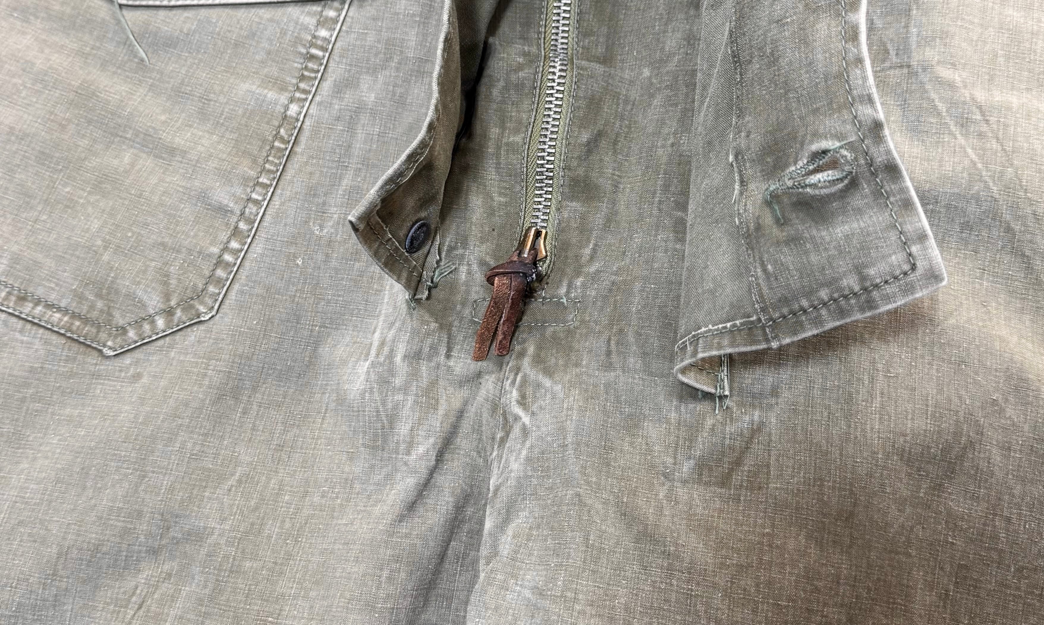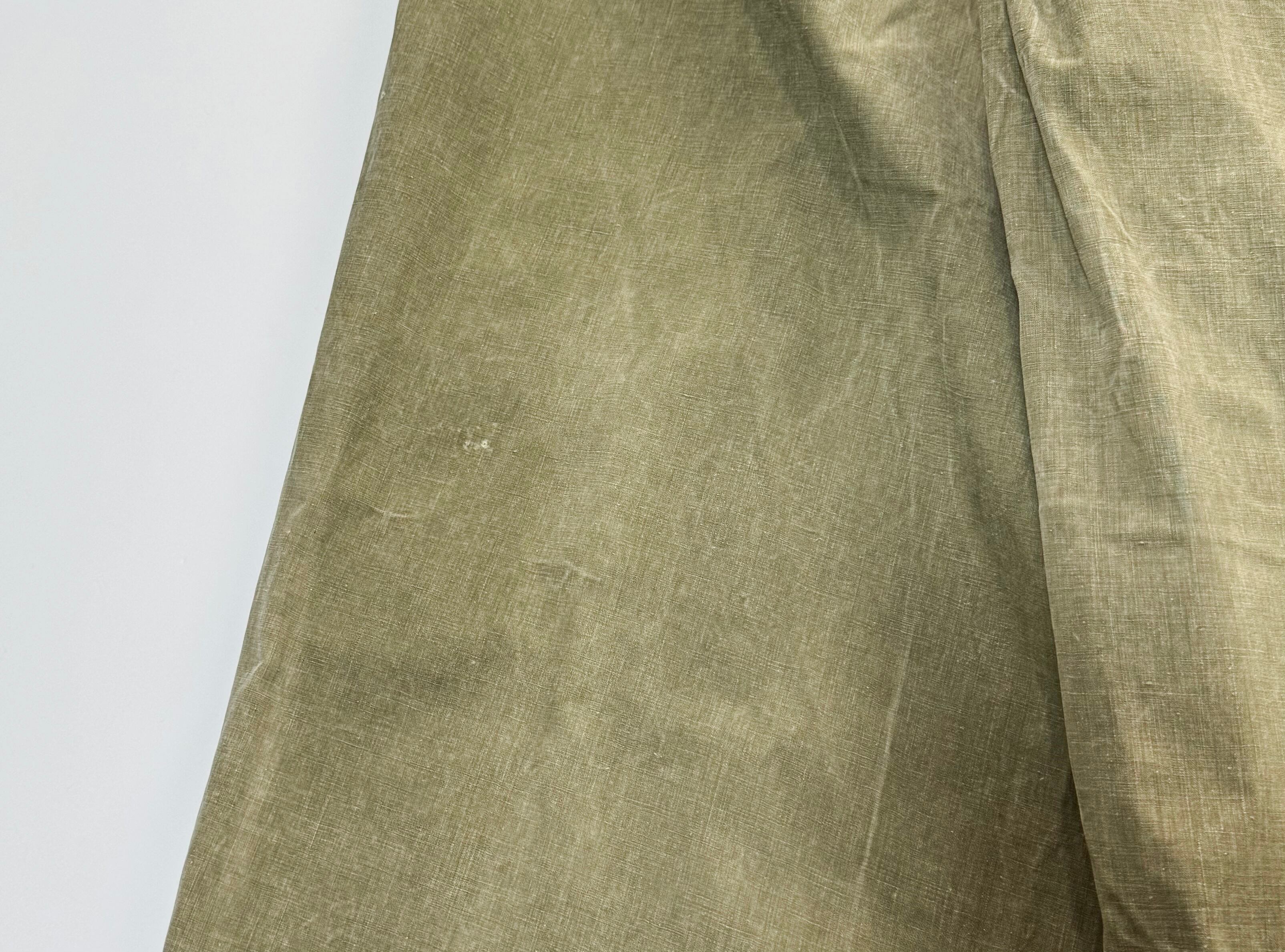 ゴム引きコットン特有のフェード、色ムラ、アタリが全体にあり、40年代オリジナルならではの経年変化が感じられる状態です。