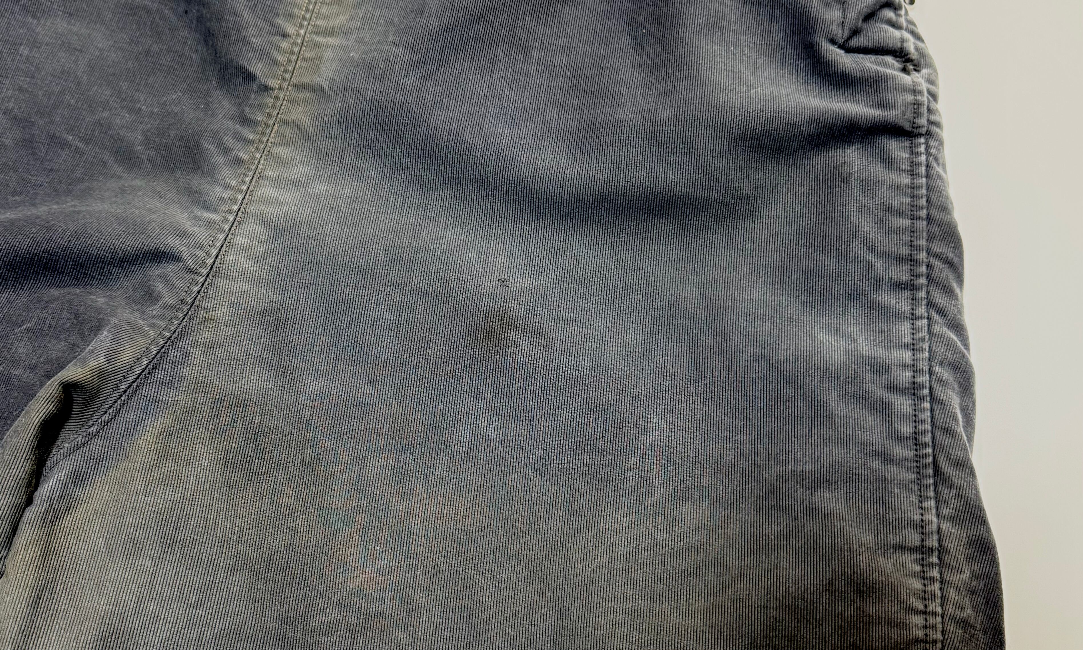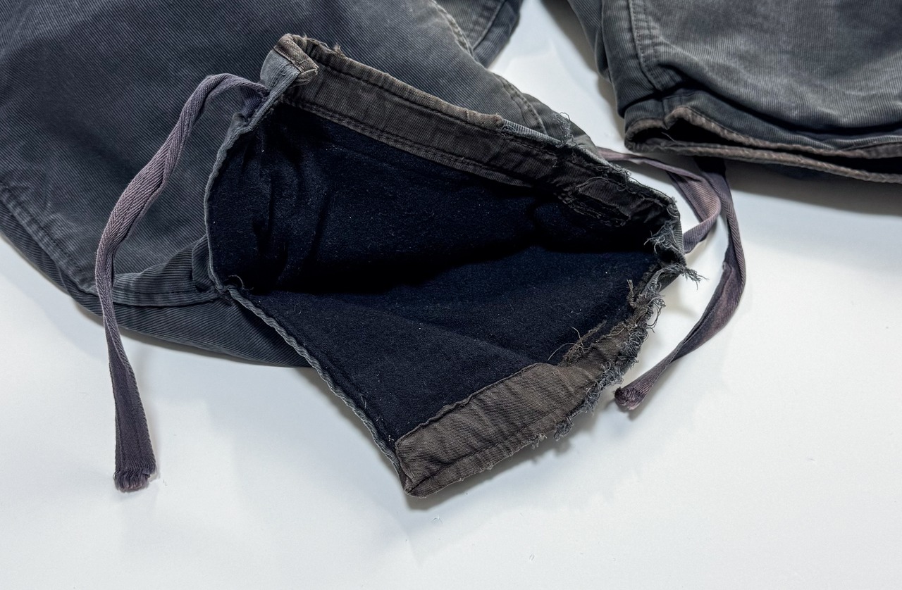 また、裾部分には破れやダメージがあり、ドローコード周辺にも生地の劣化が確認できます。