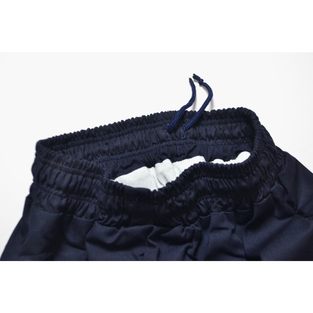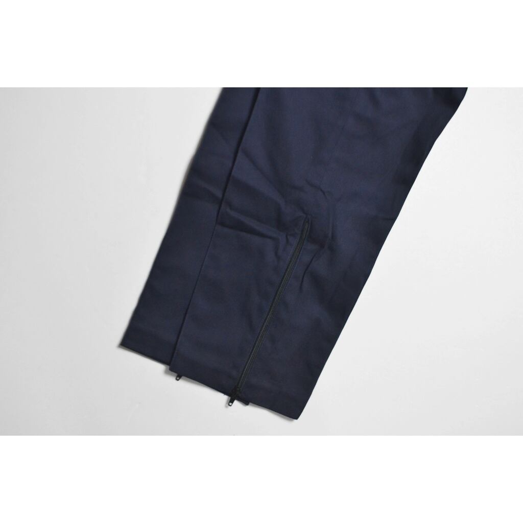 ウエスト周りは紐・ゴムが入っているイージーパンツ仕様ですが、センタープレスに沿ったコバステッチとダークネイビーのカラーリングは様々な雰囲気で着用可能かと思います。
