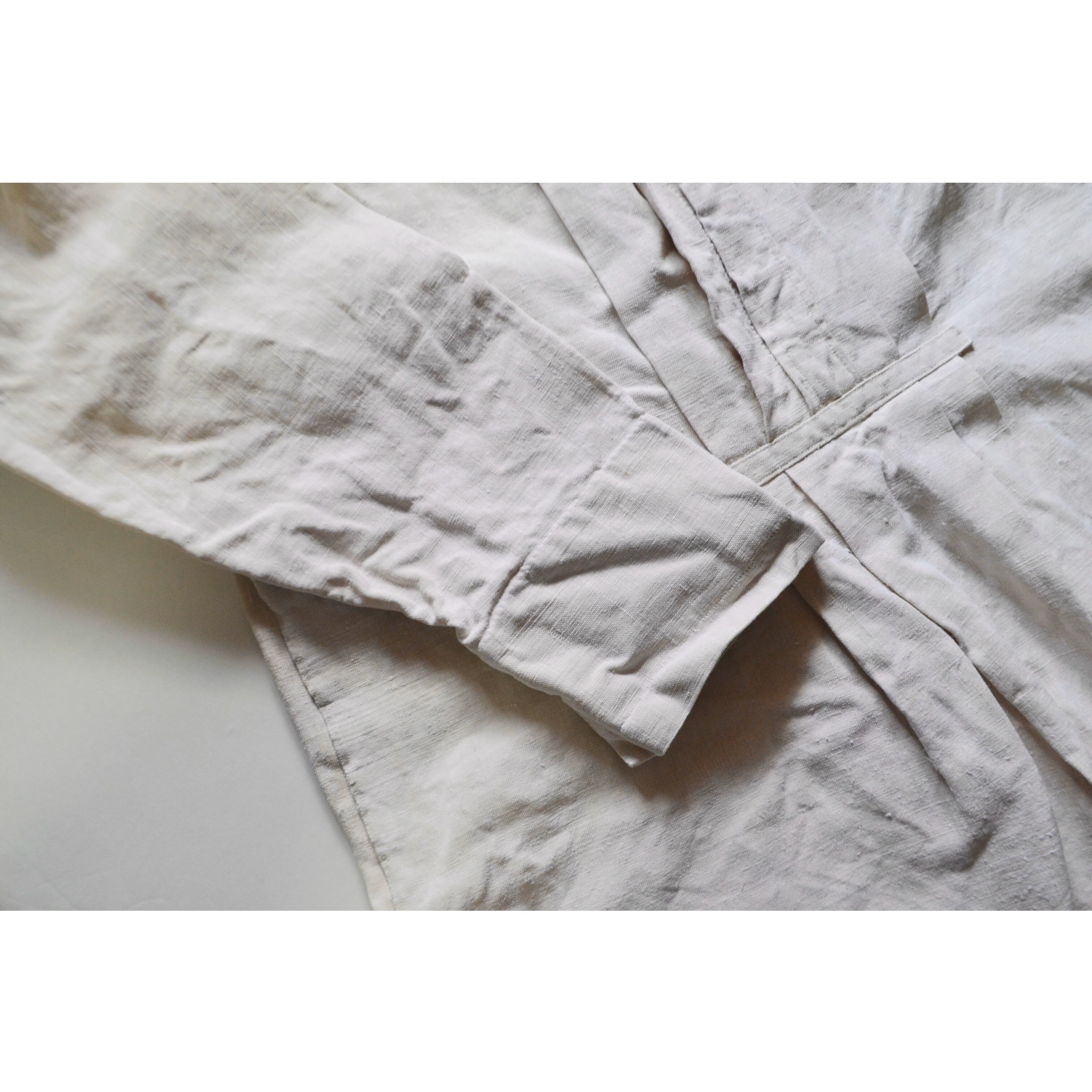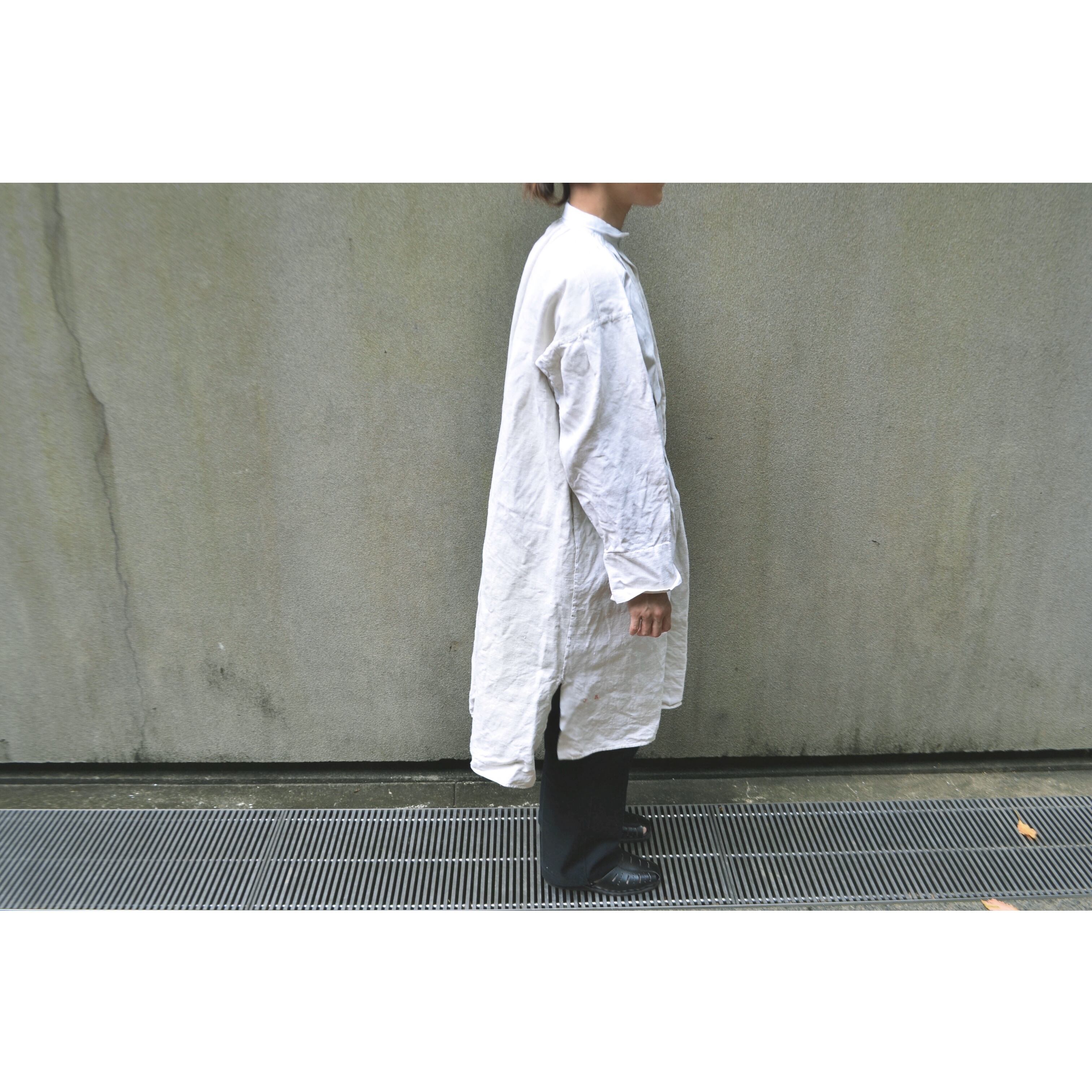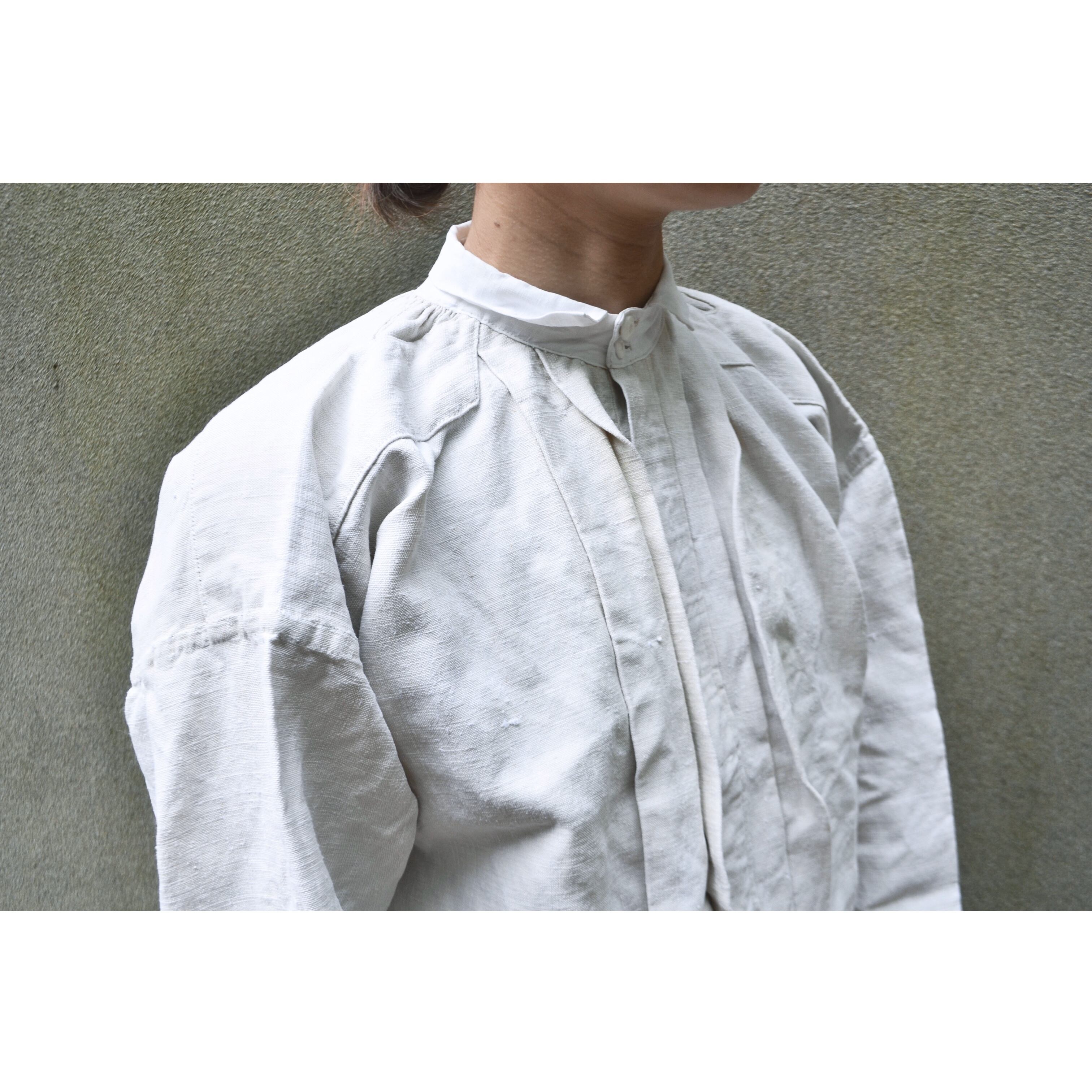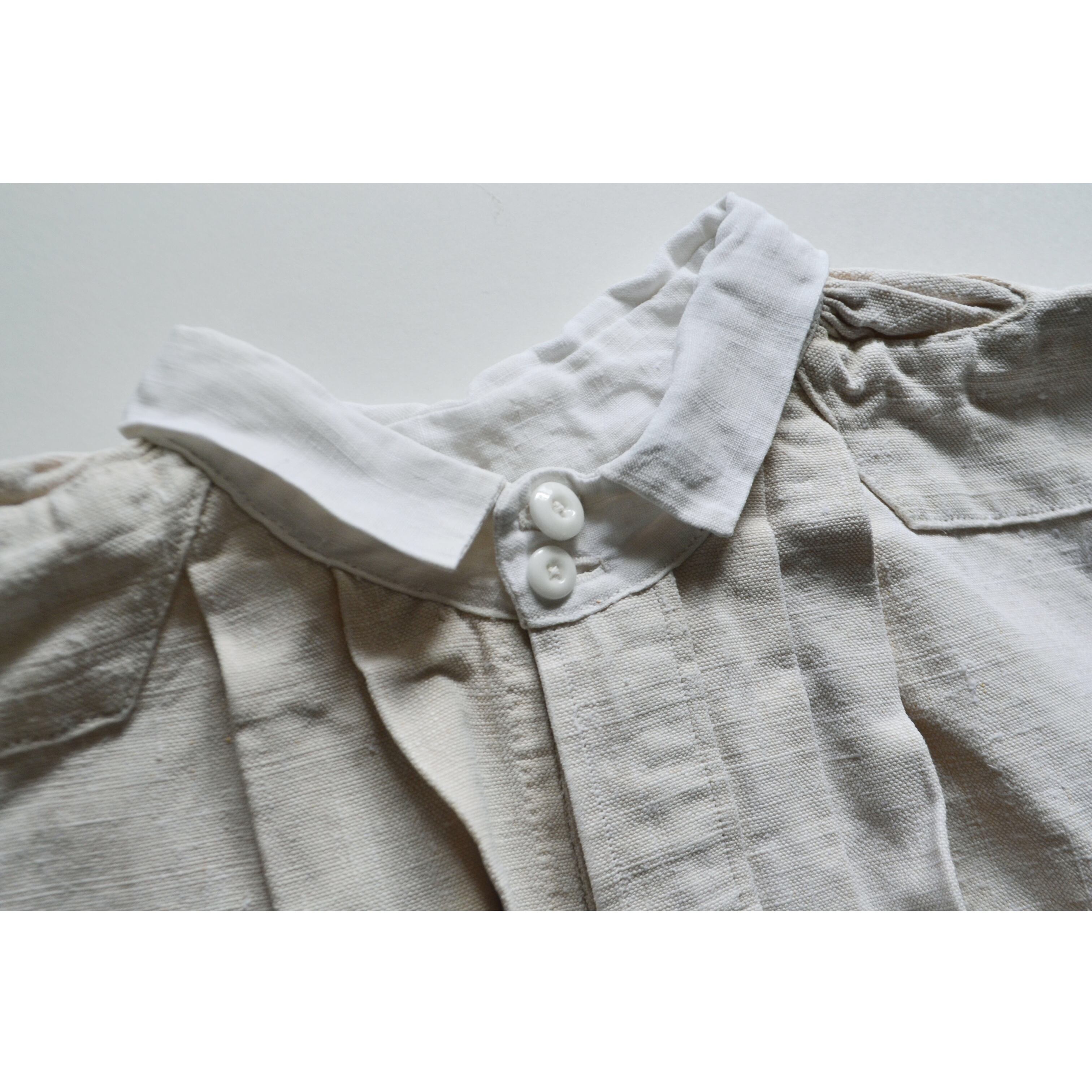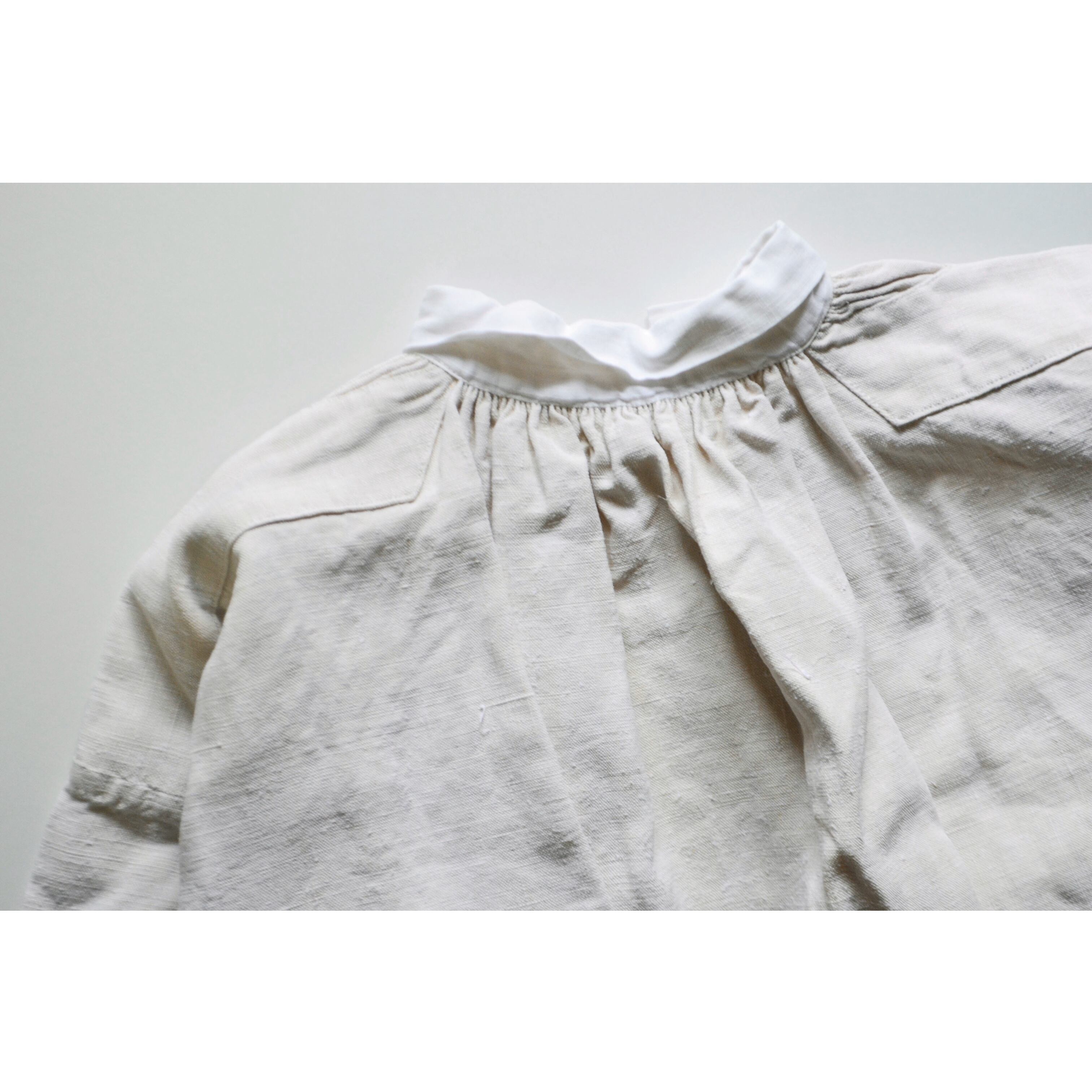 胸元や首まわりにはギャザーが施されており、リネンの揺れ具合などもあいまって、女性らしい雰囲気のある一着です。