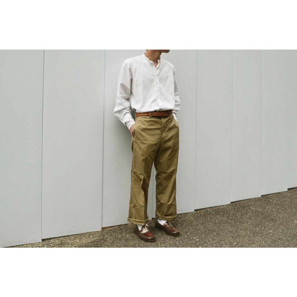 代表的なミリタリーチノと云えばフランス軍のM52、アメリカ軍のM45を思い浮かべますが、共通しているのは、どちらも股上が深く、ストンと落ちるワイドなシルエットということ。