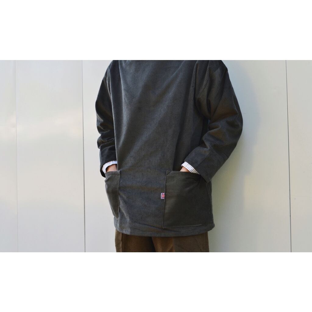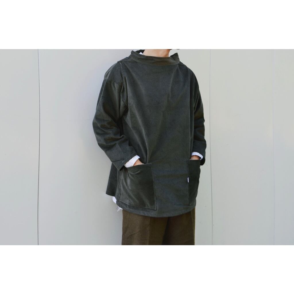昔ながらのイギリスのスモックの形を継承したそラウンドネックに、ゆったりとしたボックスシルエット。袖はやや短めの9分丈です。