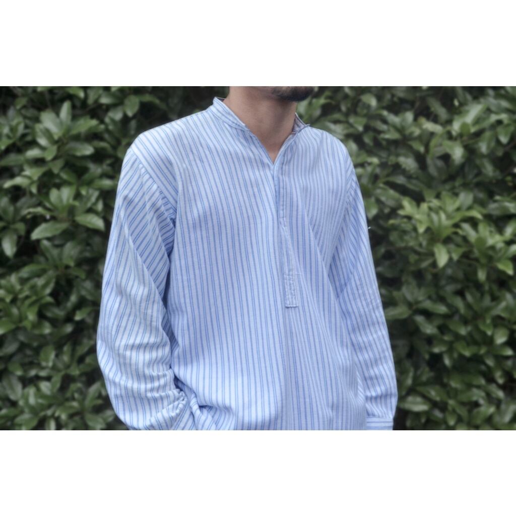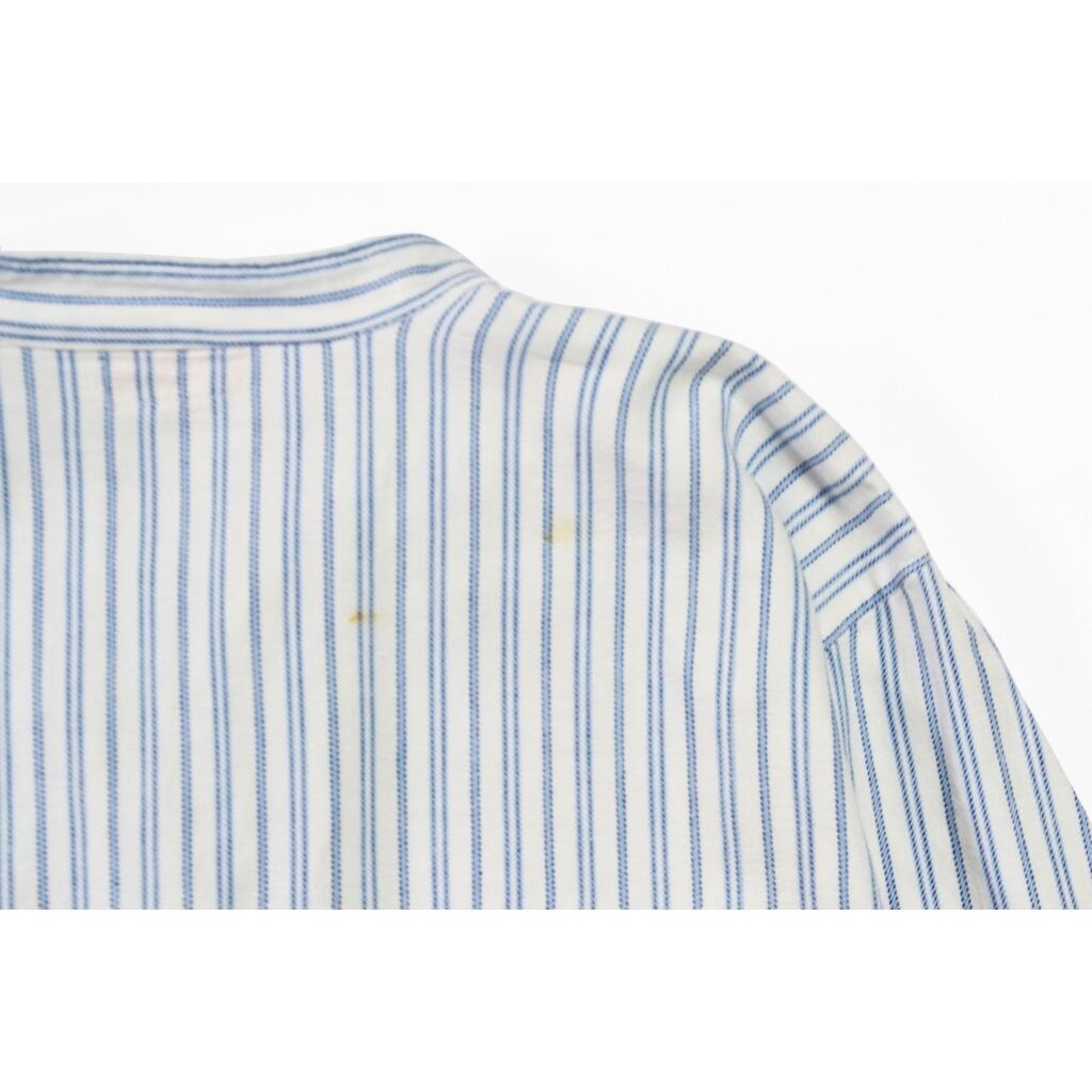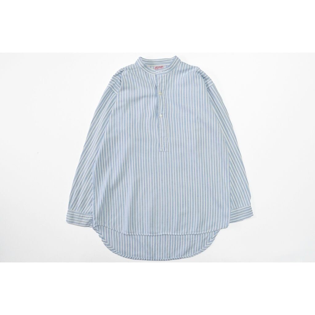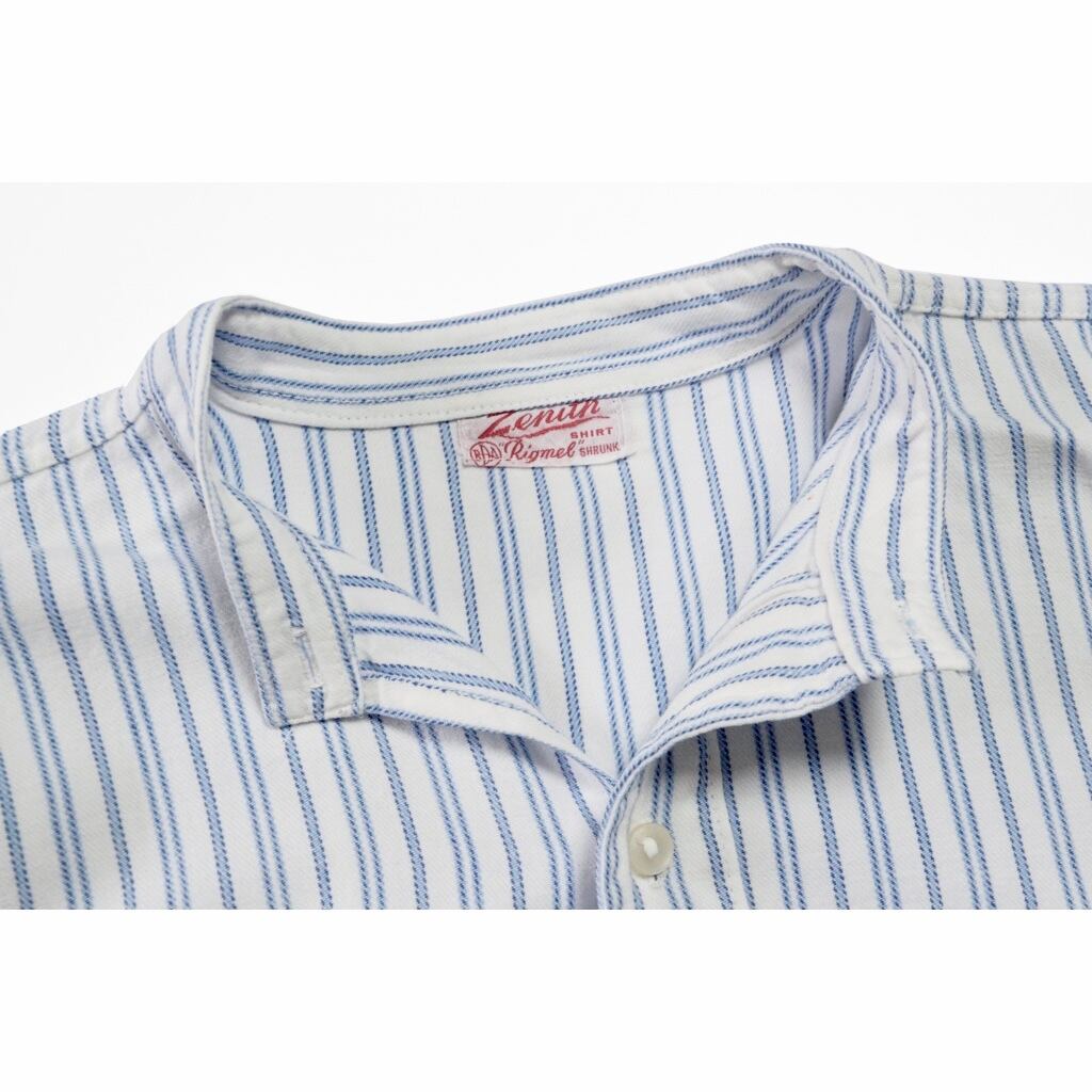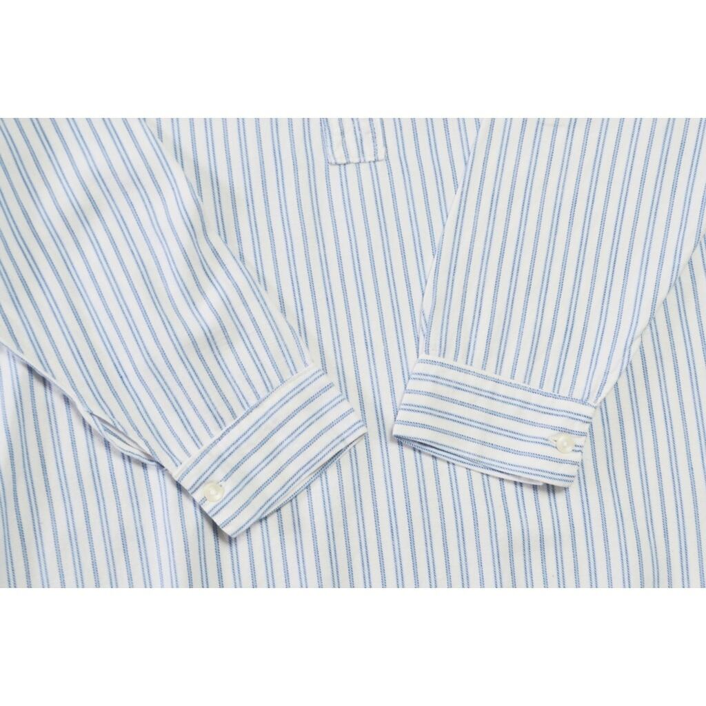 ホワイトとブルーベースのストライプのグランパシャツ。清涼感があり、春から夏にかけて活躍してくれそうです。
