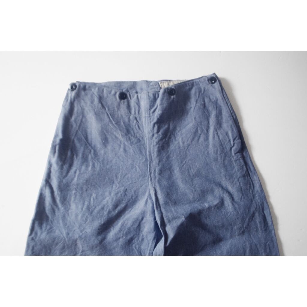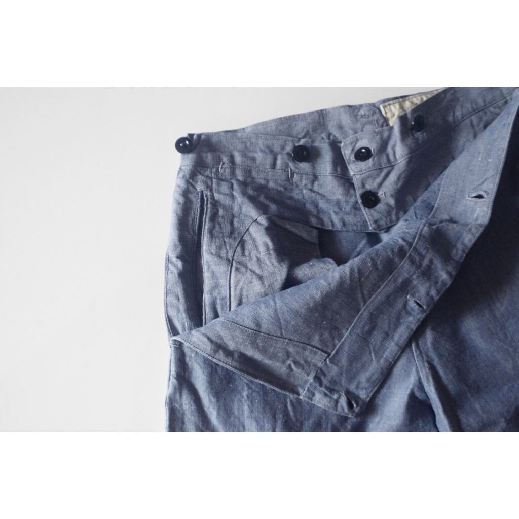 フロントはボタン留めで大きく開くセーラーパンツ特有の仕様。左右のポケットにウオッチポケット、ウエストにベルトループがついています。