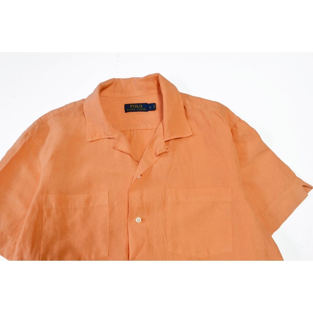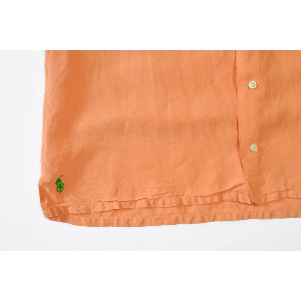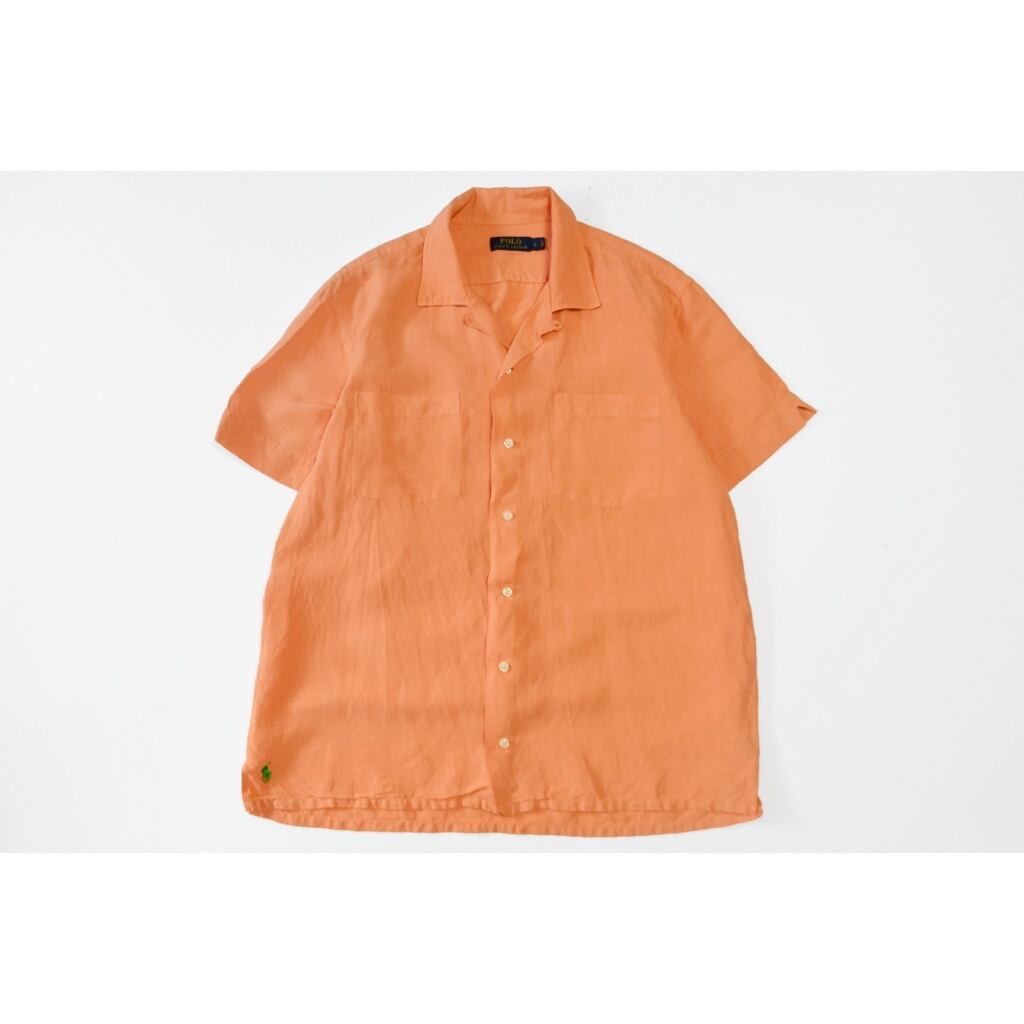 ラルフローレンの人気の無地オープンカラー。両胸ポケット、サイドスリット入りでボックスシルエット。裾にオレンジのロゴ刺繍入り。夏にぴったりの肌触りが良いシルク×リネン素材。色味はオレンジです。