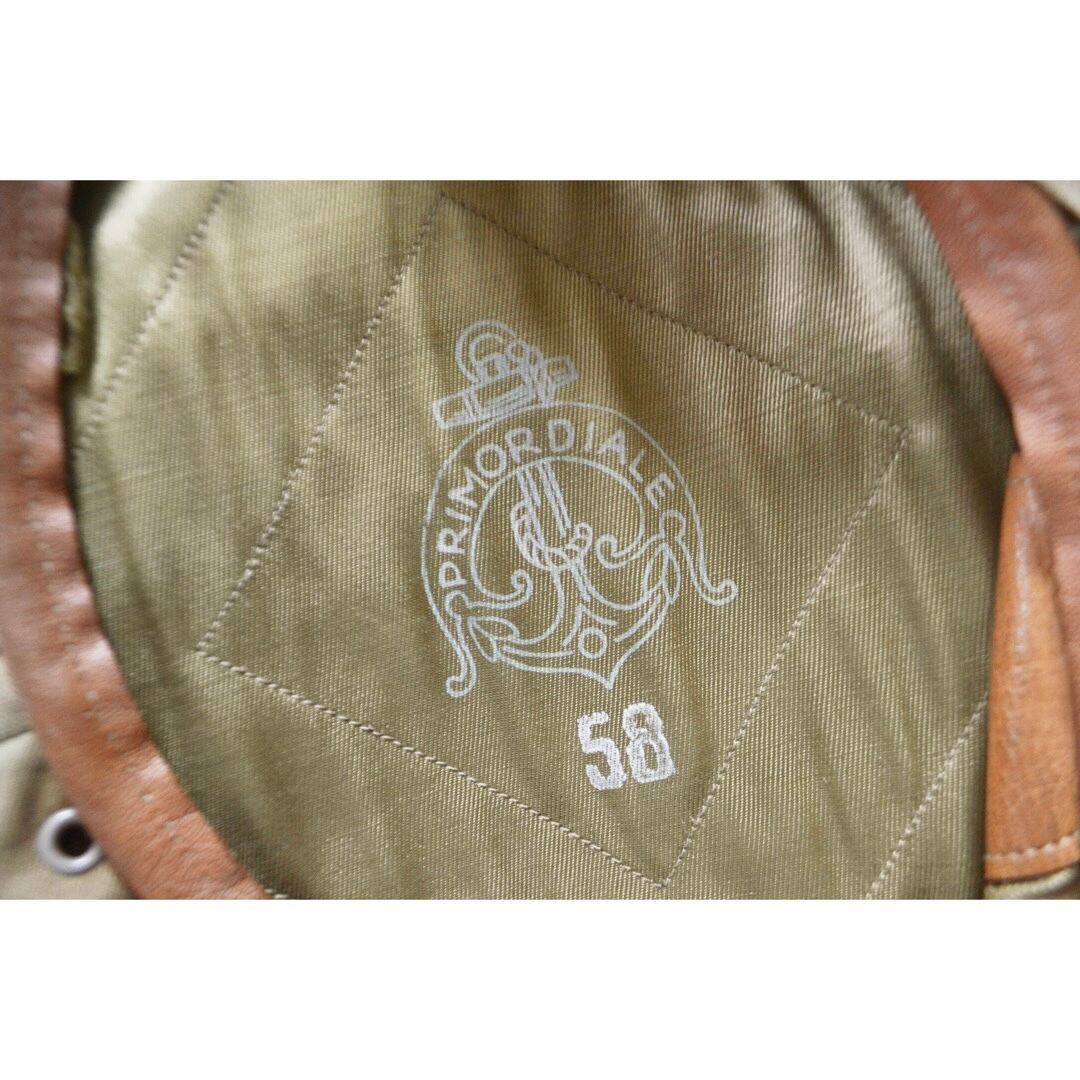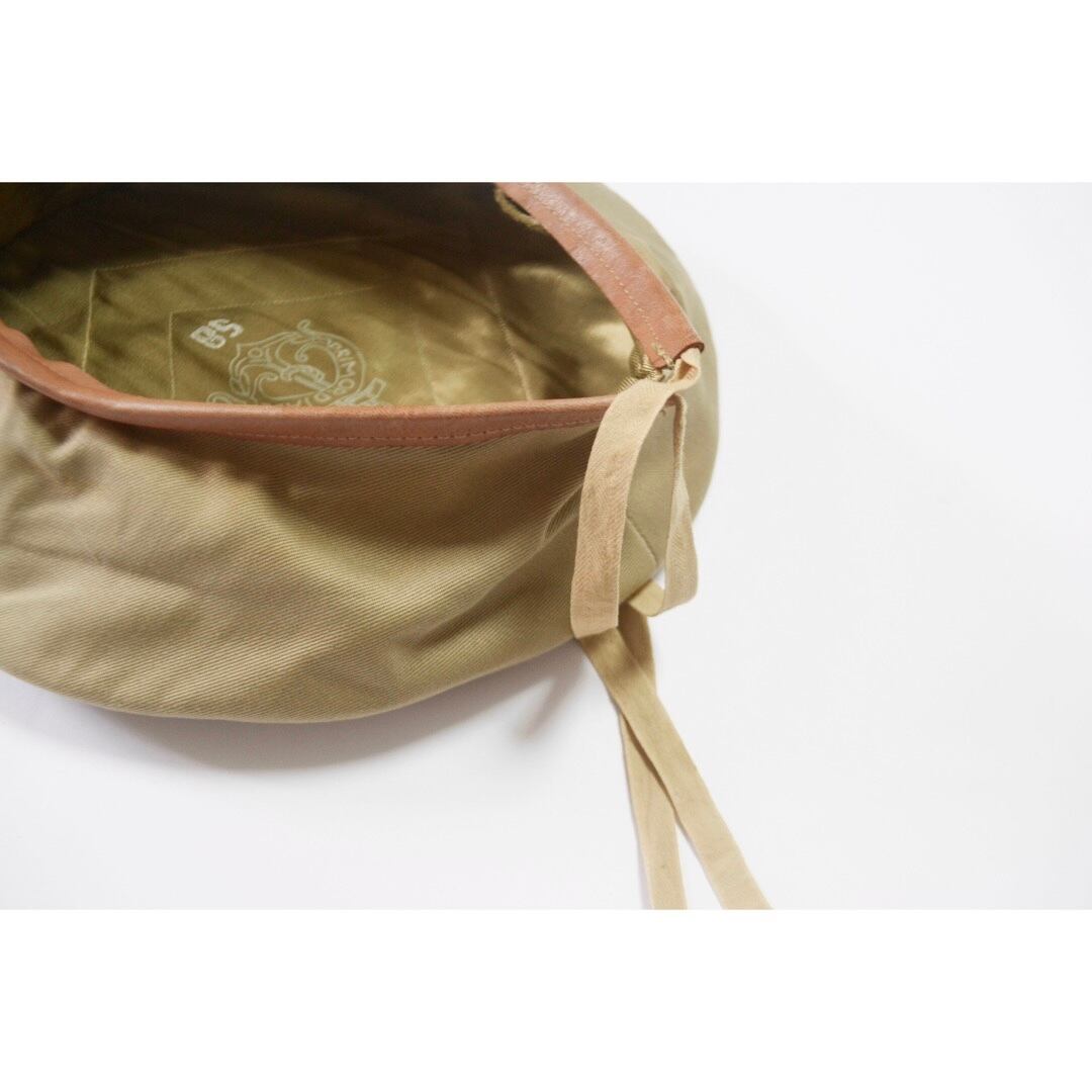コットンツイルにタンレザーのパイピング。インナーにはキルティングサテン生地を用いております。レザーパイピング内部の絞りヒモでサイズ微調用が可能。