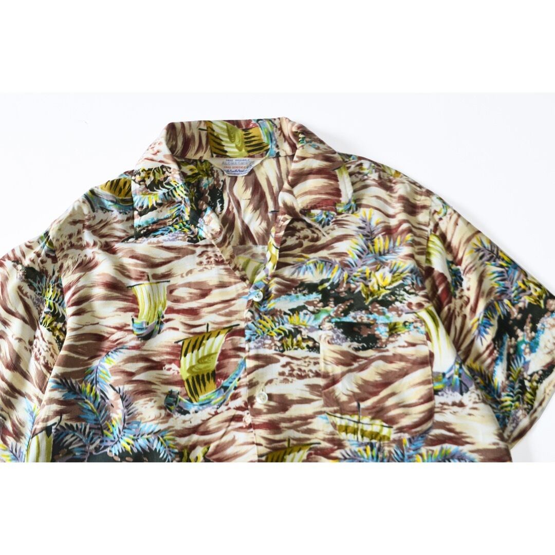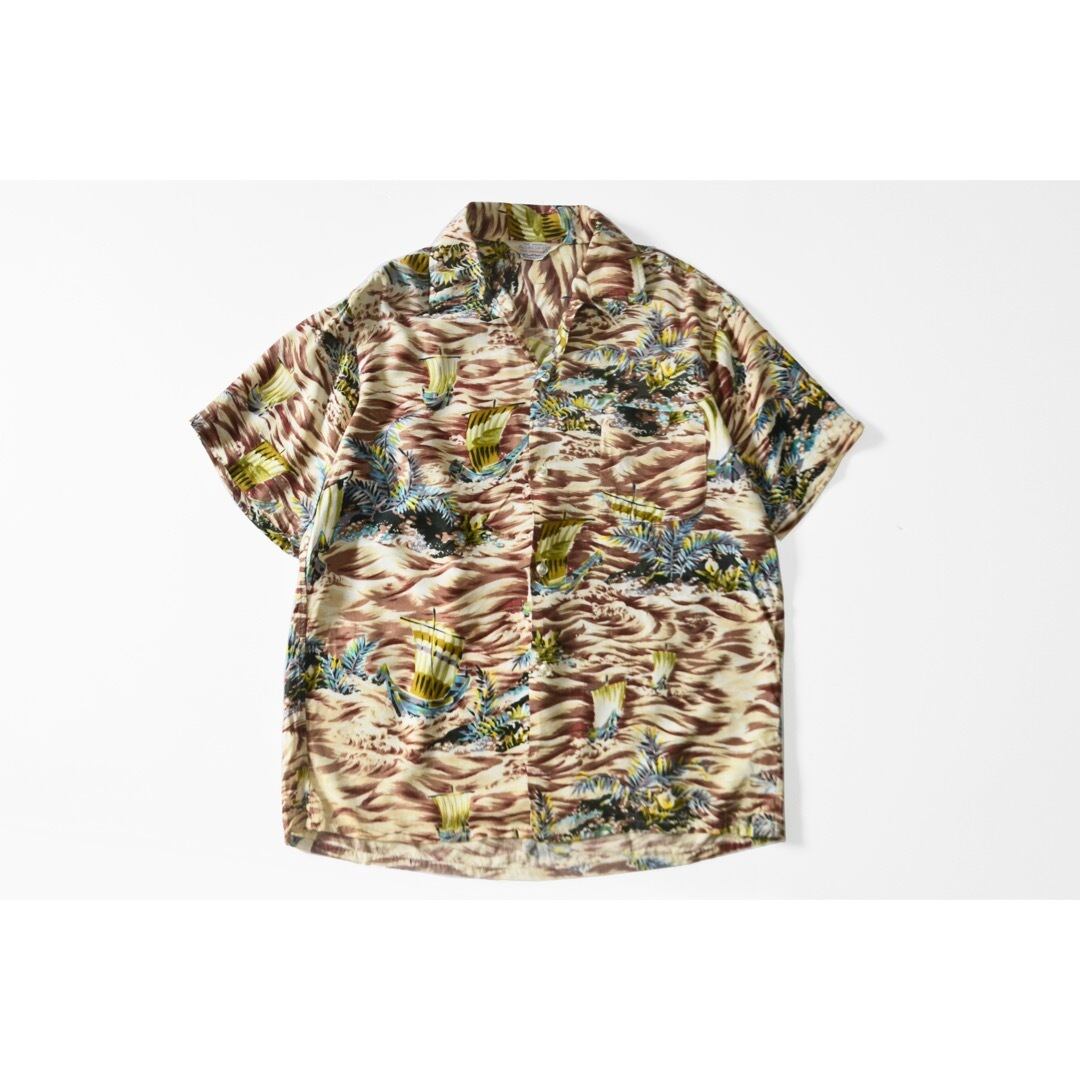 ブラウンベースで、荒々しく波や船がプリントされた雰囲気のある柄になります。