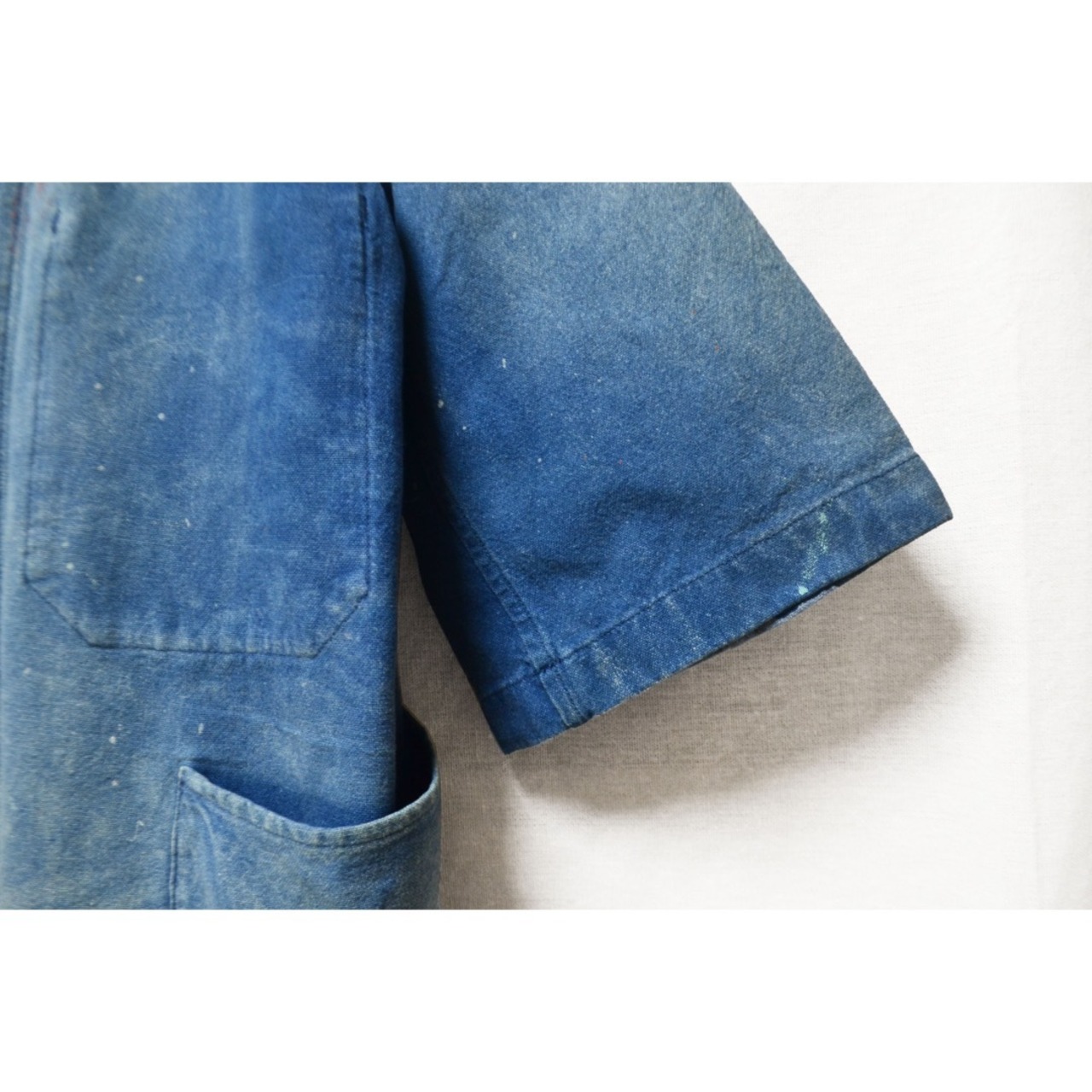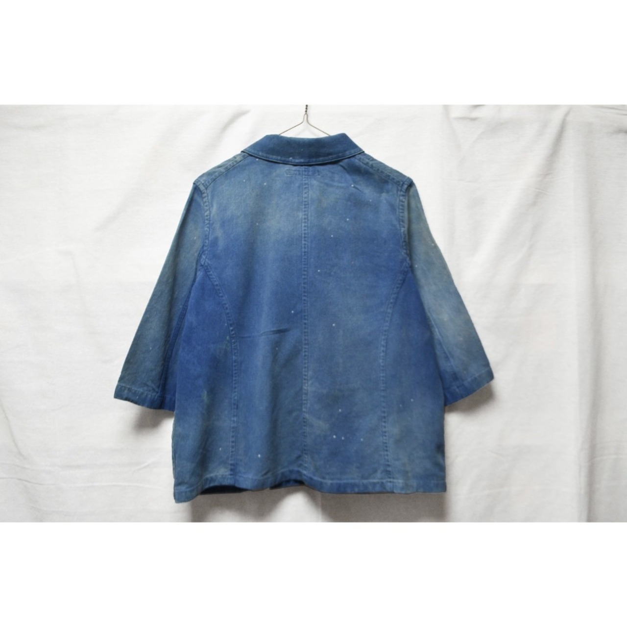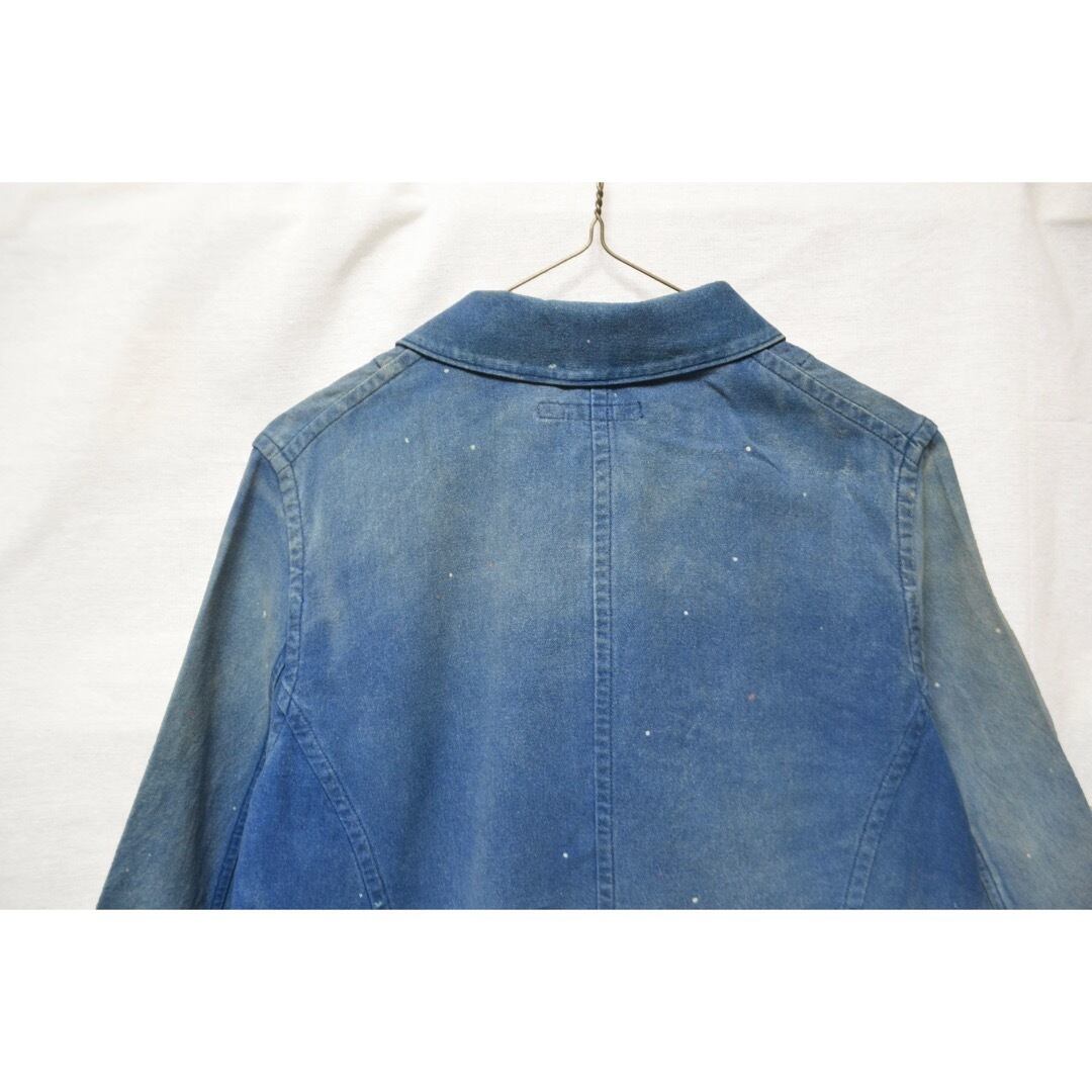 袖はハーフスリーブ程度の設計で、ダブルブレスト仕様。古いワークジャケットに見られるフェードしたフレンチブルーの色味を忠実に再現し、ペンキ加工等が加わったラルフローレンの技術の高さが伺える一着。