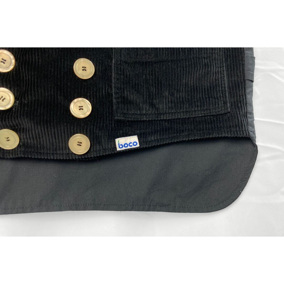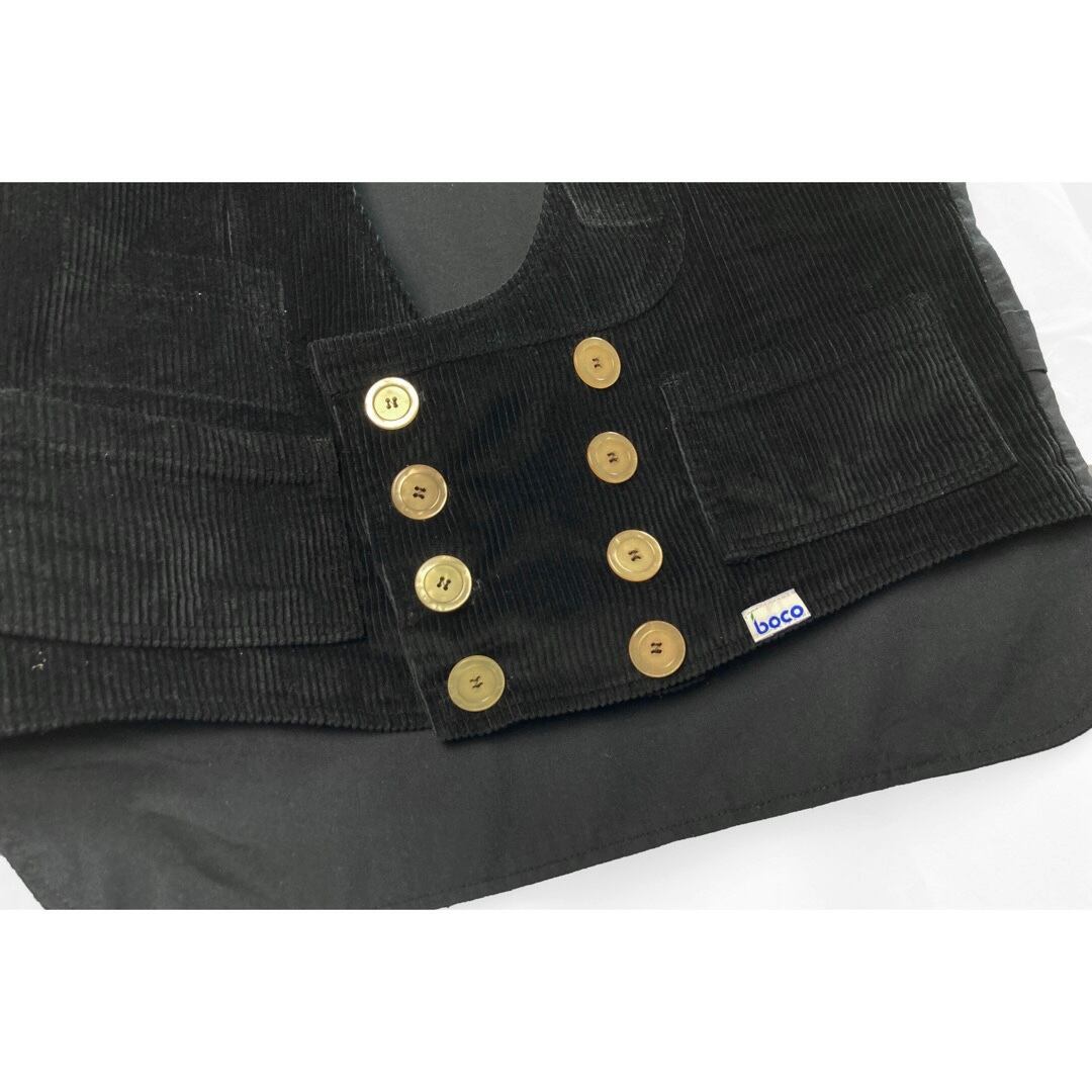 ブラックのコーデュロイ地に、大きめのシェルボタンでダブルブレスト仕様、U字よりの深めの前開きなんかも特徴ありますね。