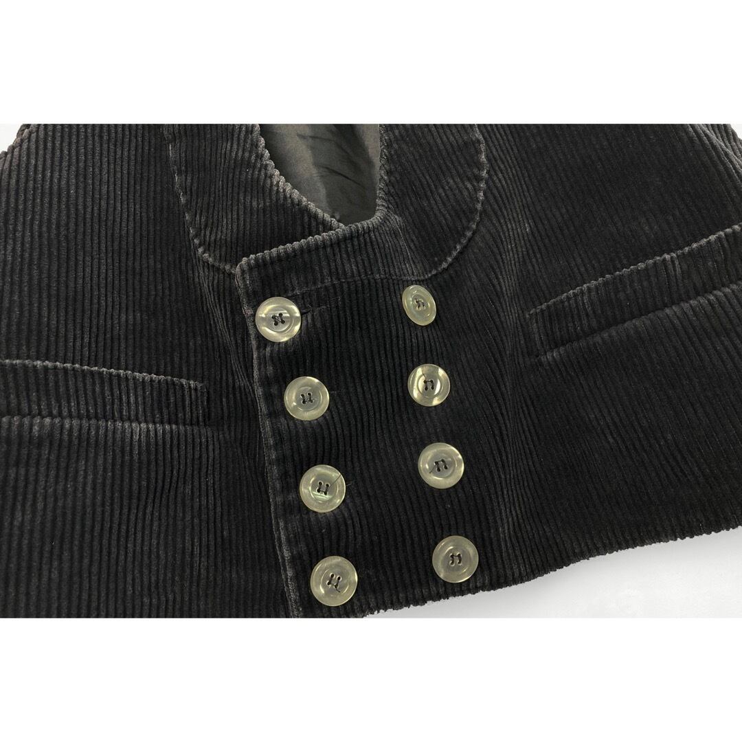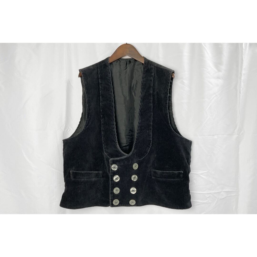 太畝ブラックのコーデュロイ地に、大きめのシェルボタンでダブルブレスト仕様、U字よりの深めの前開きなんかも特徴ありますね。