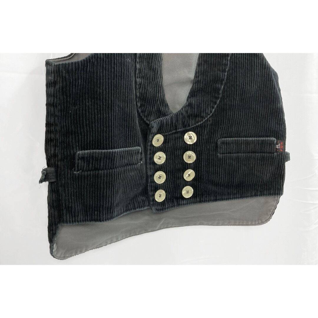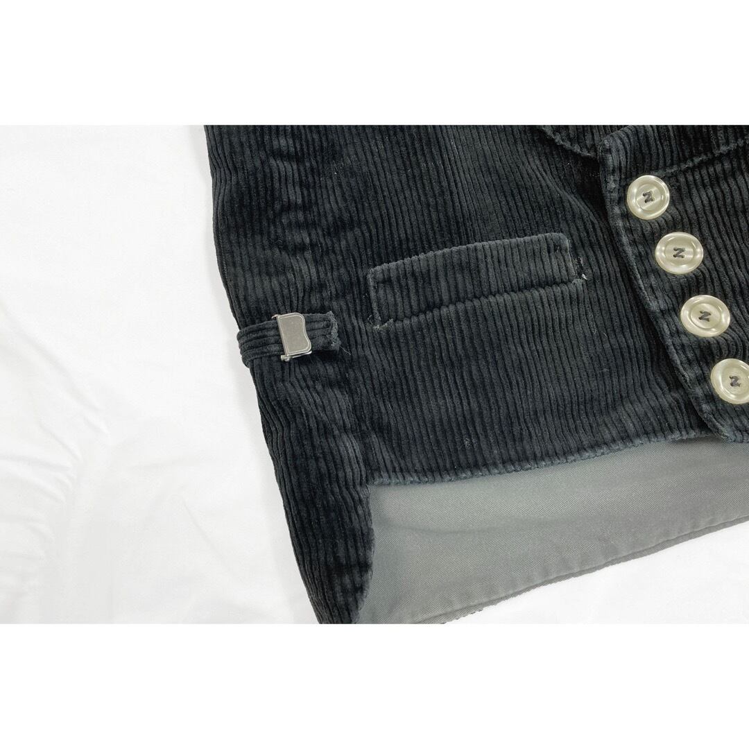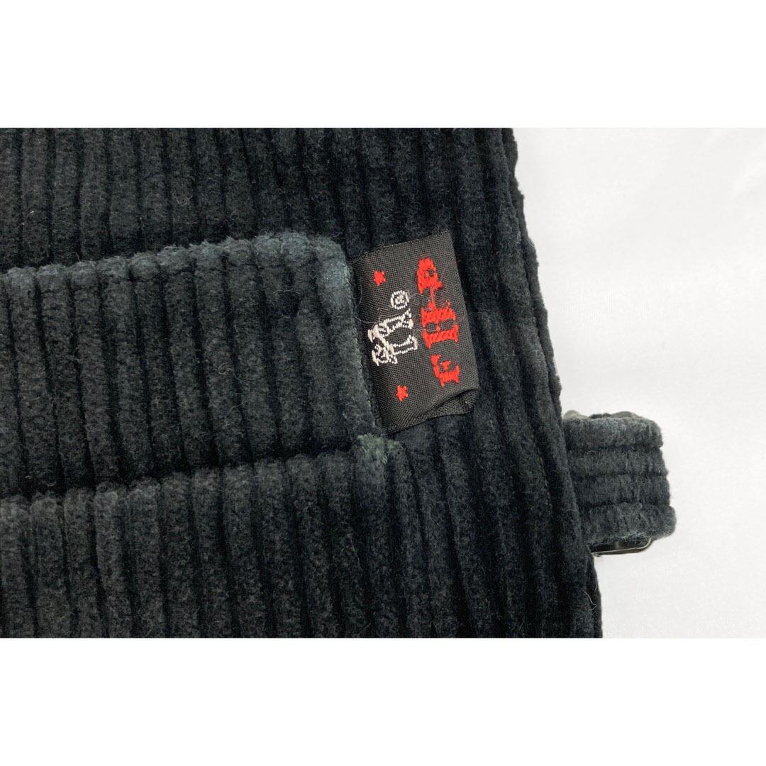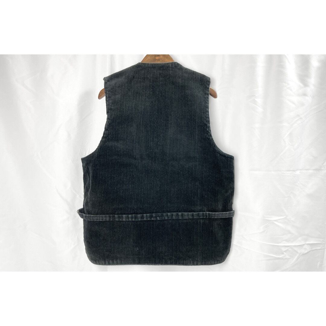 太畝ブラックのコーデュロイ地に、大きめのシェルボタンでダブルブレスト仕様、U字よりの深めの前開きなんかも特徴ありますね。