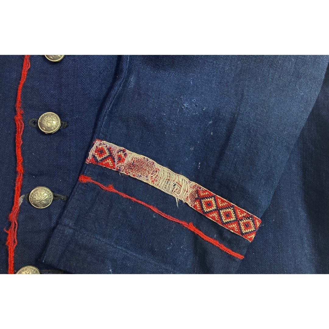 綺麗なカーブをした襟に、手刺繍のエンブレムパッチ、赤いコットンの細いトリム、縫い付けられた柄刺繍のリボンなども特徴的です。