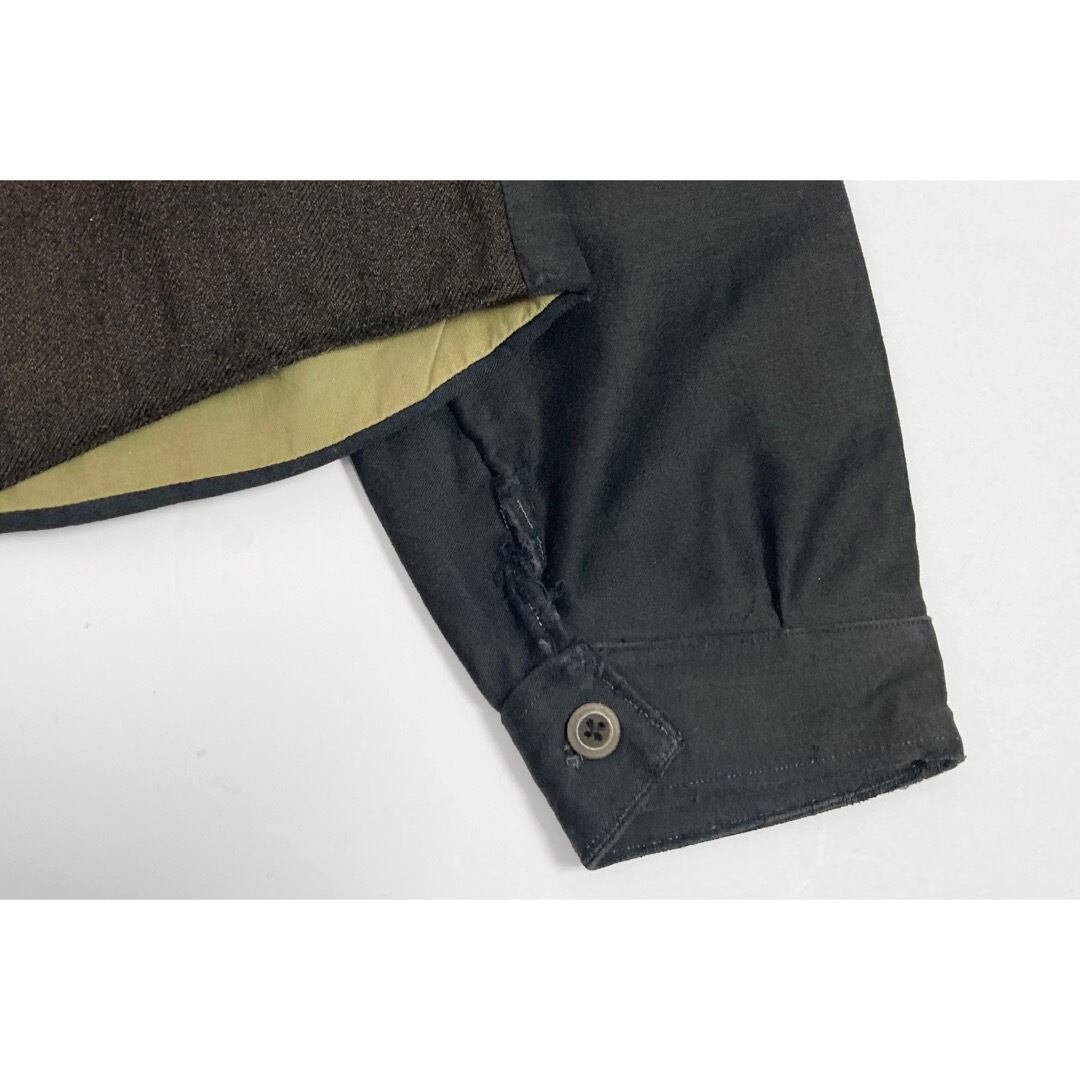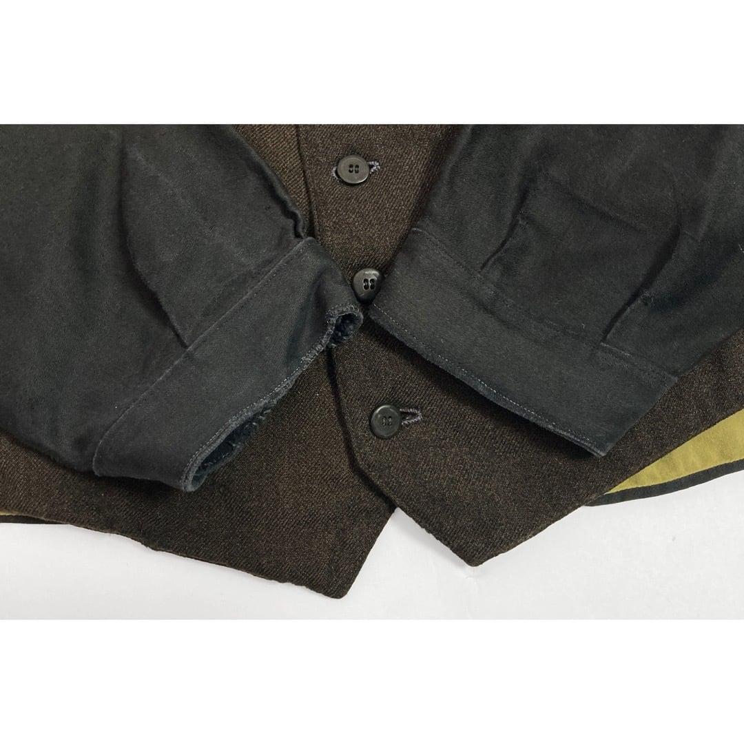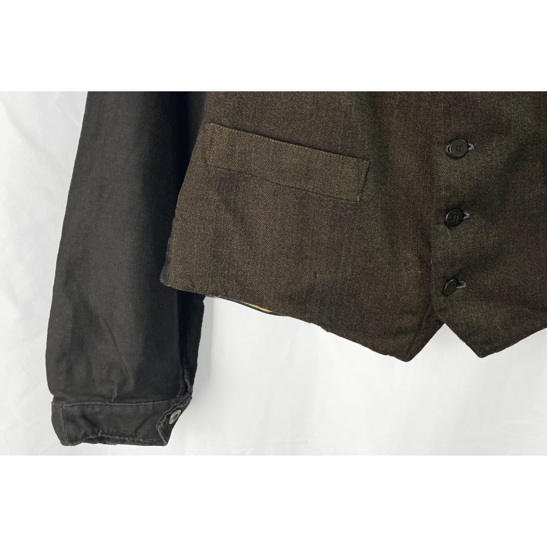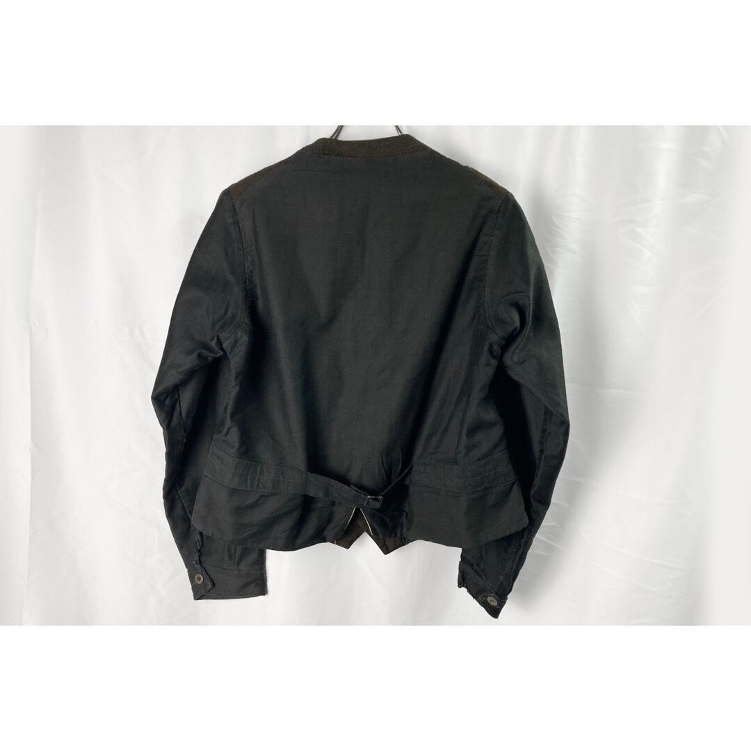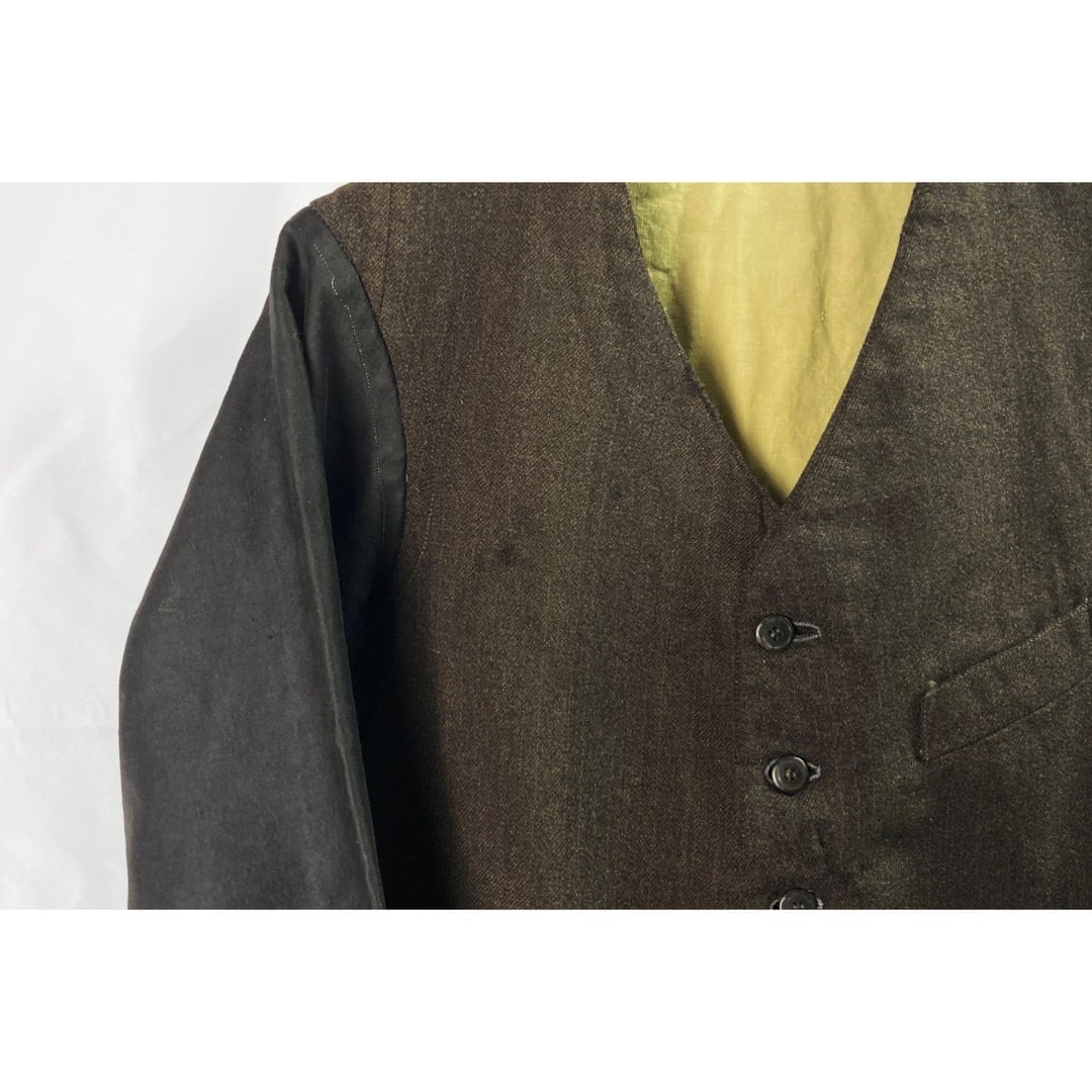 前見頃は薄いピンストライプの入る、ウールと恐らくリネンが棍棒されたブラウンの杢生地。背はブラック・コットンサテン。袖は素晴らしい質感のブラックモールスキン。