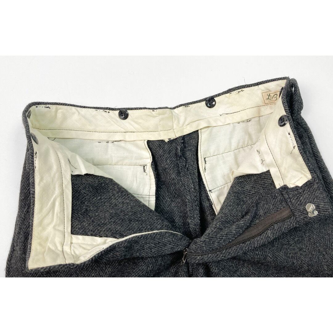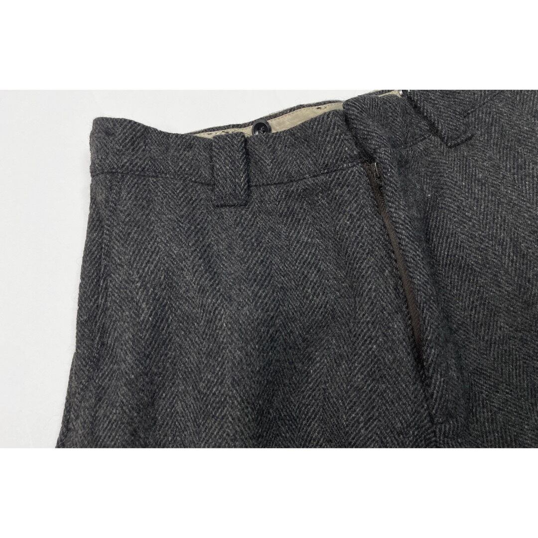 ヘリンボンウール生地で、チャコールグレーカラー。TALONジッパーにサスペンダー付き。