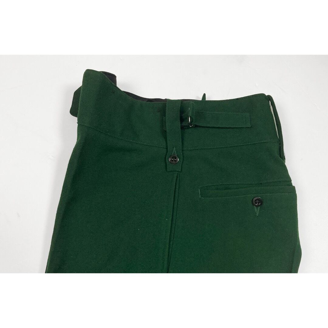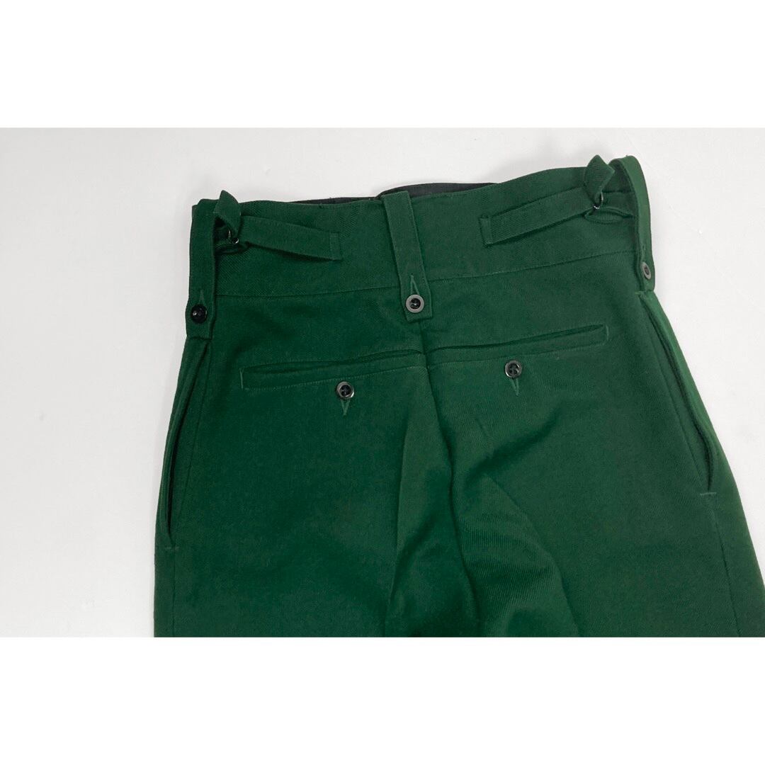 生地はしっかりとしたウール地で、ウエストはサイドアジャスターとボタン留めのベルトループが共存した作り。前立てはボタンフライ仕様。大きなウエストの持ち手も良いディテールです。