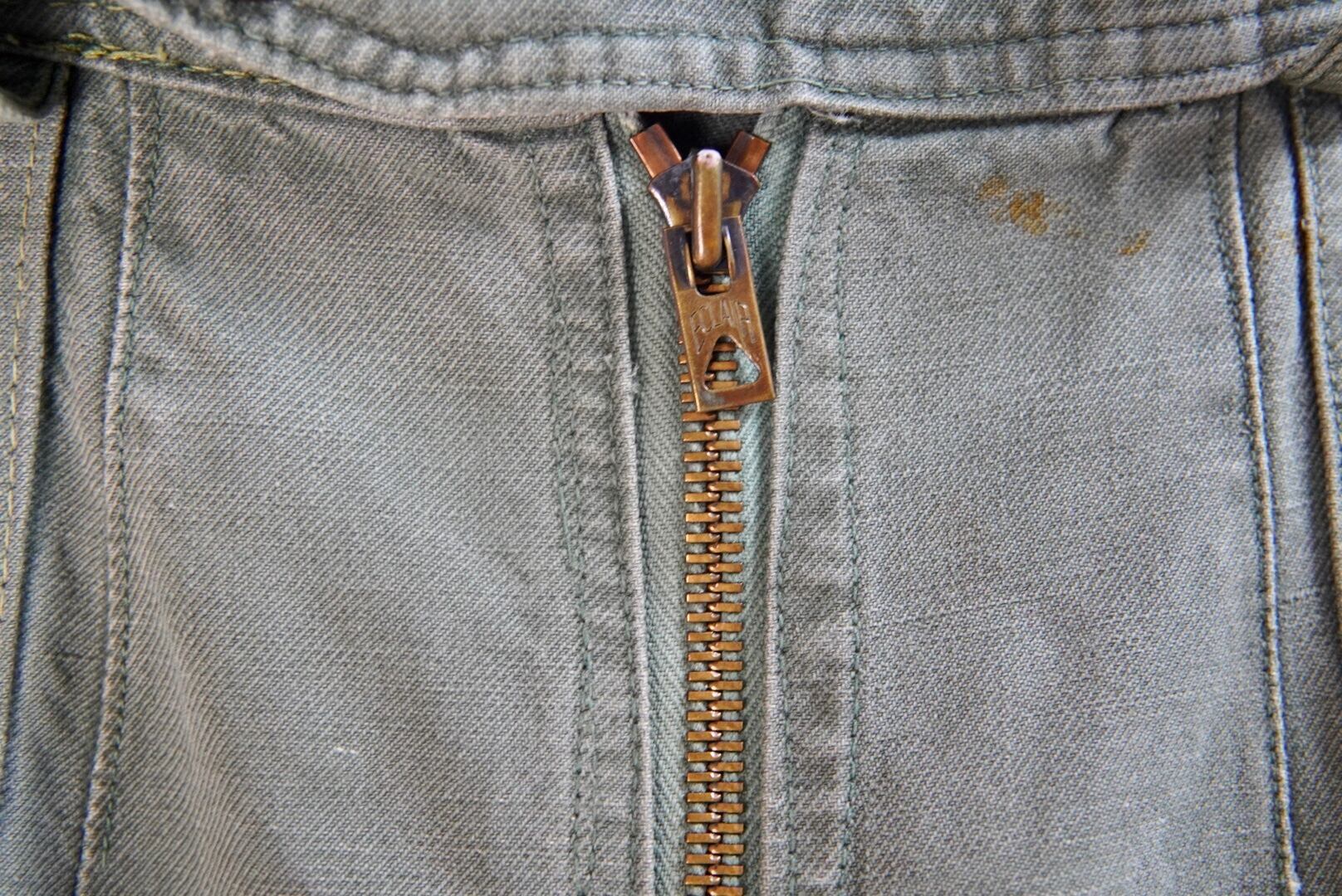 生地はオリーブのコットンツイル地。Wブラス製ECLAIRジッパー。裾にはストラップ付き。