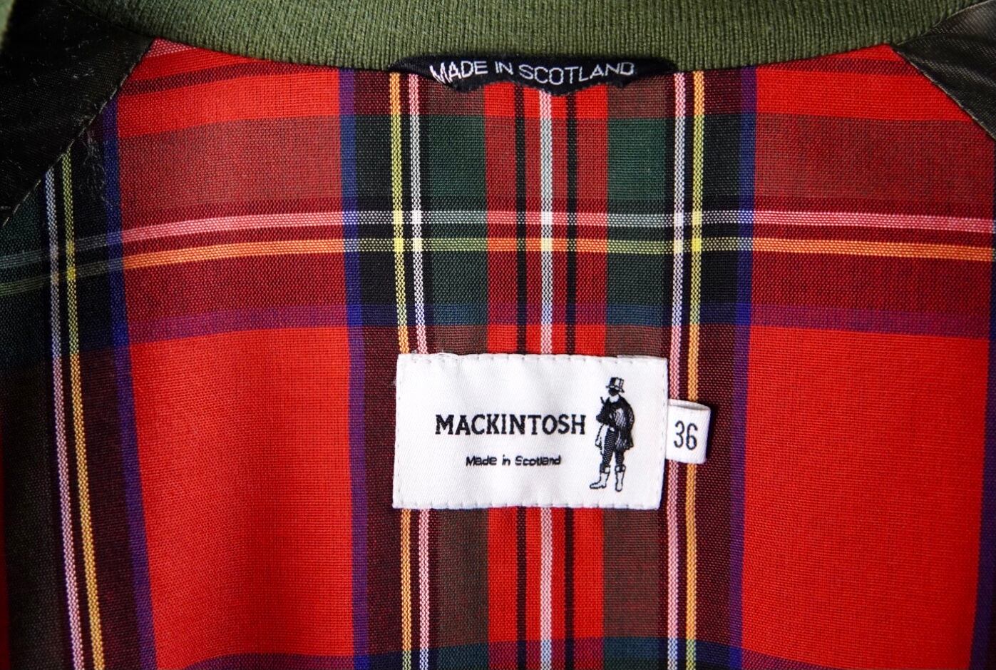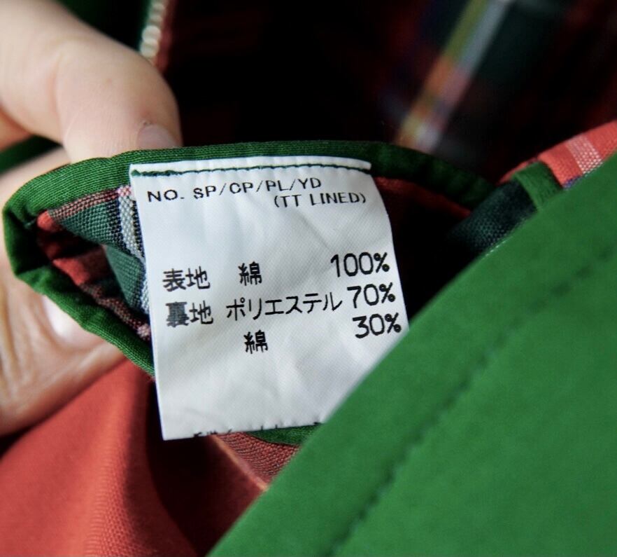 コットン素材の色鮮やかなグリーンカラー。裏地はレッドを基調としたチェック柄。