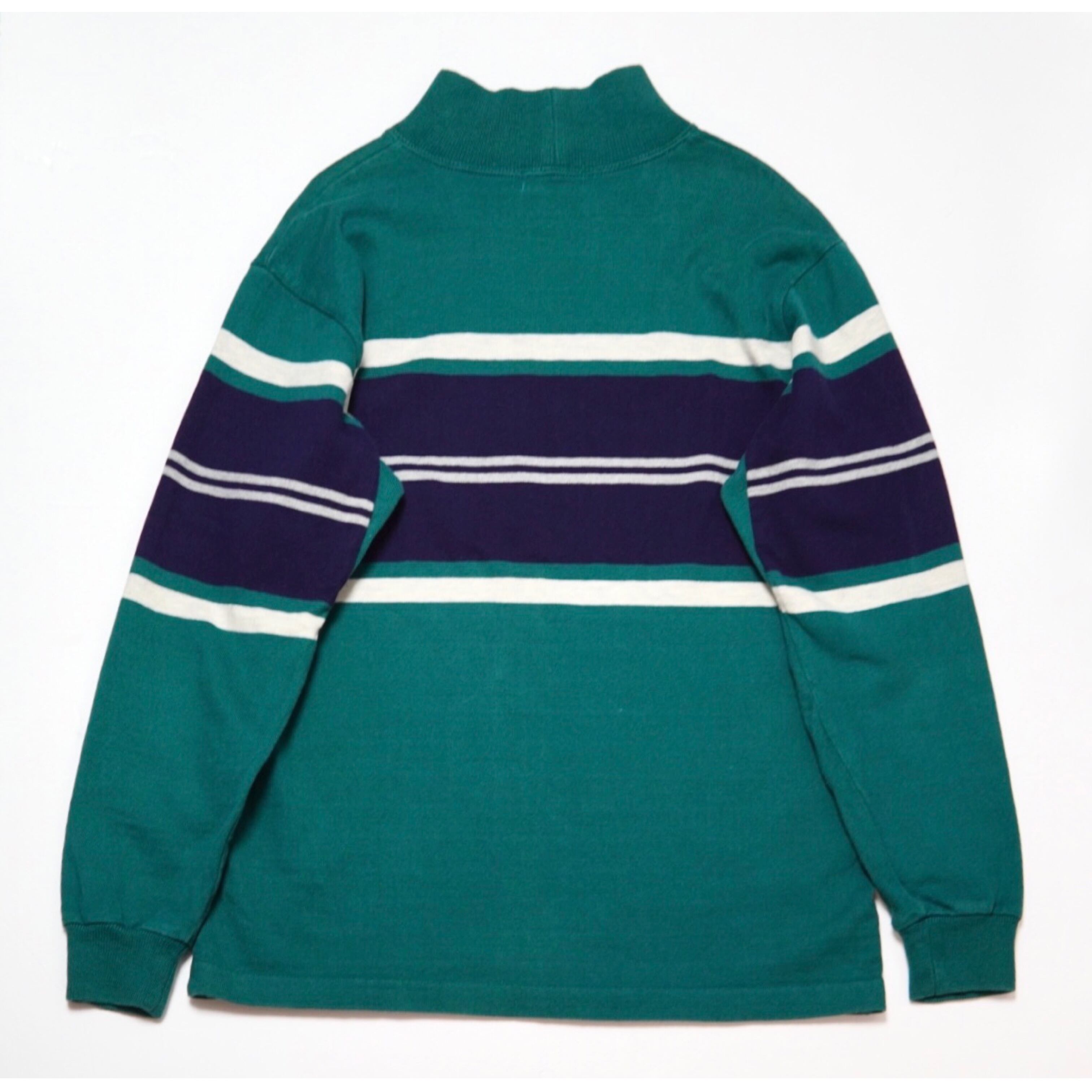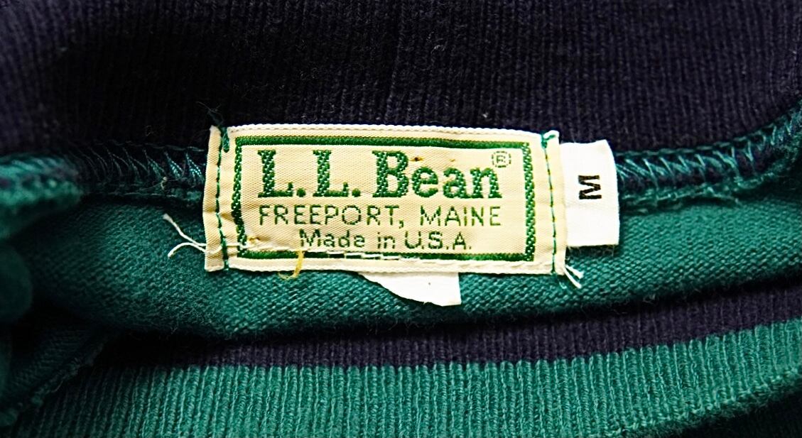 80年代 L.L. BEANのモックネックボーダーTシャツ。生地は厚手のコットンで、グリーン×ネイビー×グレーの高配色。